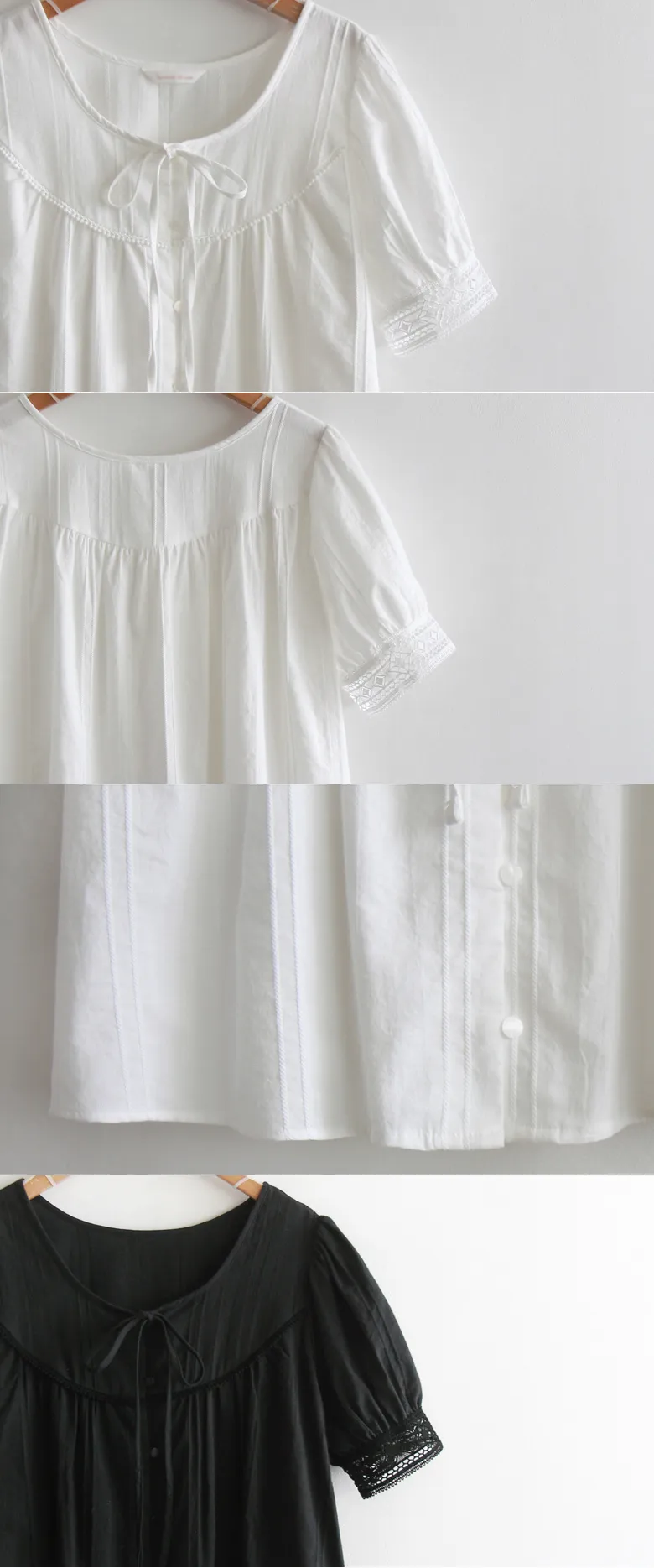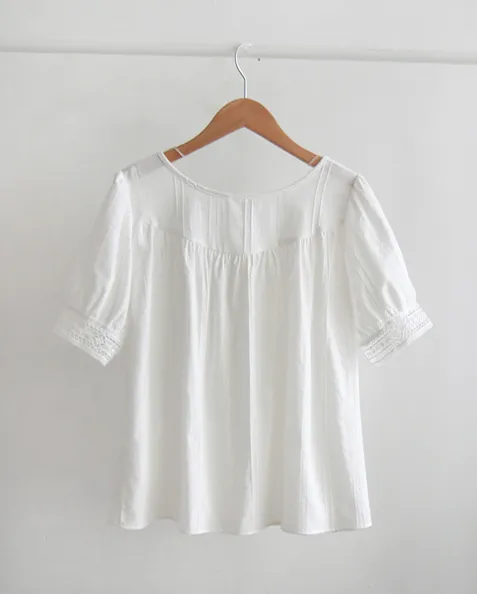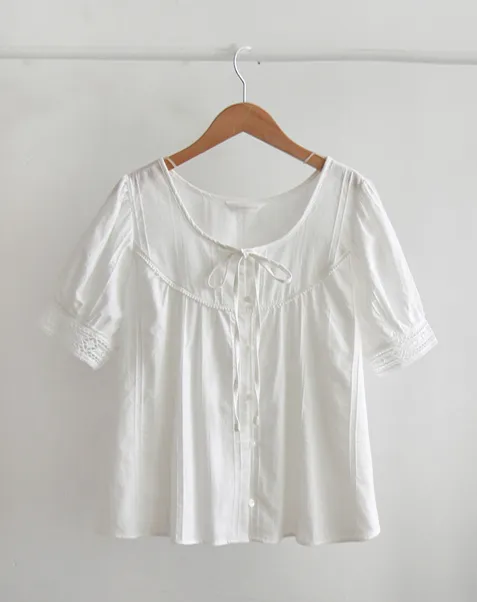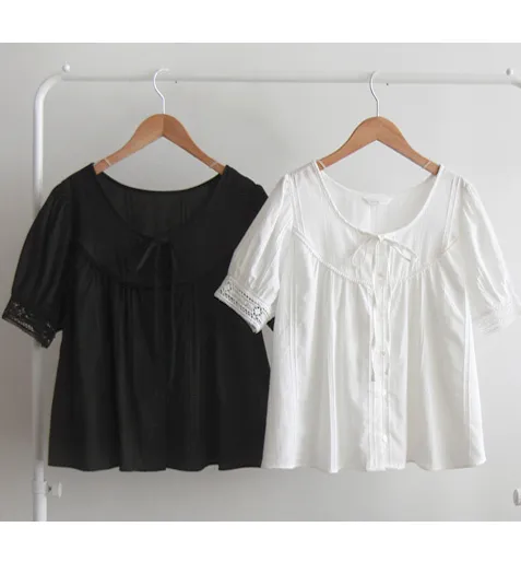 【細膩的純色線條圖案,展現季節感】 【繫上綁帶蝴蝶結,營造出可愛的氛圍】 【袖口的蕾絲,充滿浪漫氣息的優雅夏日上衣】 【推薦可提升夏日日常風格的上衣】