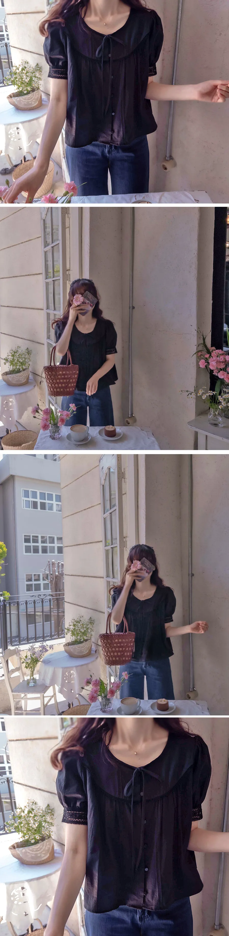 優雅領口綁帶袖末蕾絲細膩線條排扣上衣