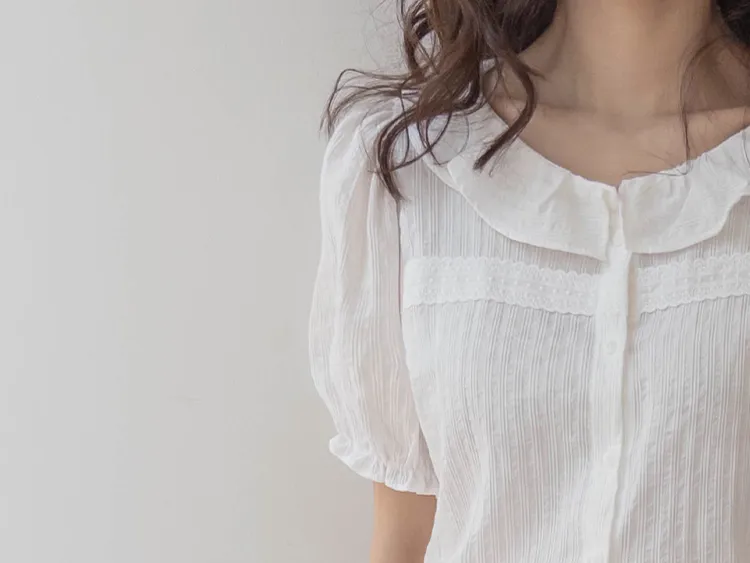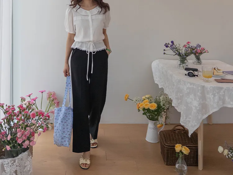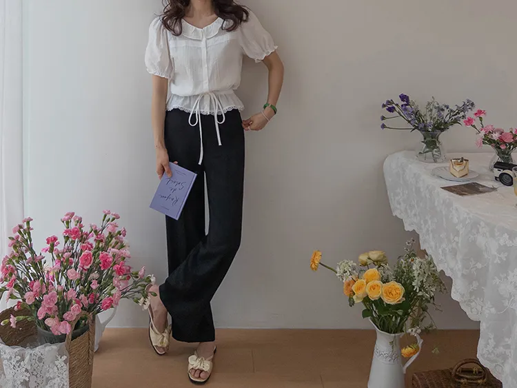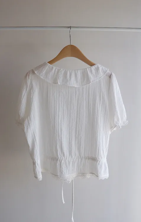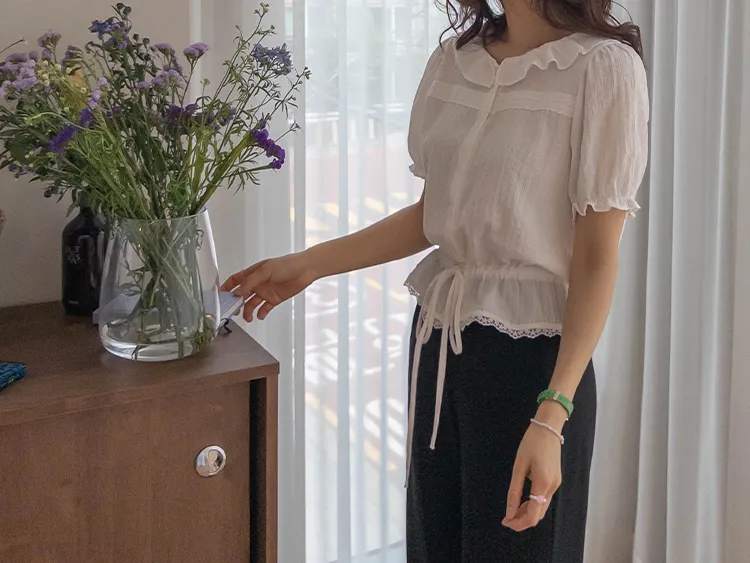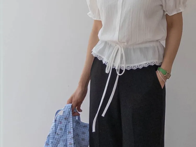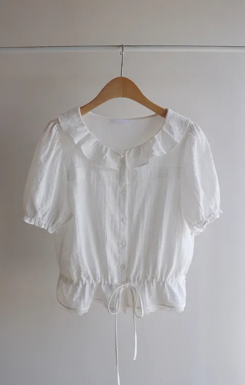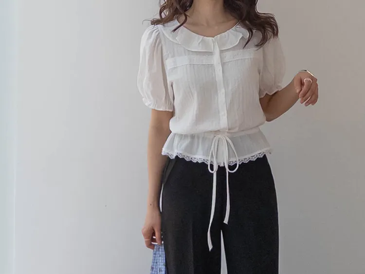 優雅摺邊領蕾絲飾帶綁帶收腰線條排扣上衣
