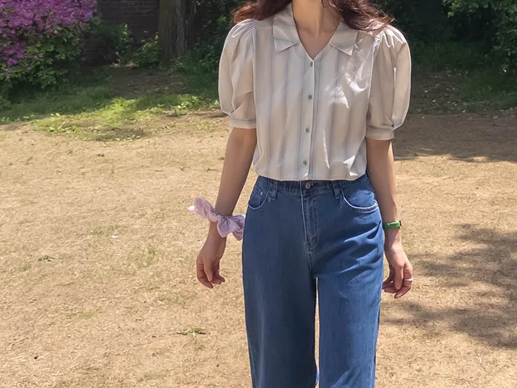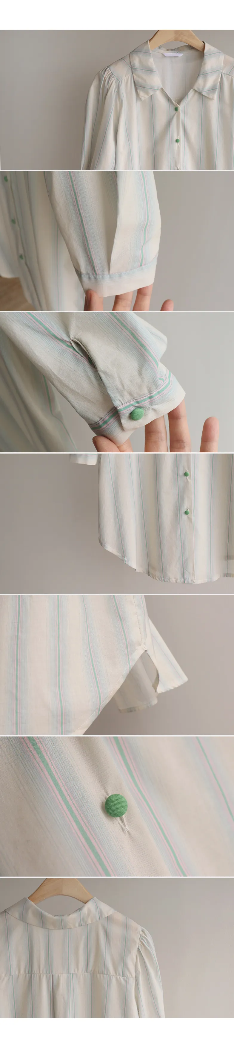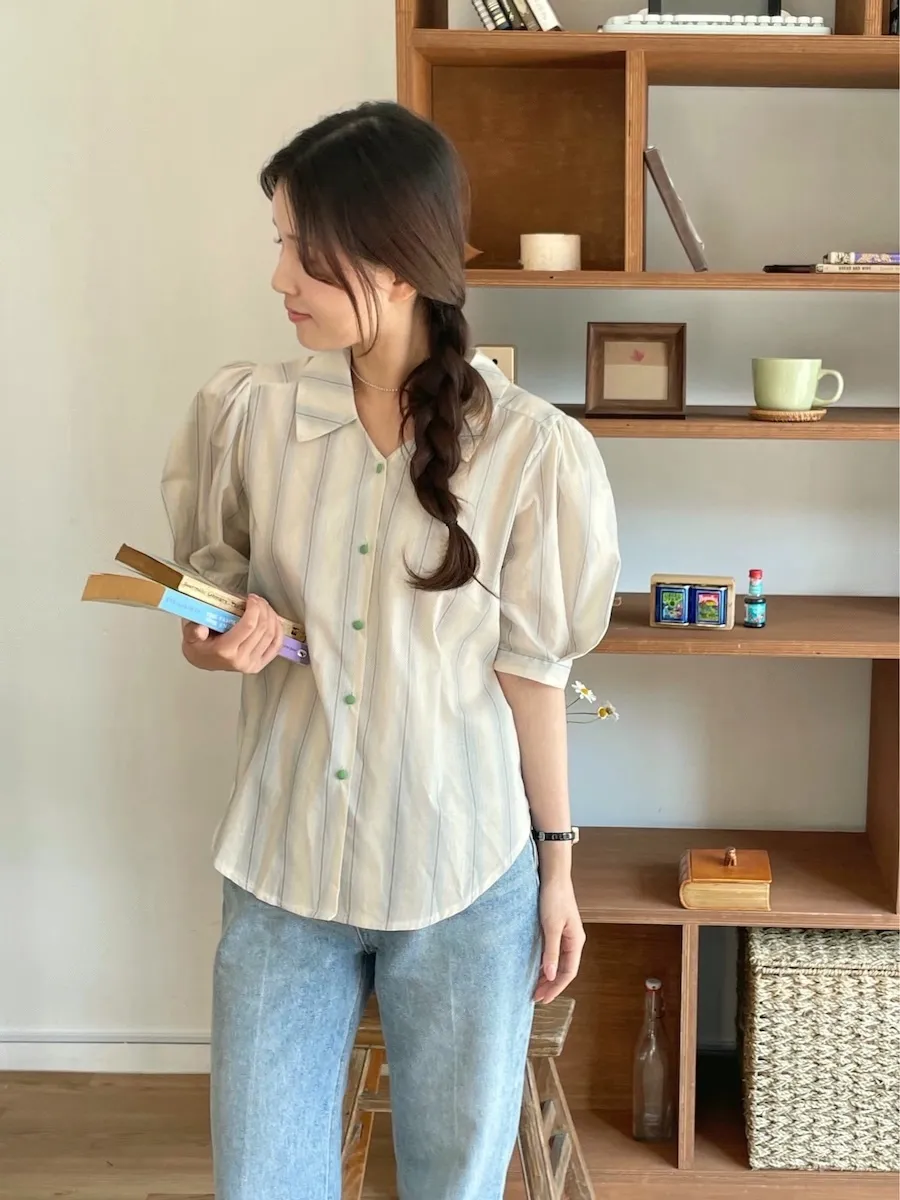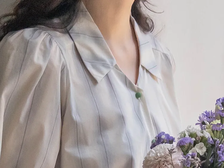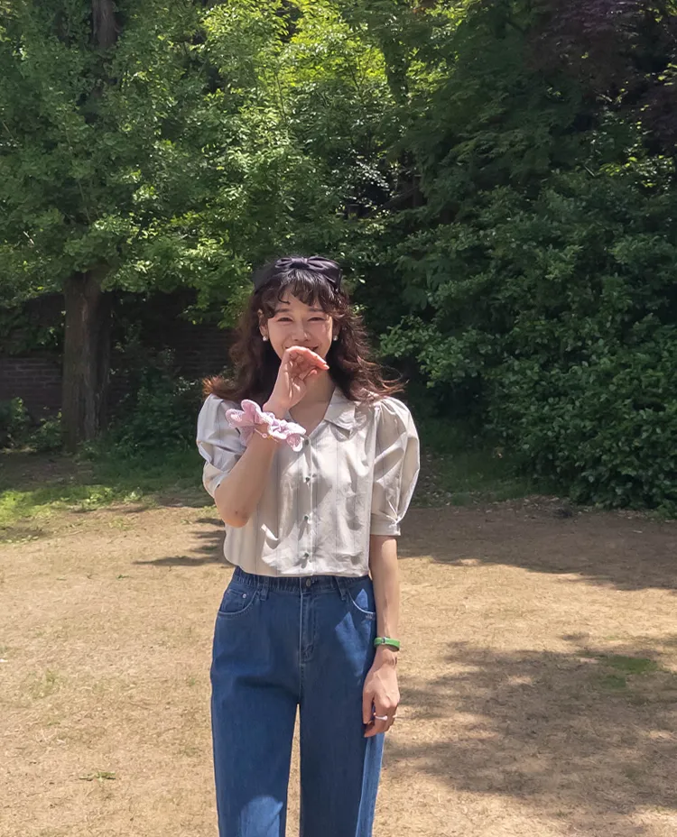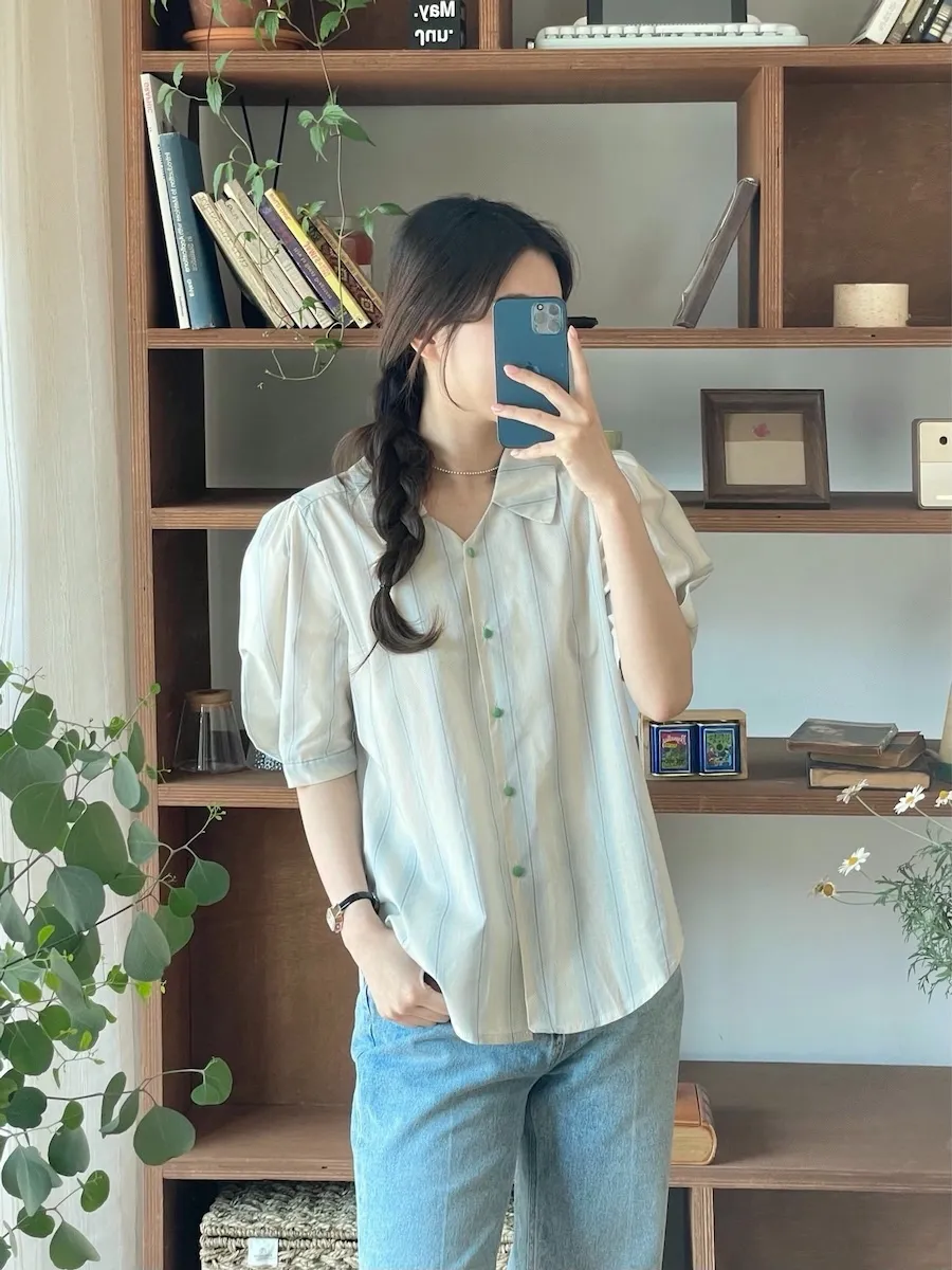 [漸層單色圖案,精緻的排扣上衣♥] [V領設計獨特] [配色豆紐扣設計] [泡泡肩設計,可愛廓形♥]