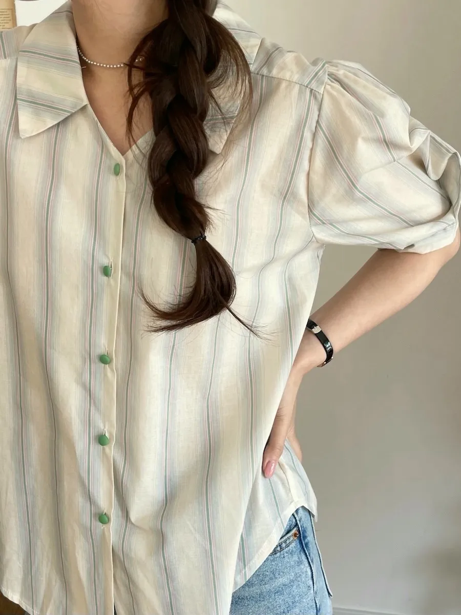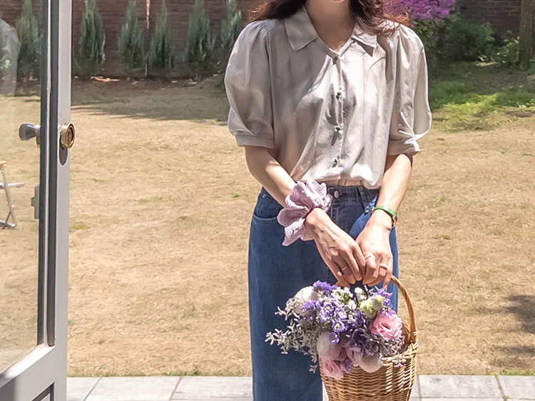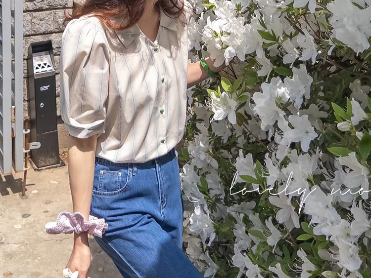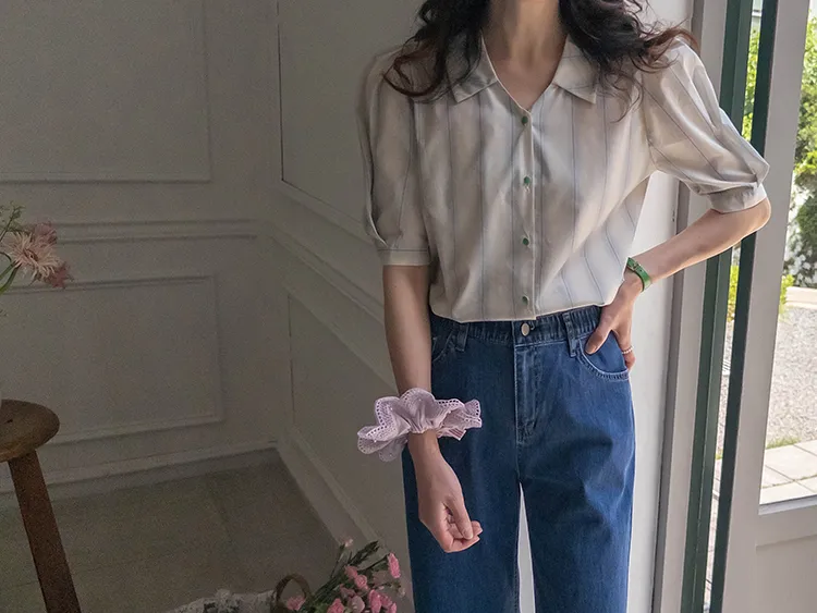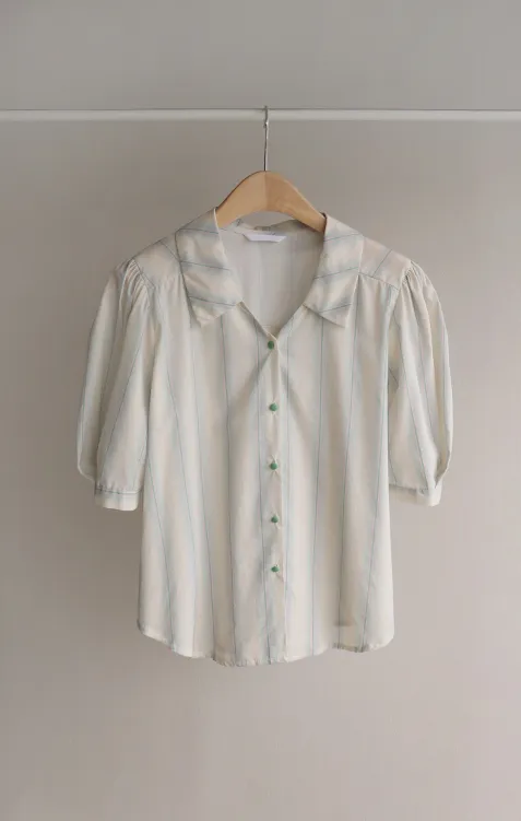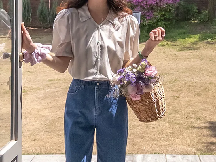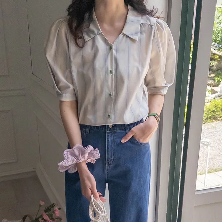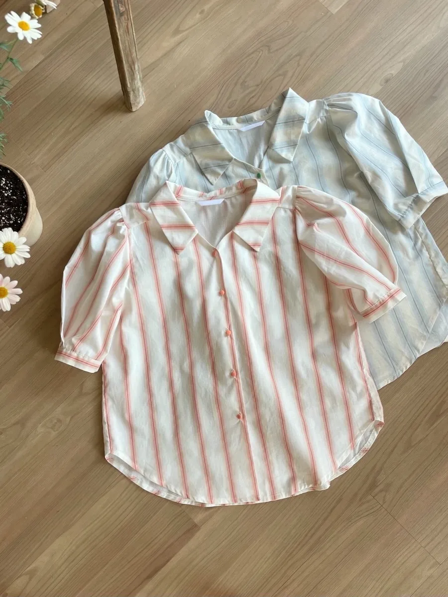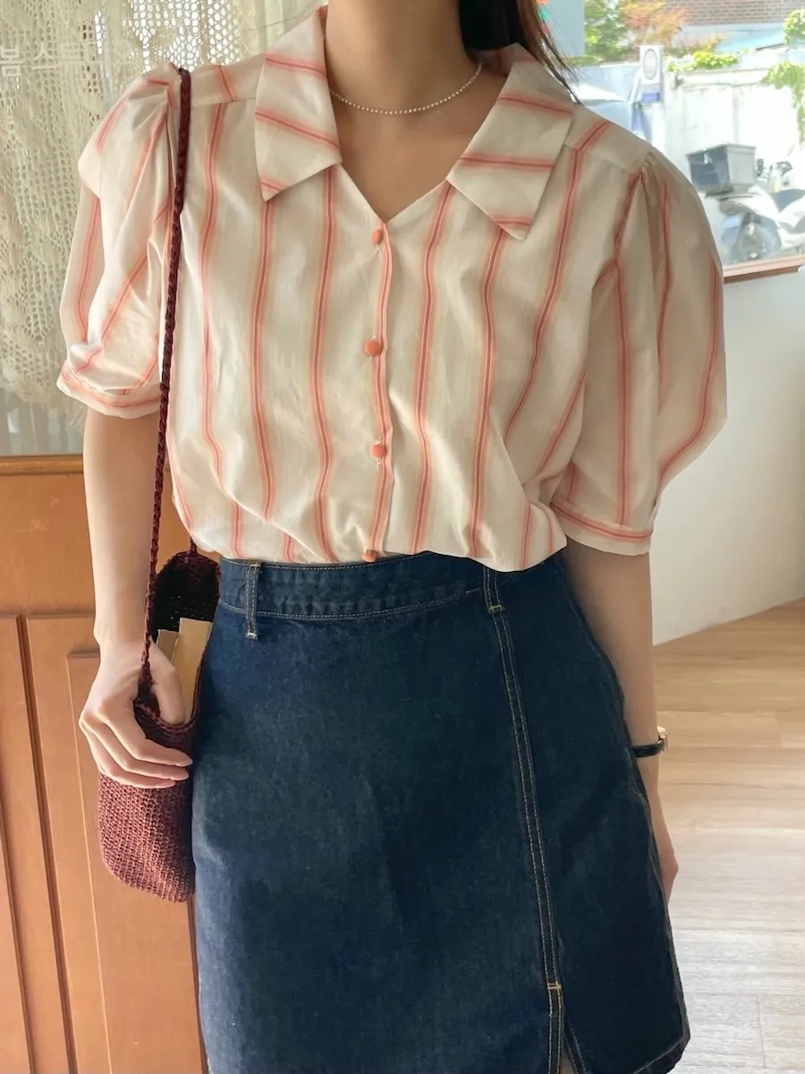 [漸層單色圖案,精緻的排扣上衣♥] [V領設計獨特] [配色豆紐扣設計] [泡泡肩設計,可愛廓形♥]