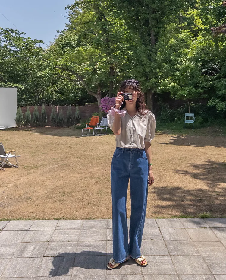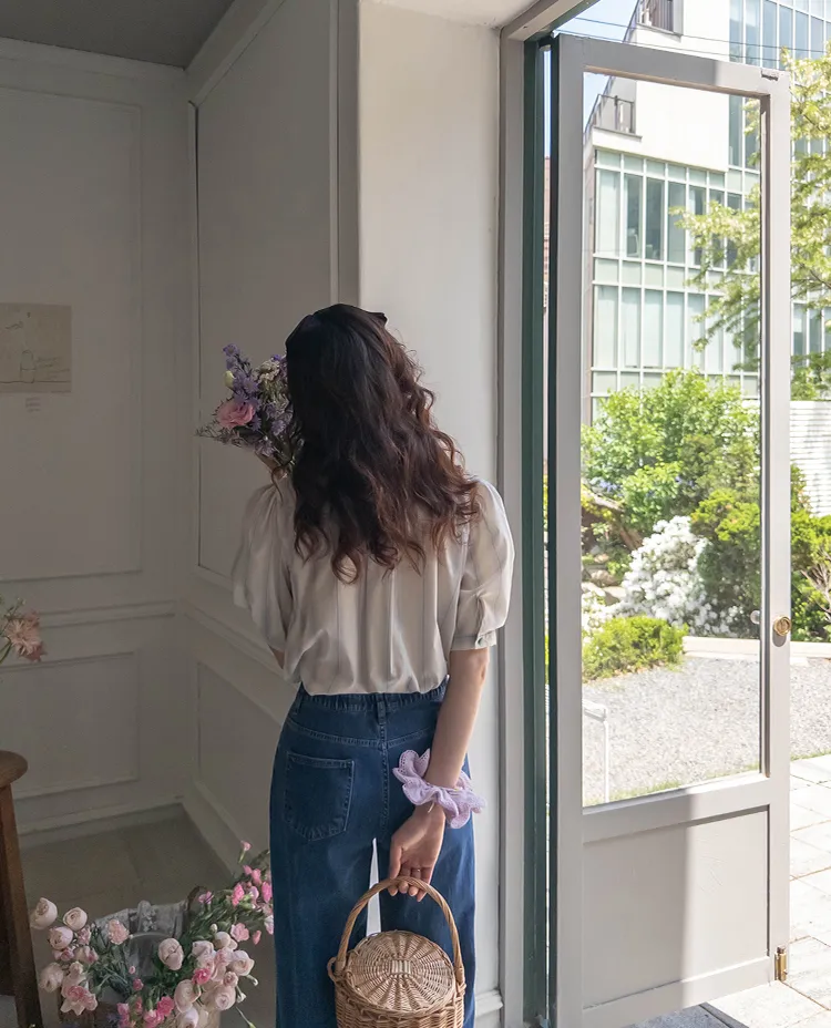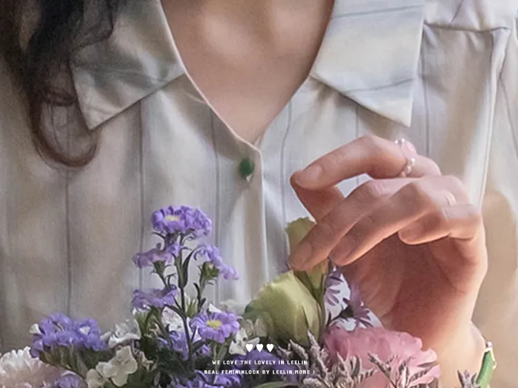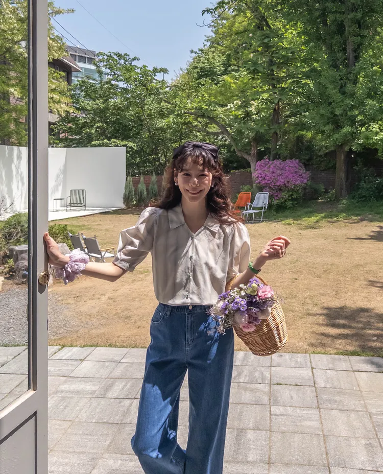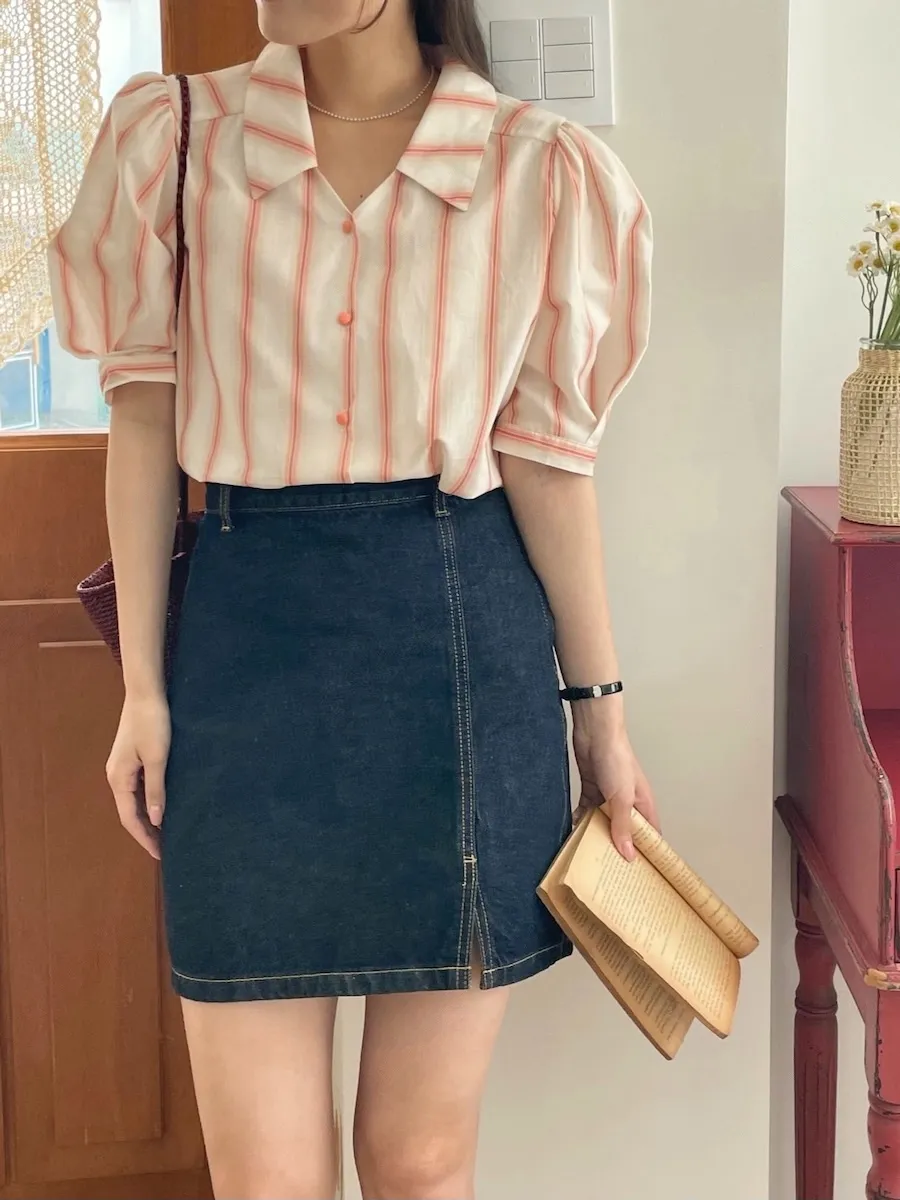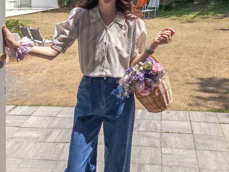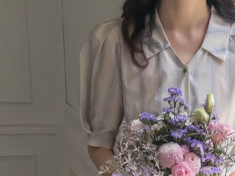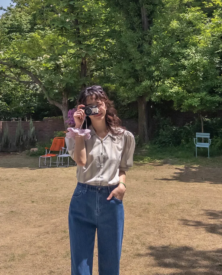 [漸層單色圖案,精緻的排扣上衣♥] [V領設計獨特] [配色豆紐扣設計] [泡泡肩設計,可愛廓形♥]
