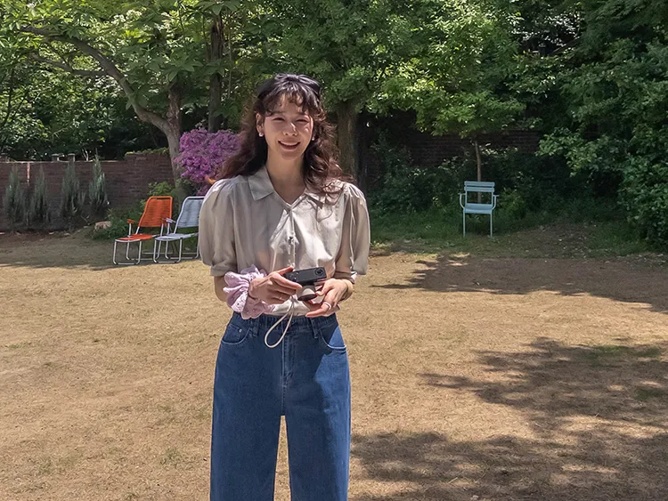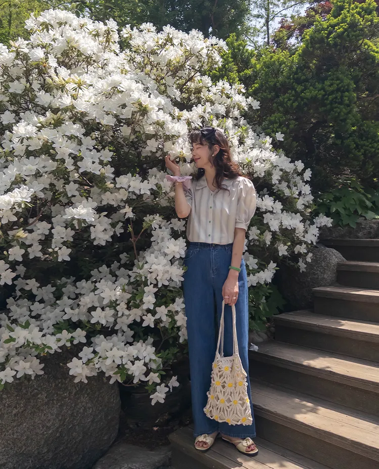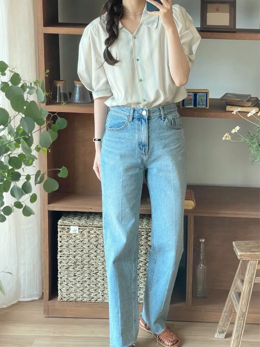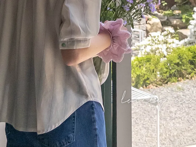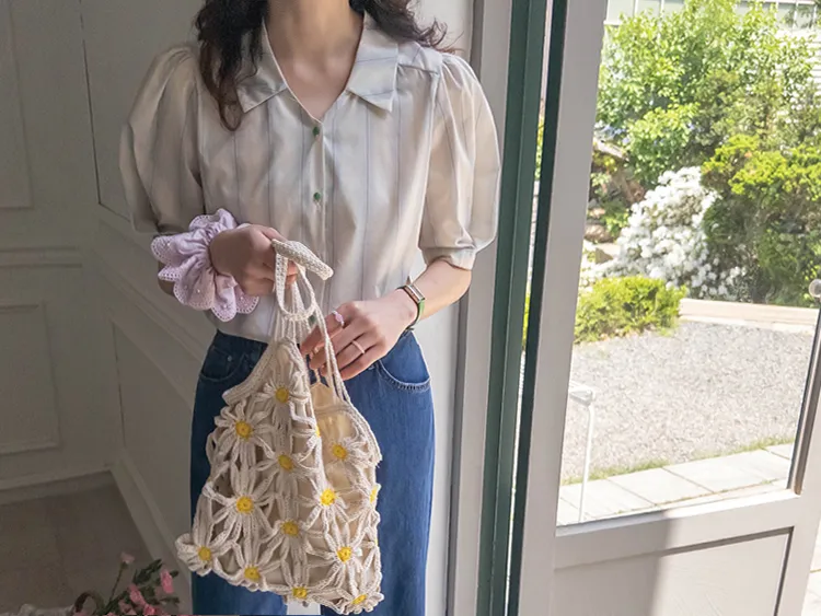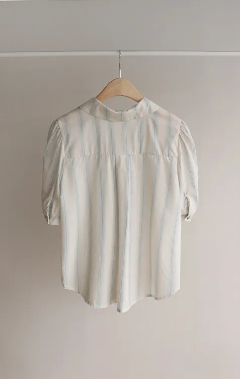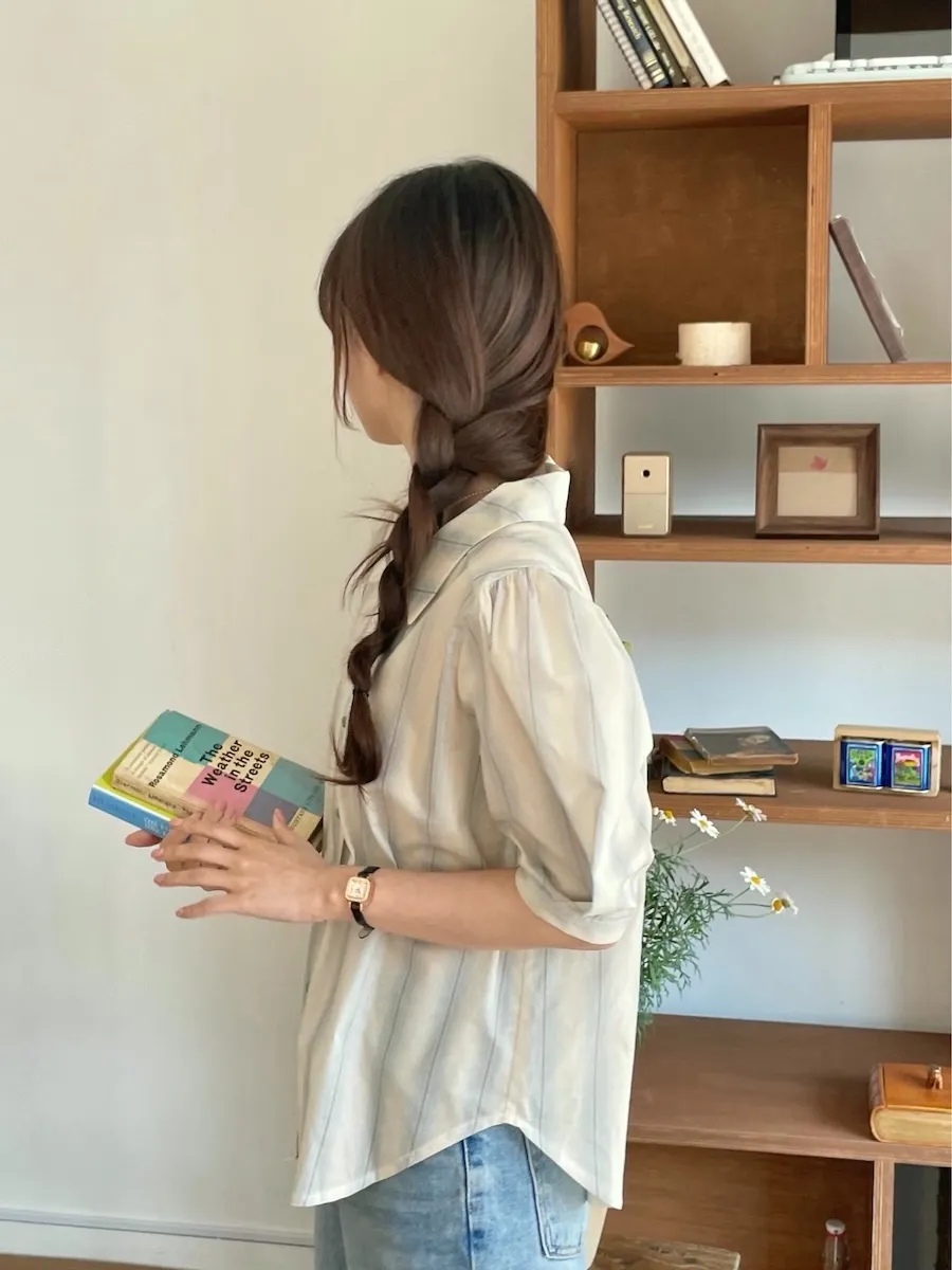[漸層單色圖案,精緻的排扣上衣♥] [V領設計獨特] [配色豆紐扣設計] [泡泡肩設計,可愛廓形♥]
