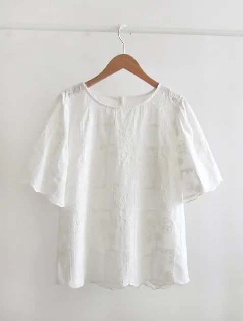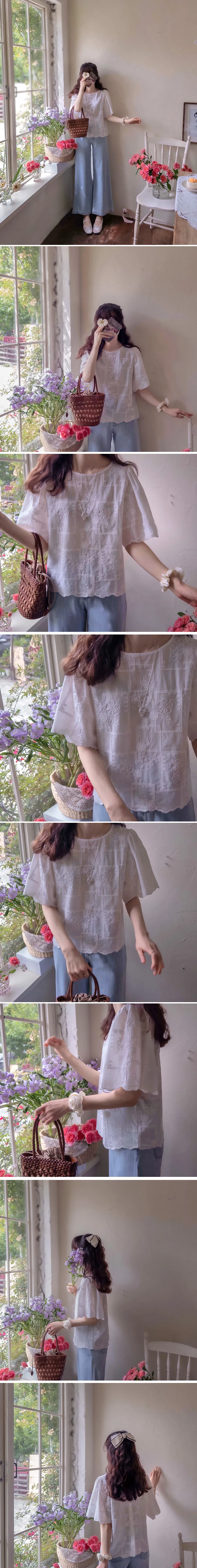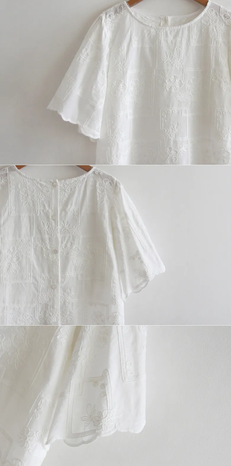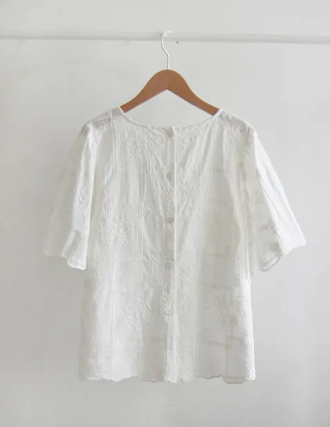 【精緻可愛的花朵刺繡,優雅的上衣】 【下擺和袖口採用波浪形刺繡,營造出精緻氛圍】 【從現在到夏天,明亮又時尚的穿搭上衣】 【精緻立體花朵刺繡非常漂亮】 【明亮又時尚,夏季上衣】