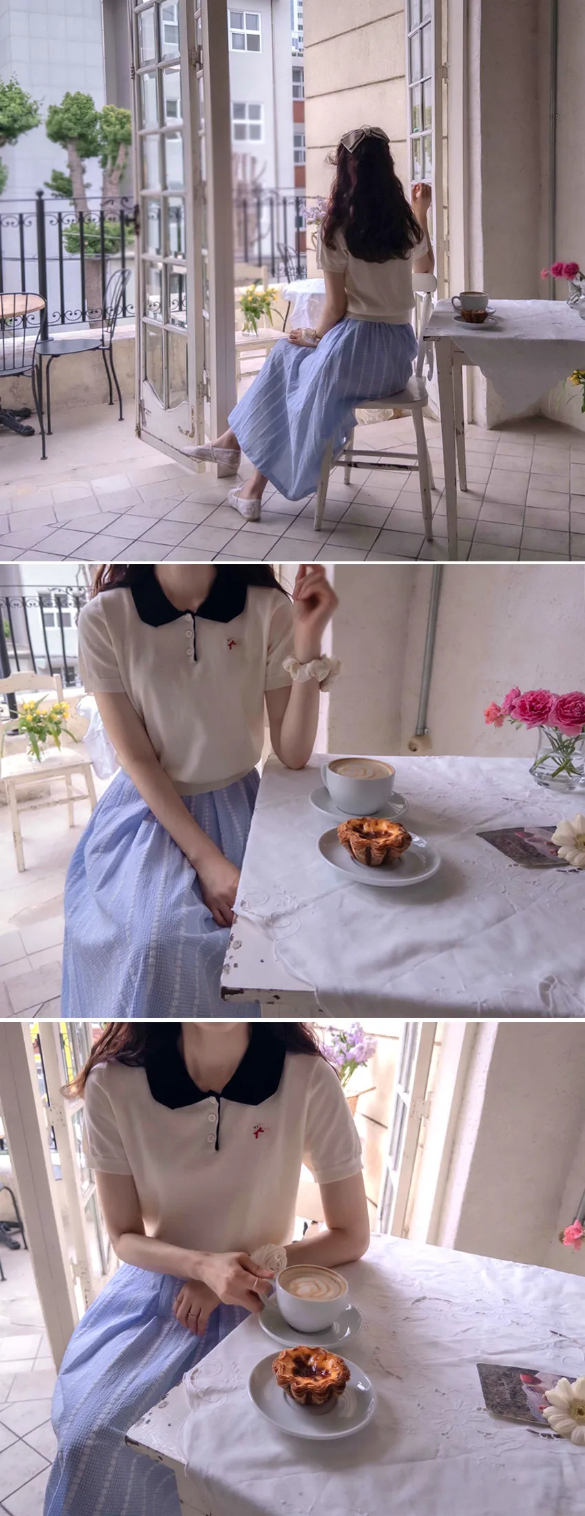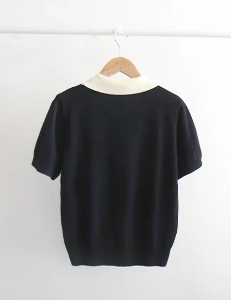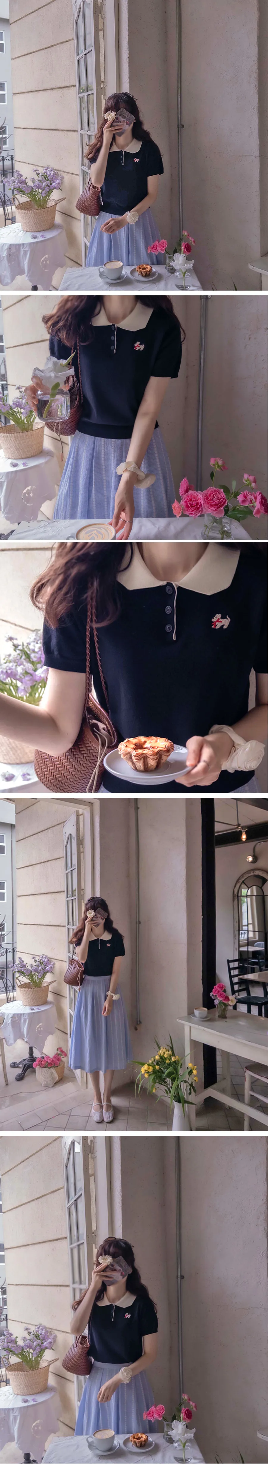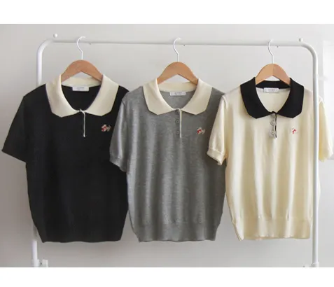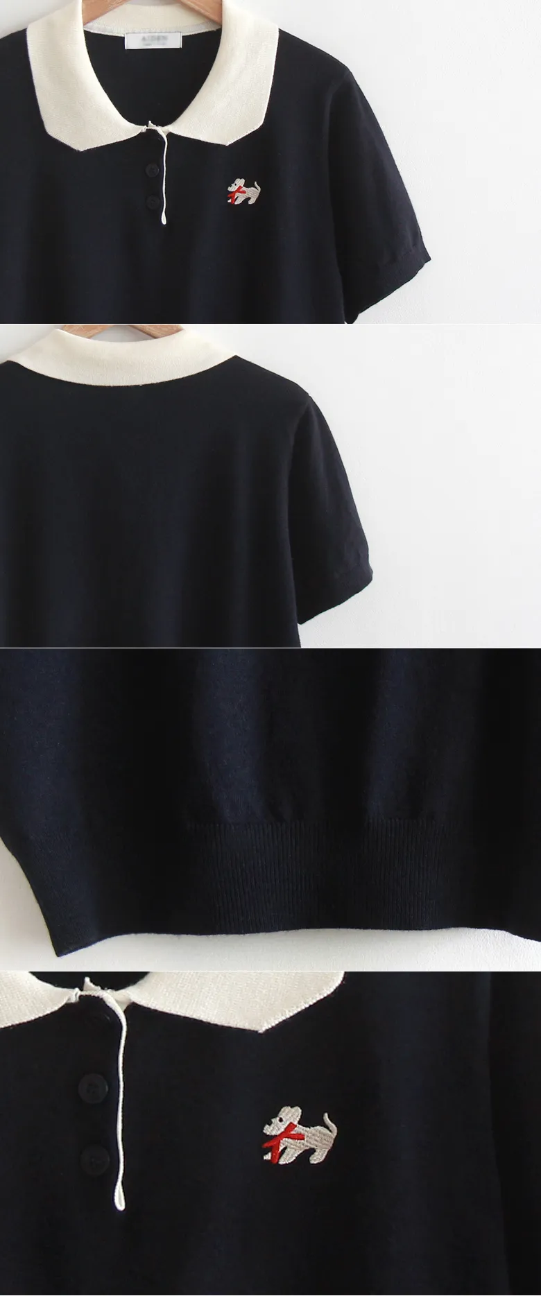 [鈕扣開啓閉合] [對比色的簡約針織] [柔軟舒適的穿著感] [以可愛的小狗刺繡為焦點的活潑針織] [穿著舒適優雅的短袖針織]