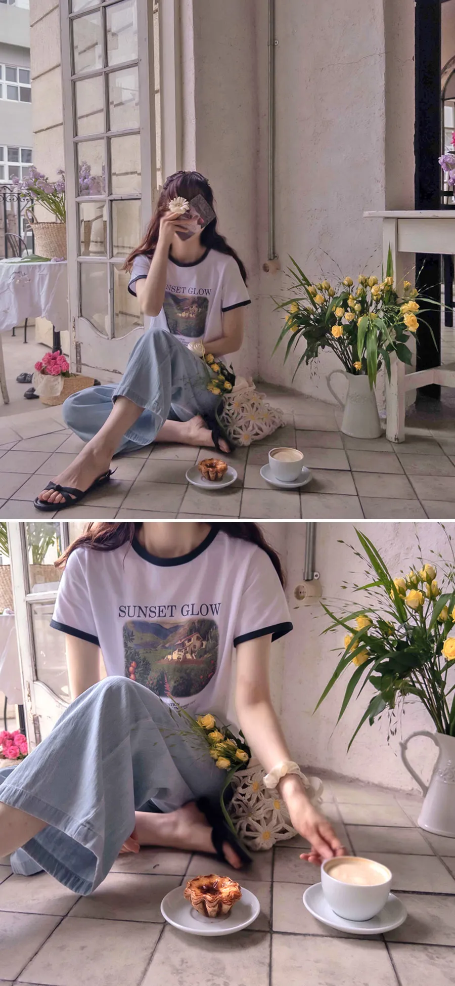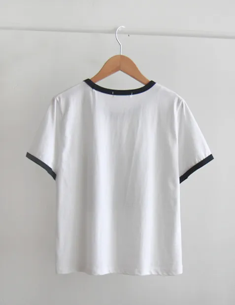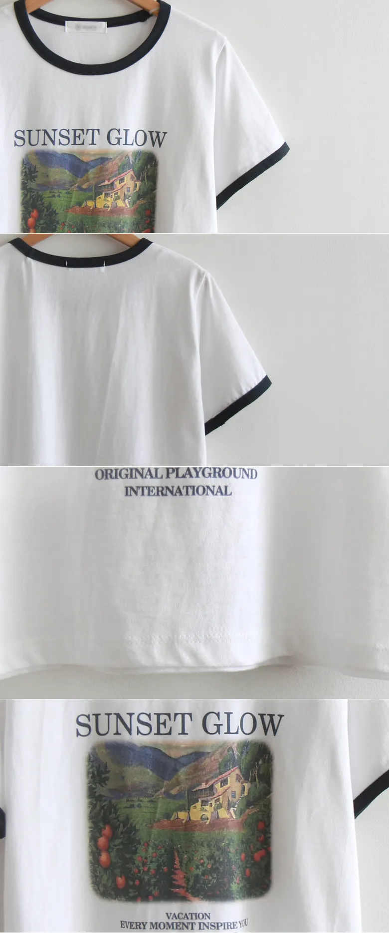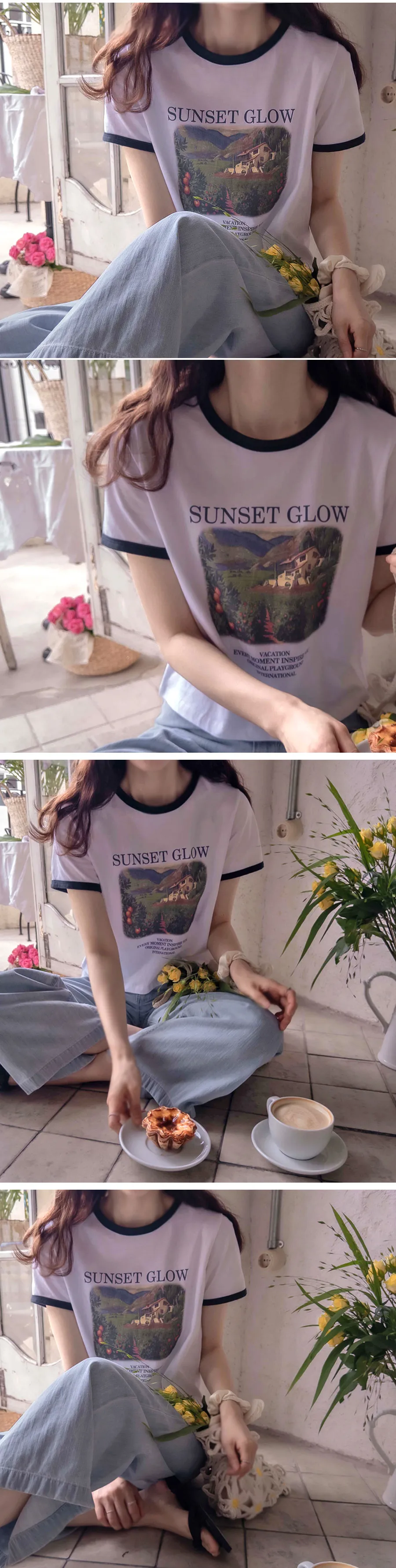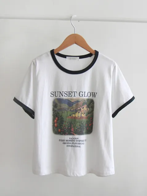 夏日風情印花領口袖末配色邊圓領短袖上衣