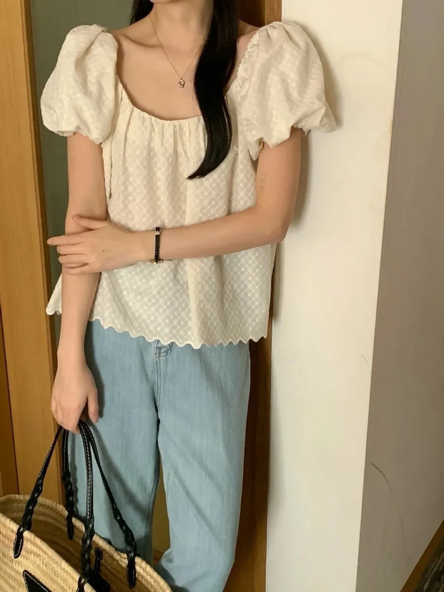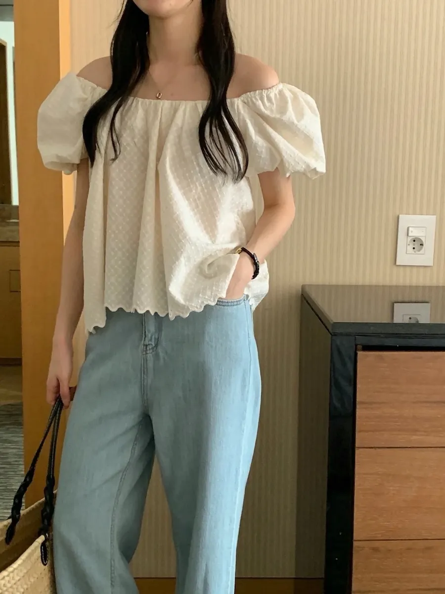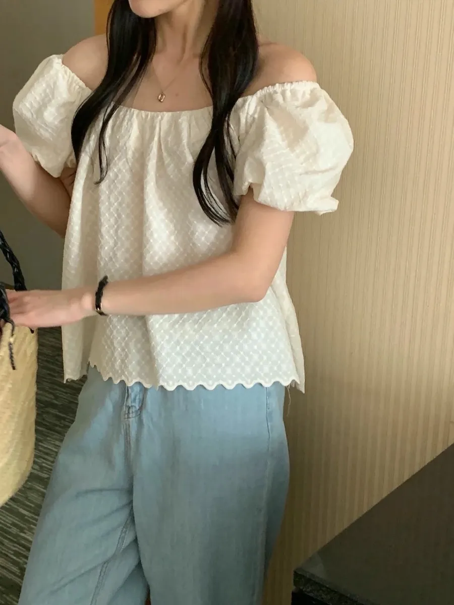 可露肩肩線飾帶花朵刺繡波浪下擺上衣