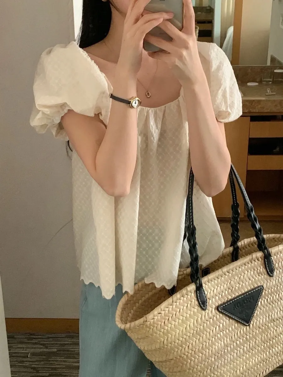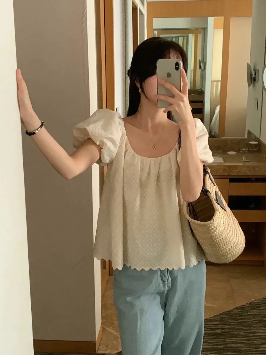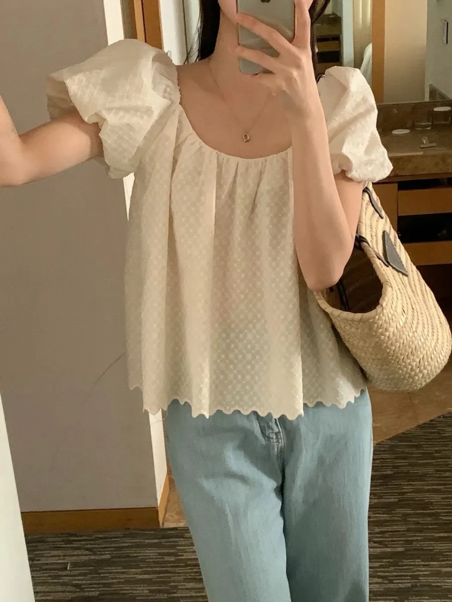 可露肩肩線飾帶花朵刺繡波浪下擺上衣