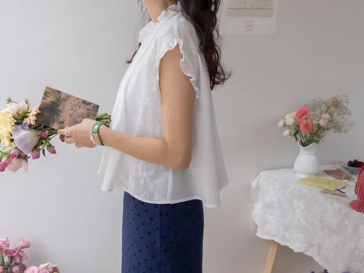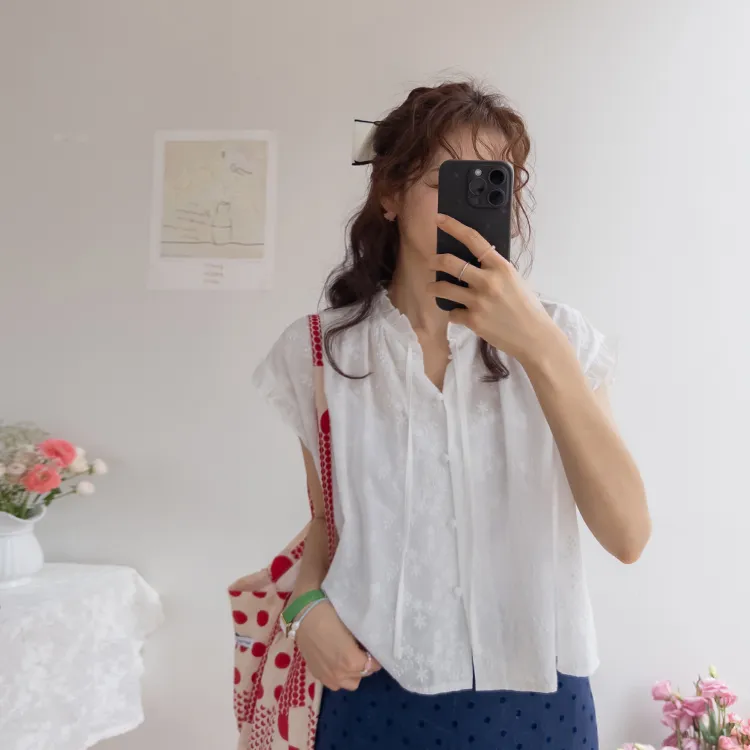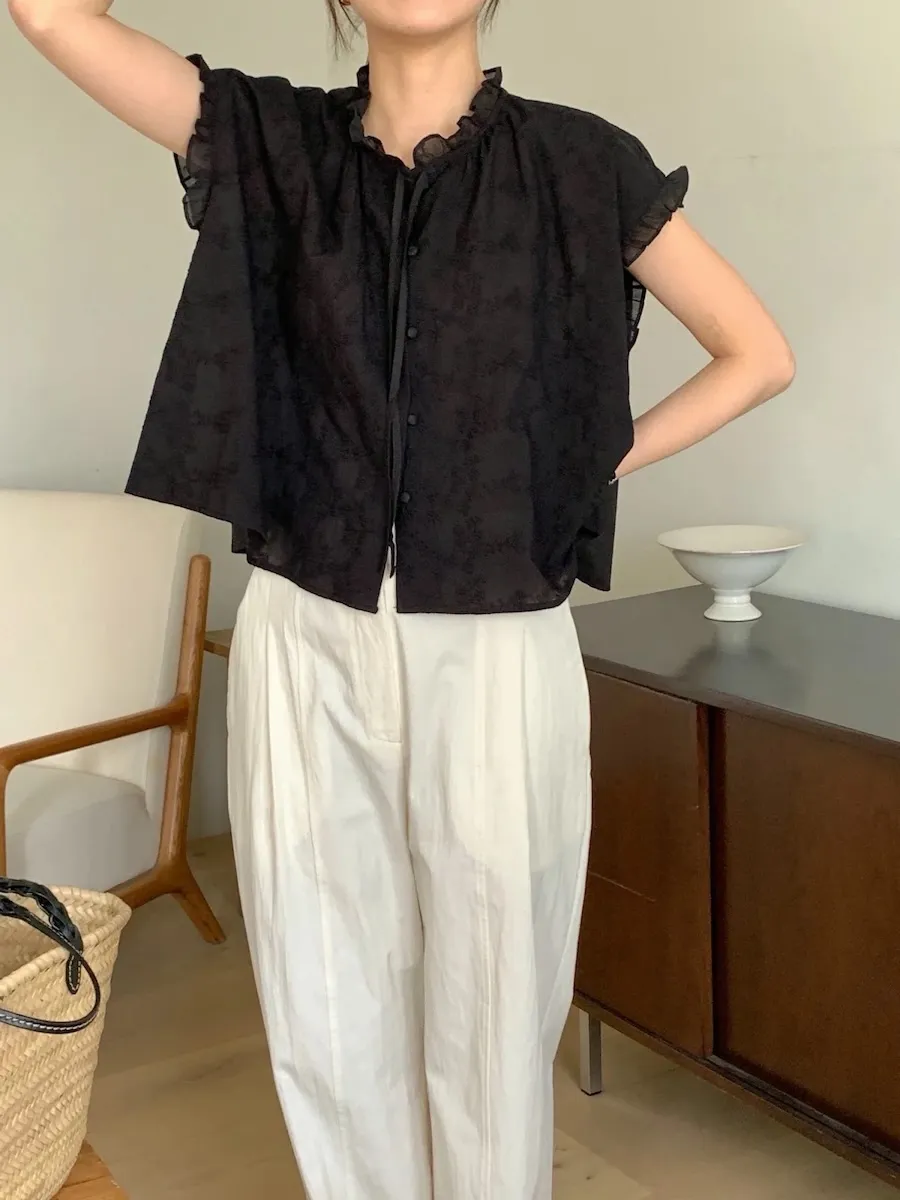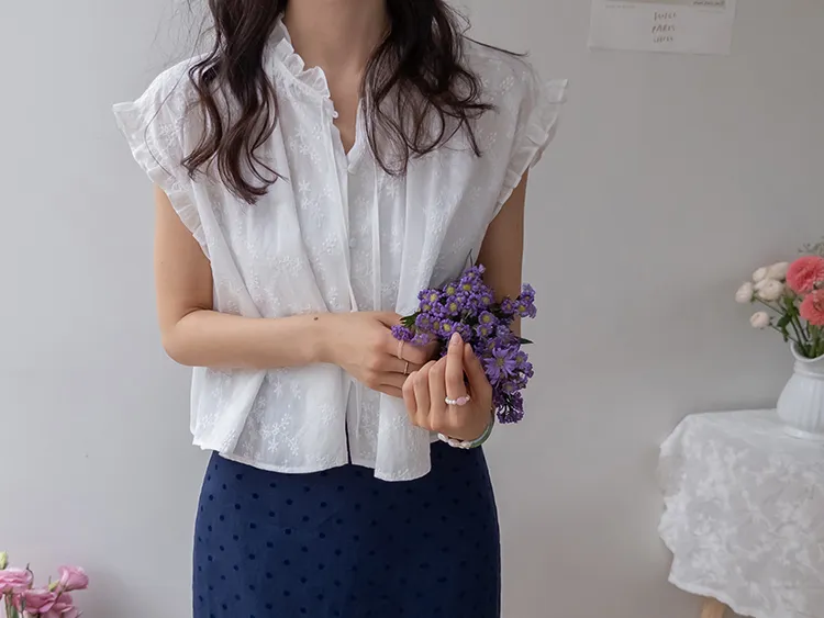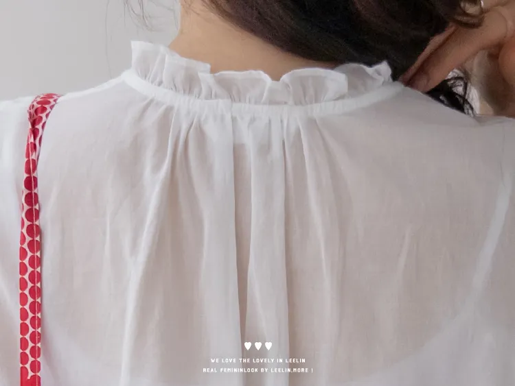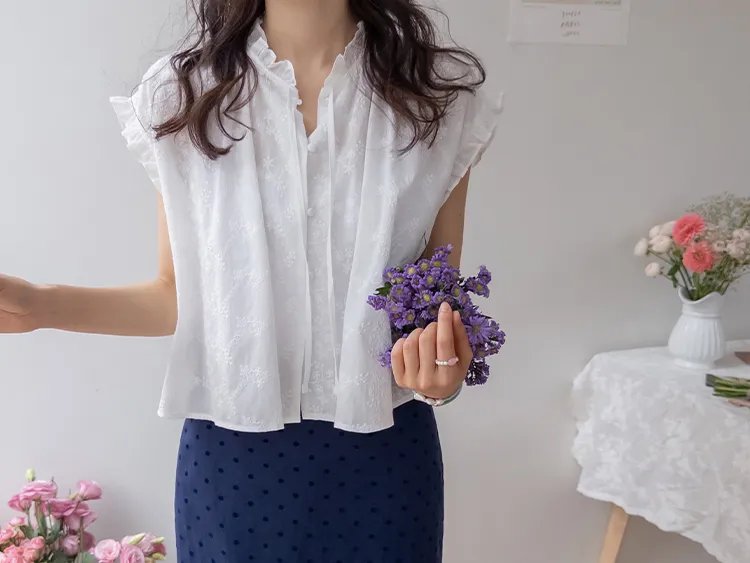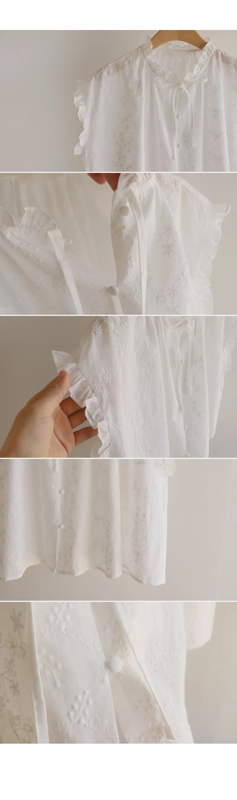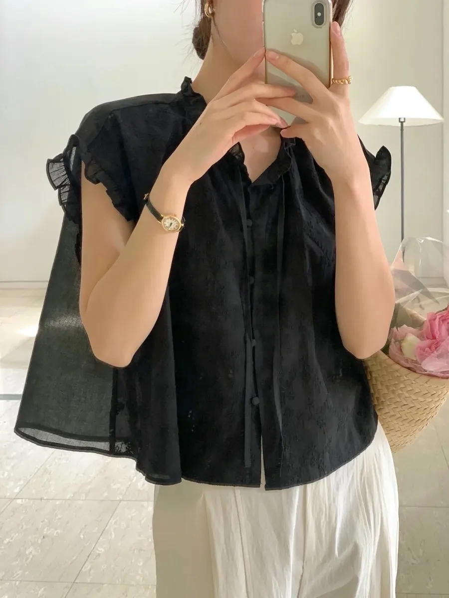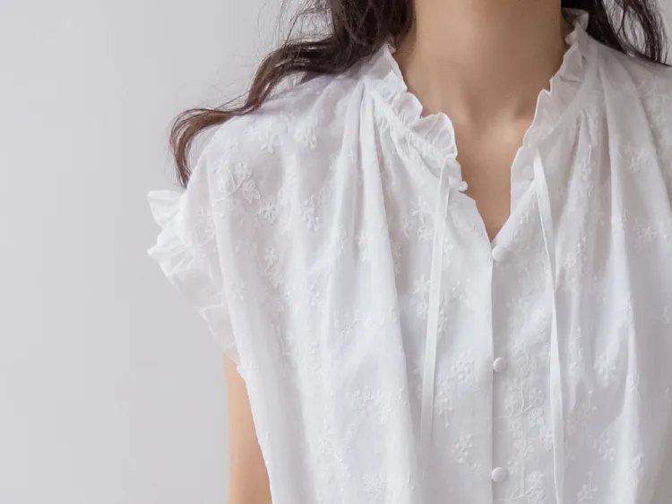 浪漫情調領口袖末摺邊刺繡蕾絲蓋袖排扣上衣