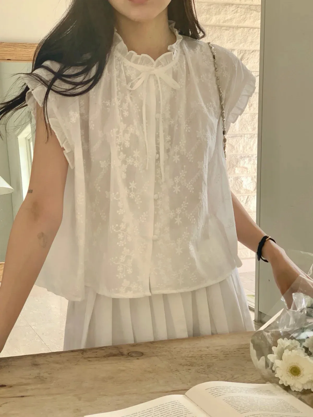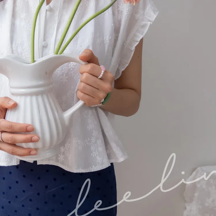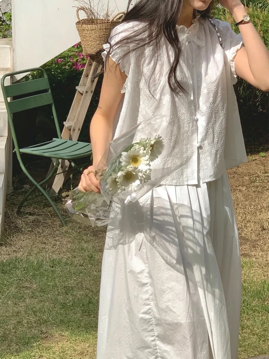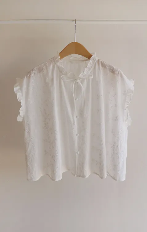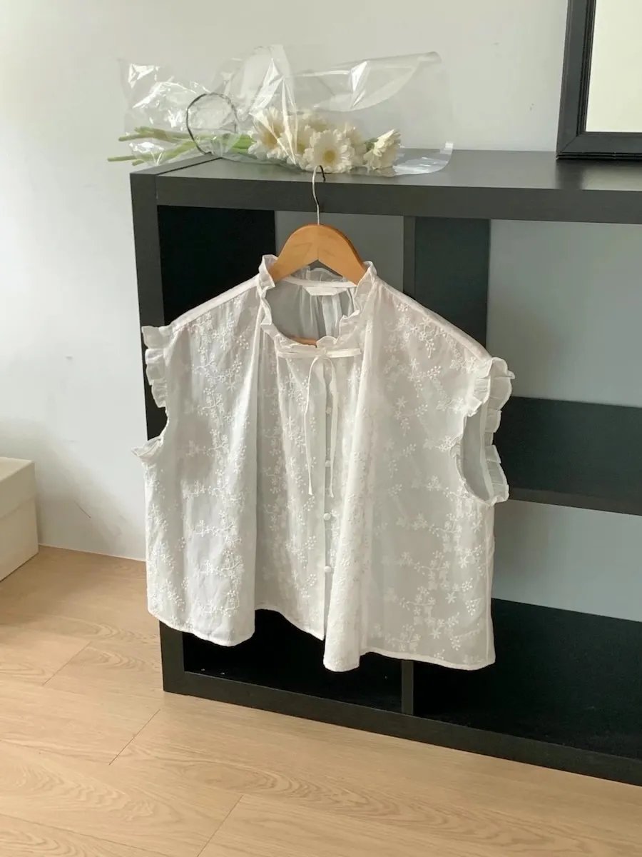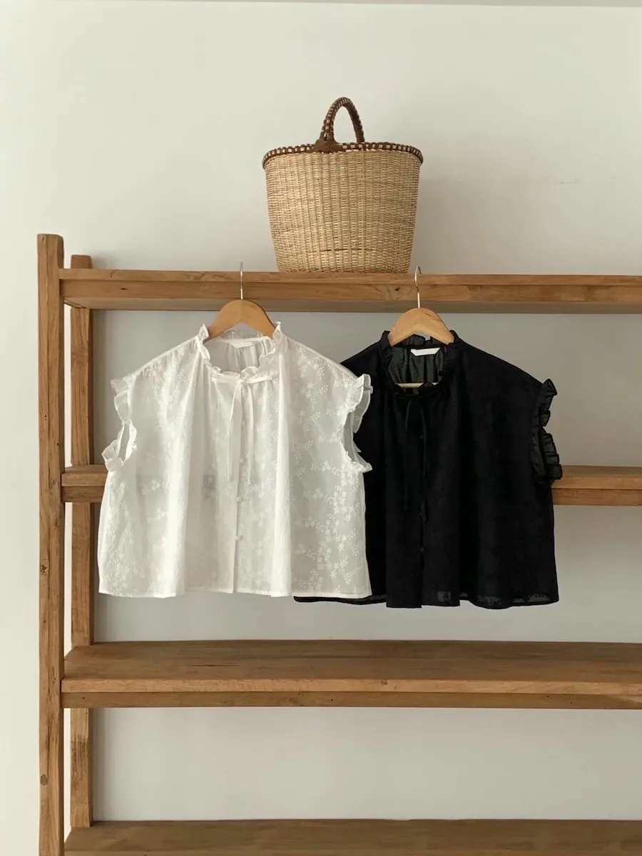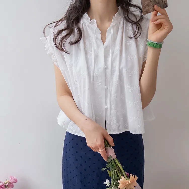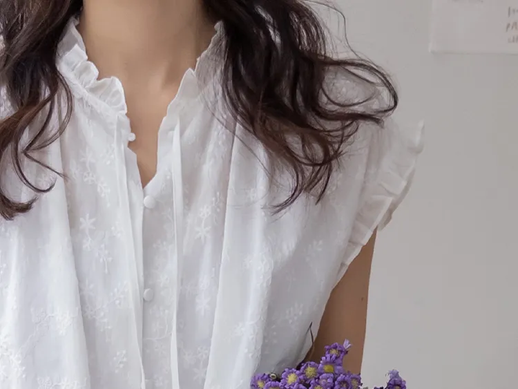 浪漫情調領口袖末摺邊刺繡蕾絲蓋袖排扣上衣
