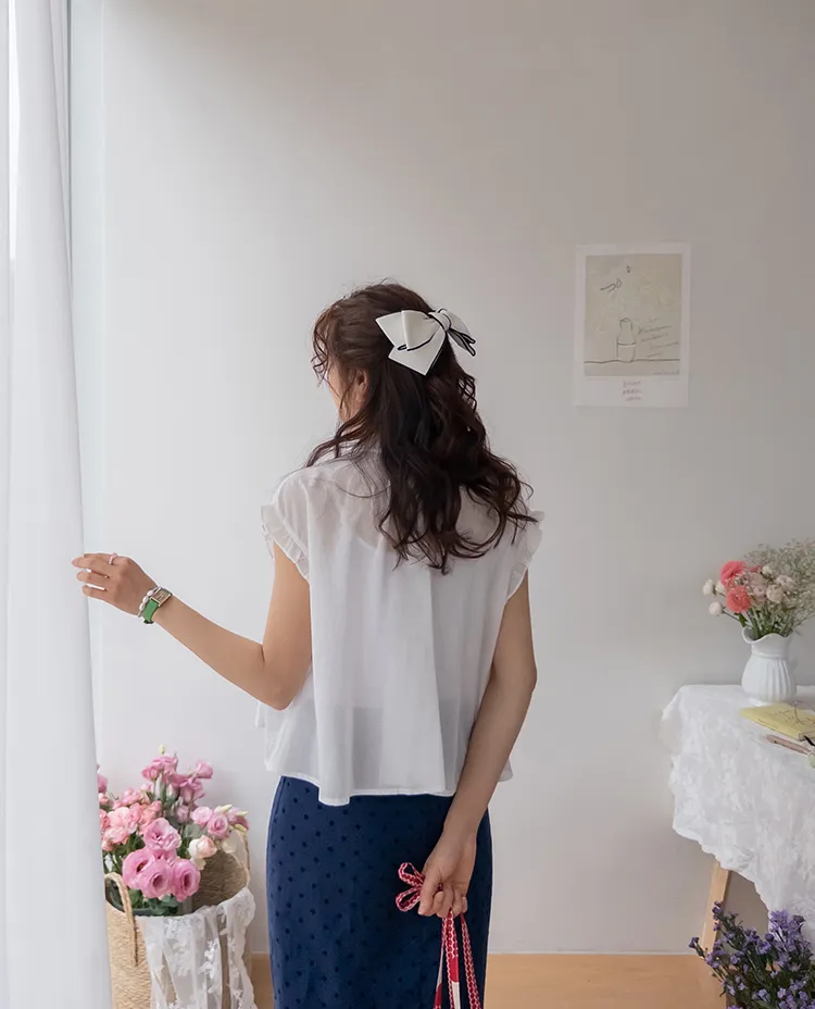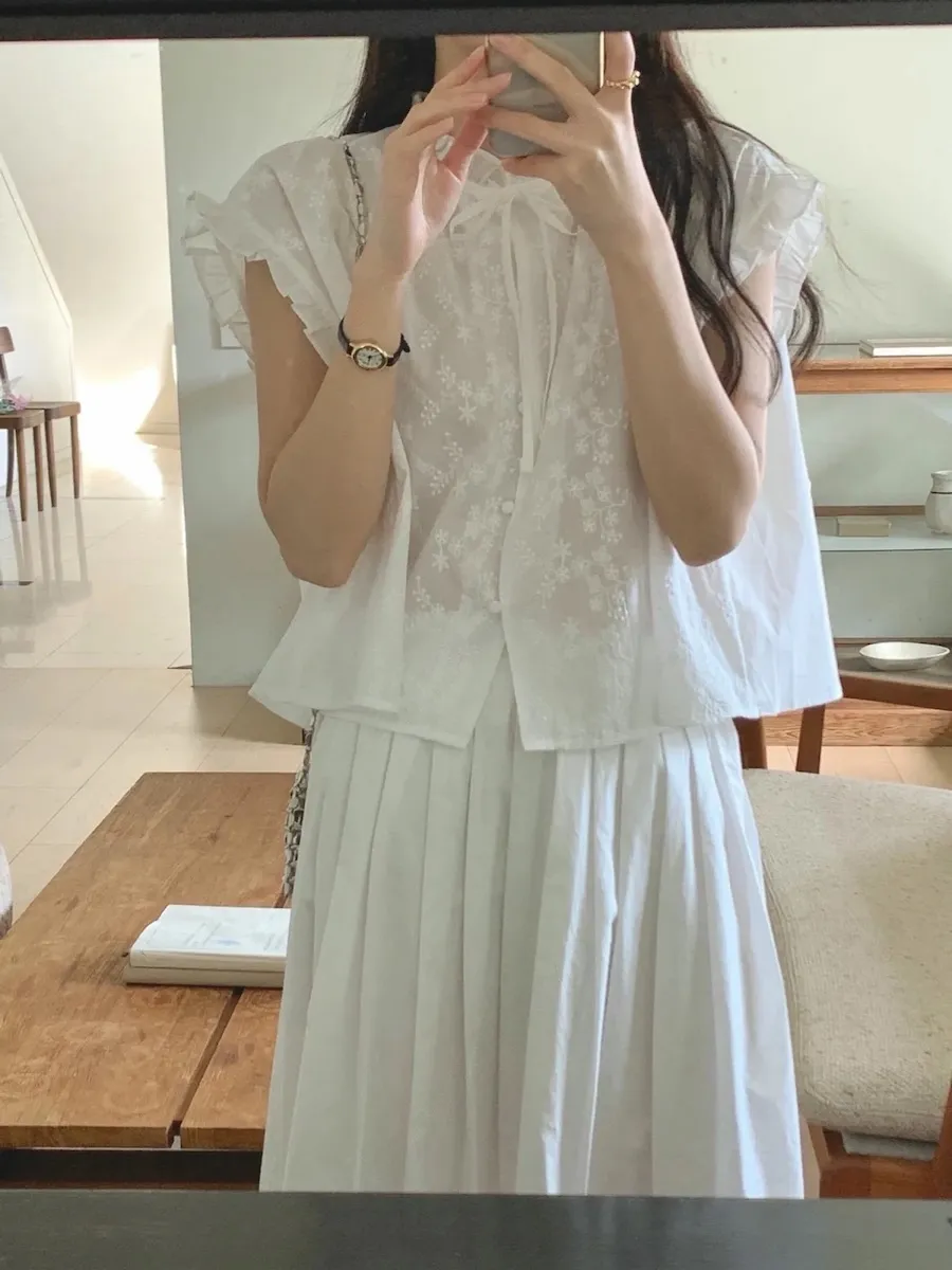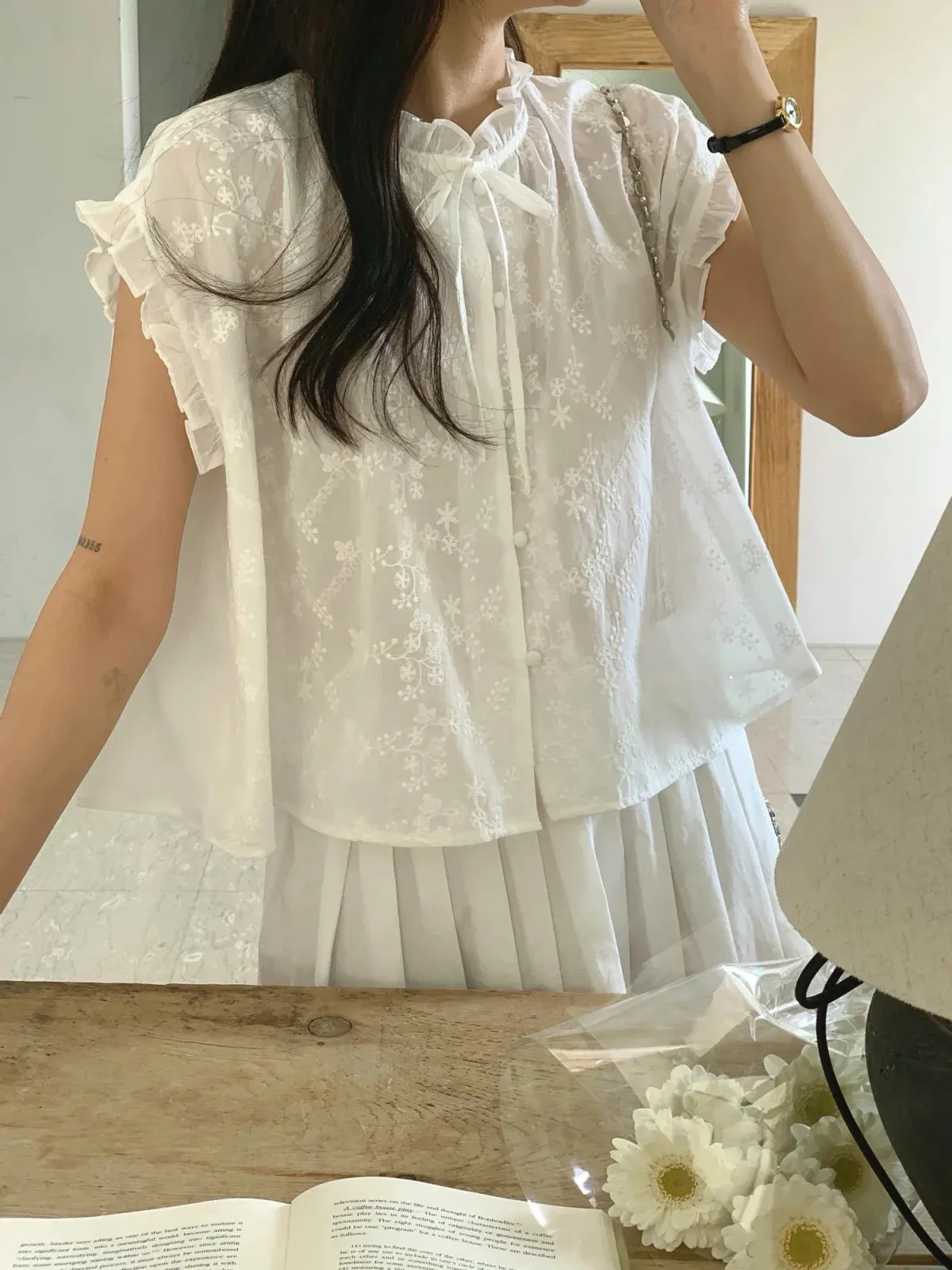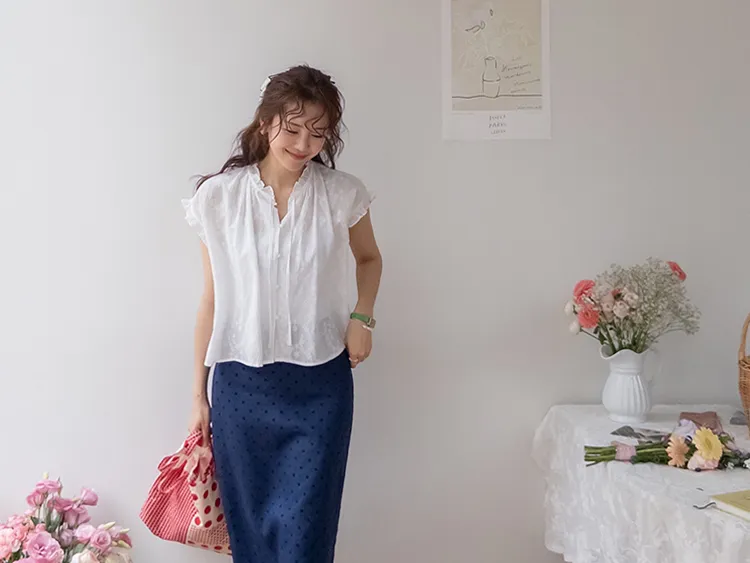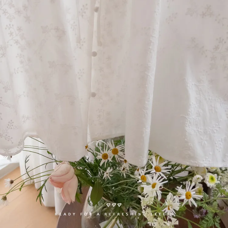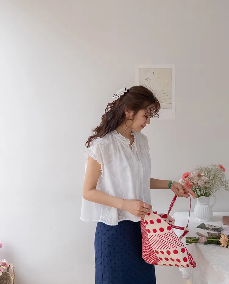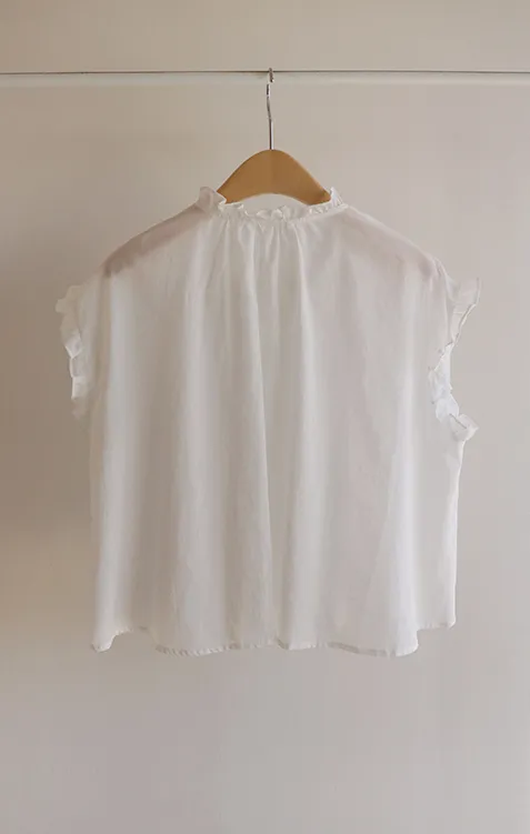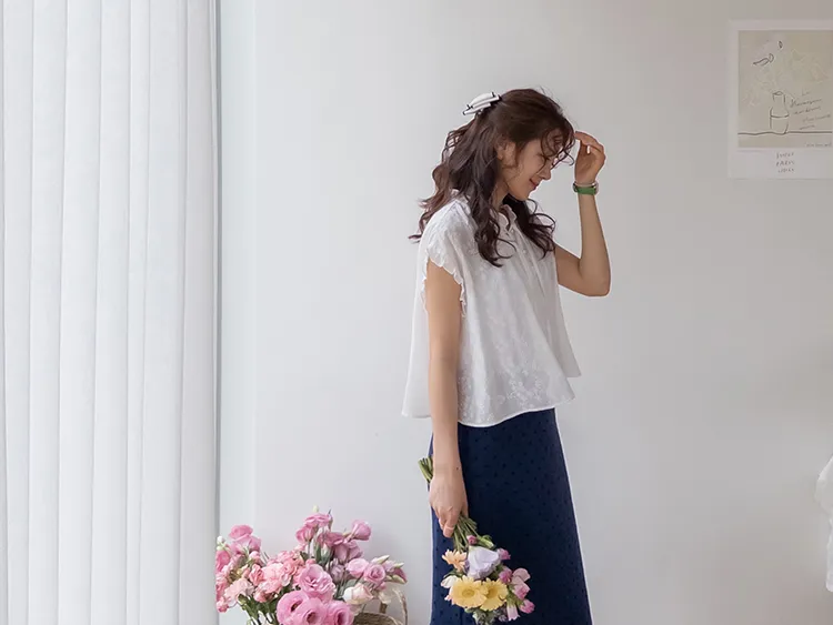 浪漫情調領口袖末摺邊刺繡蕾絲蓋袖排扣上衣