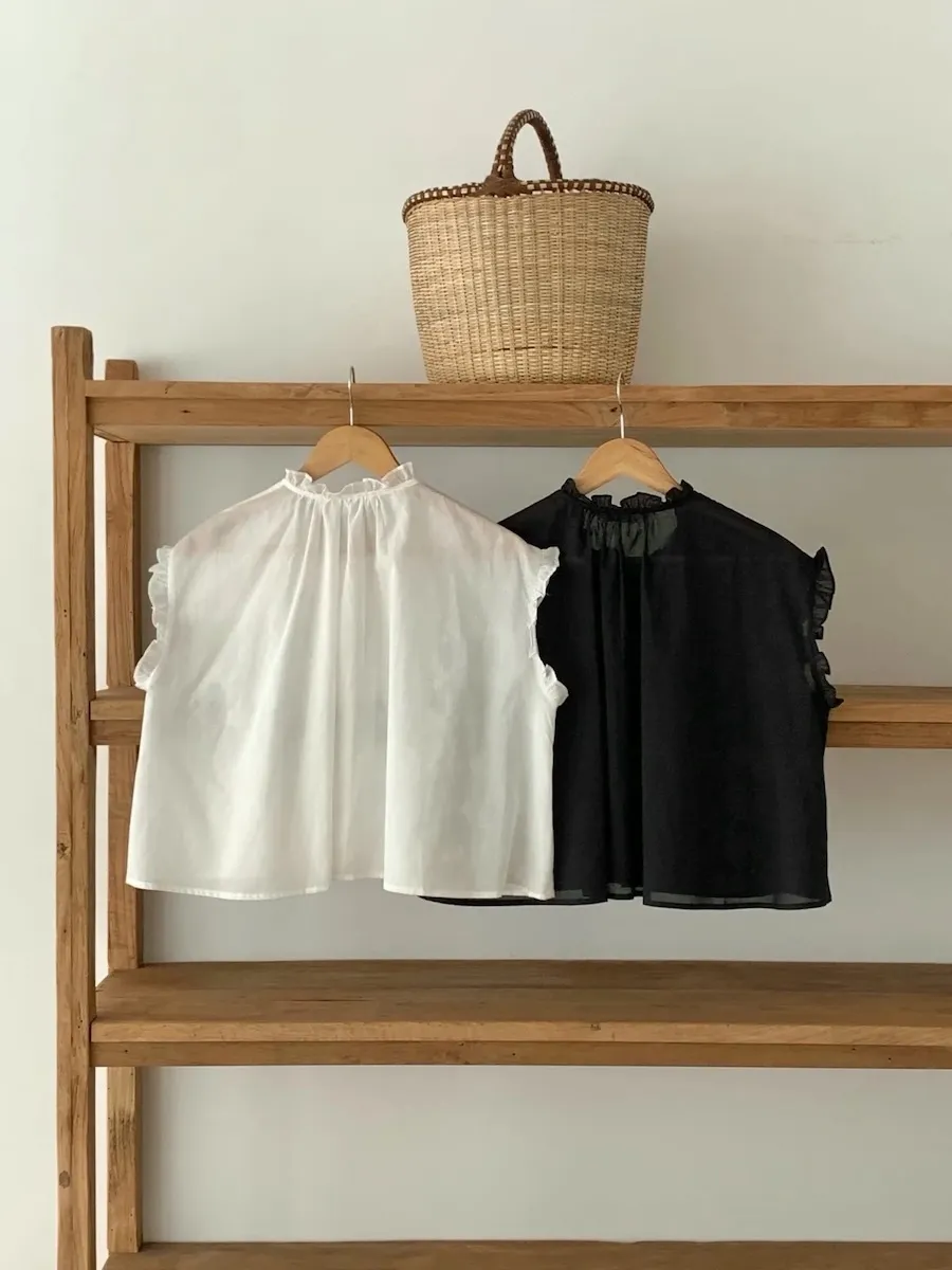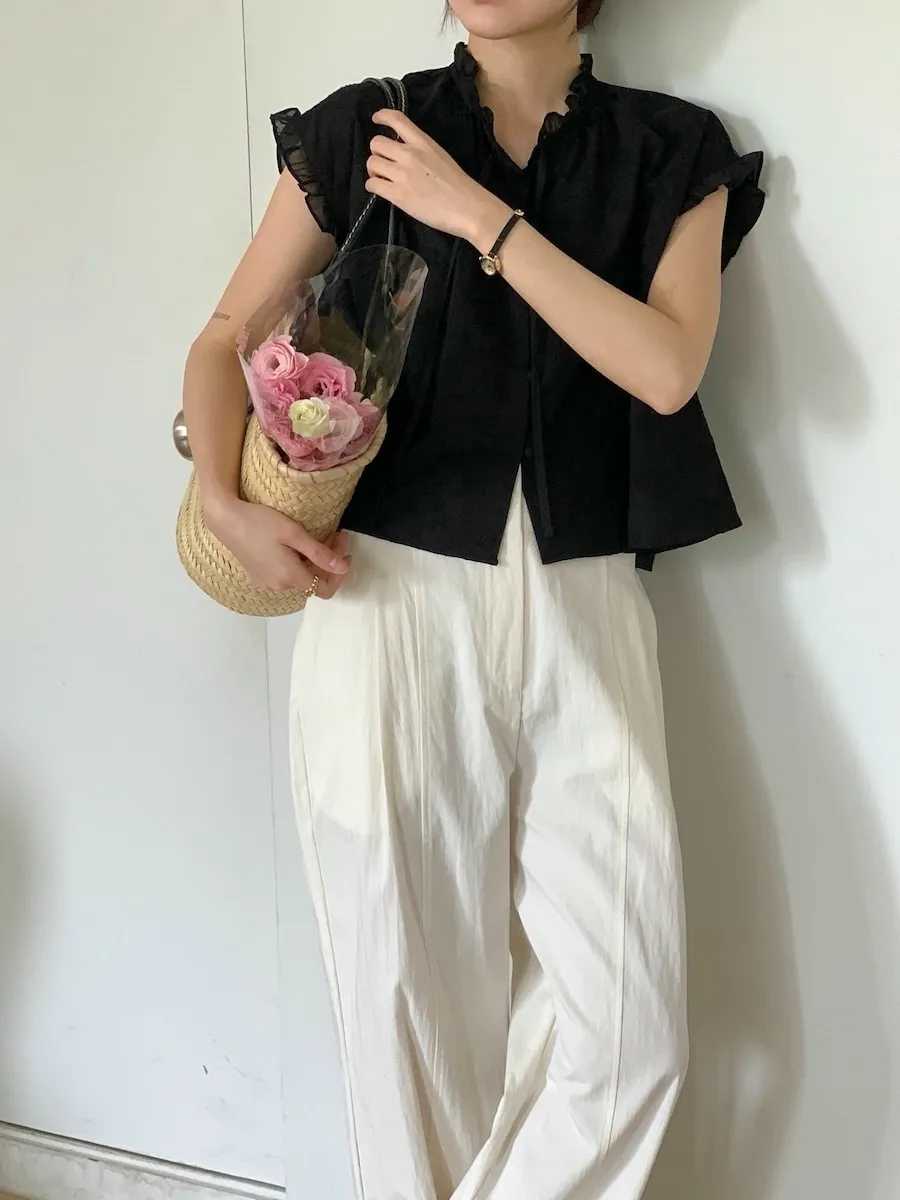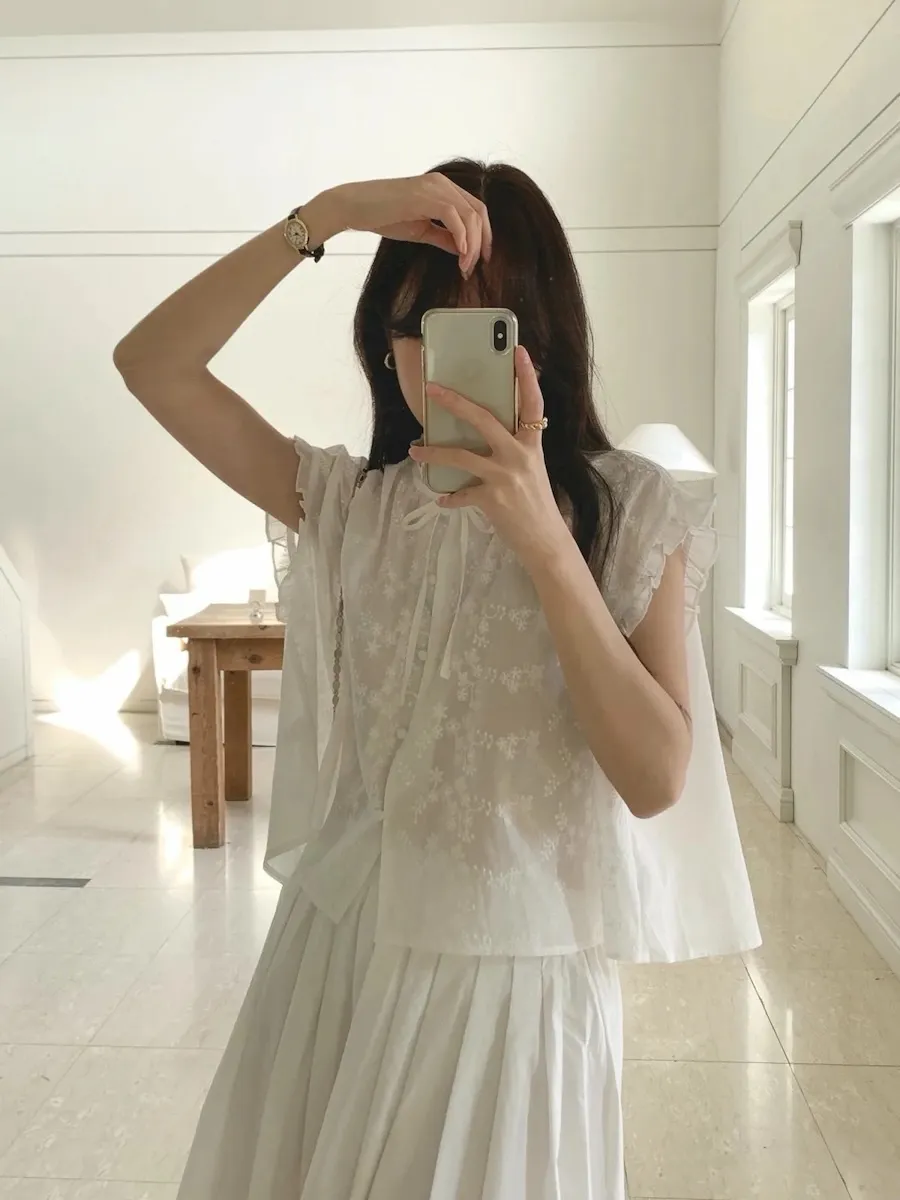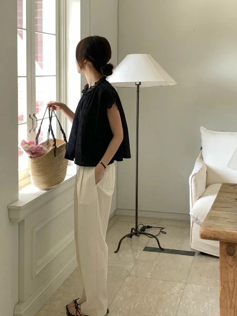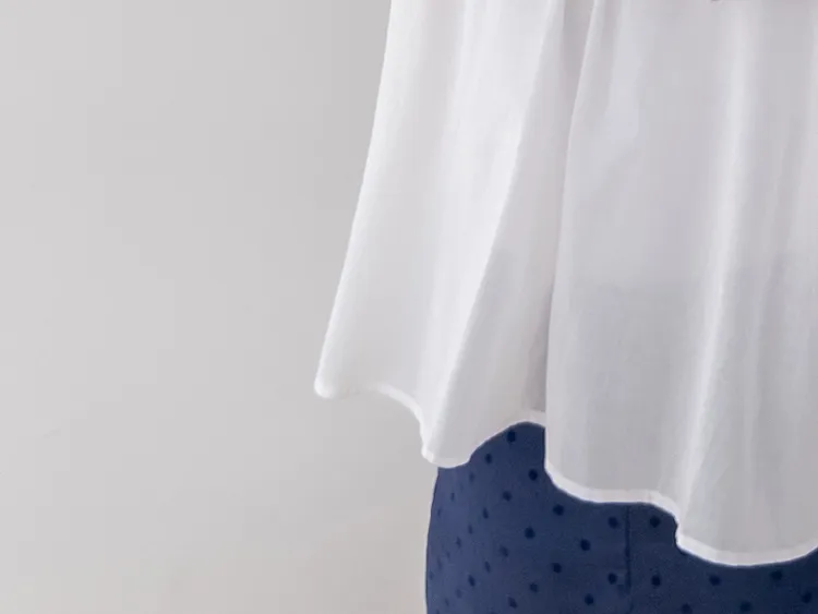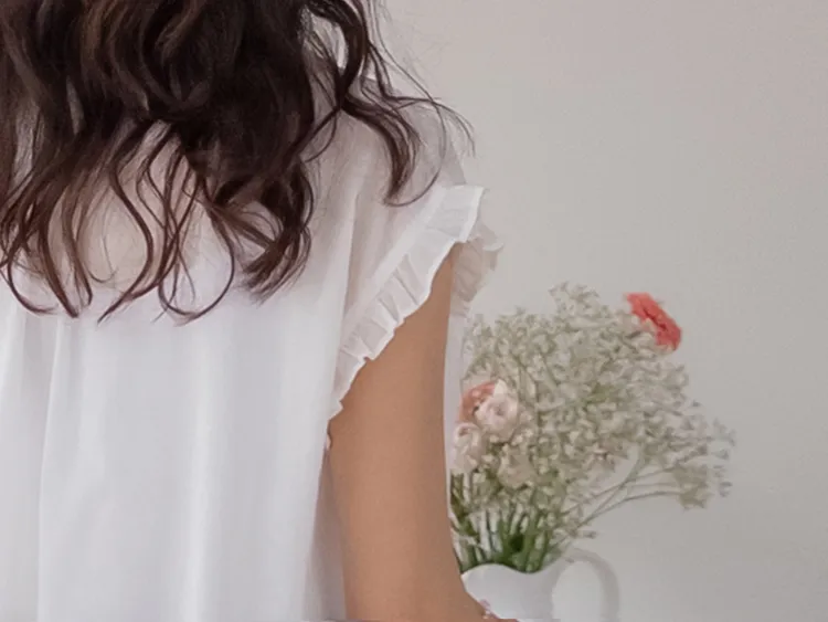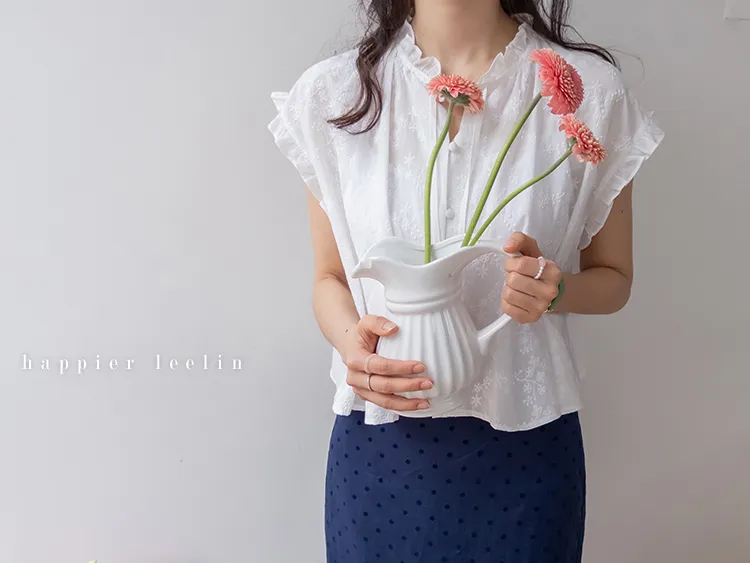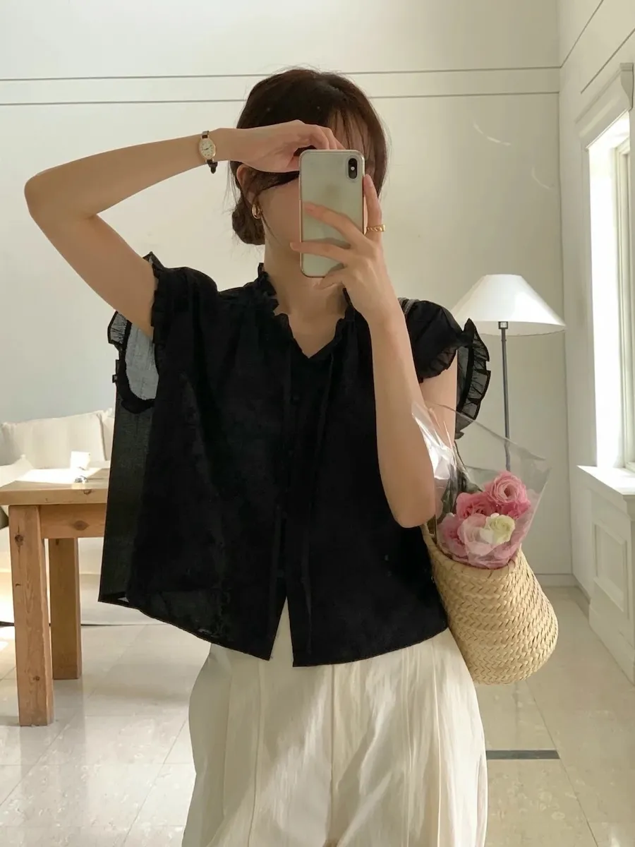 浪漫情調領口袖末摺邊刺繡蕾絲蓋袖排扣上衣