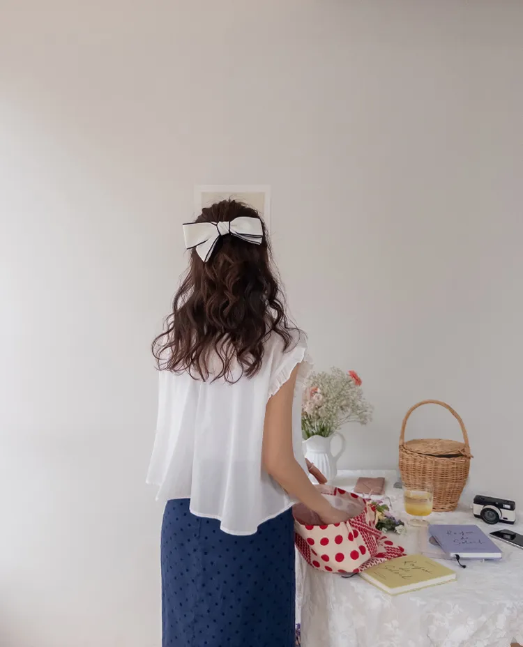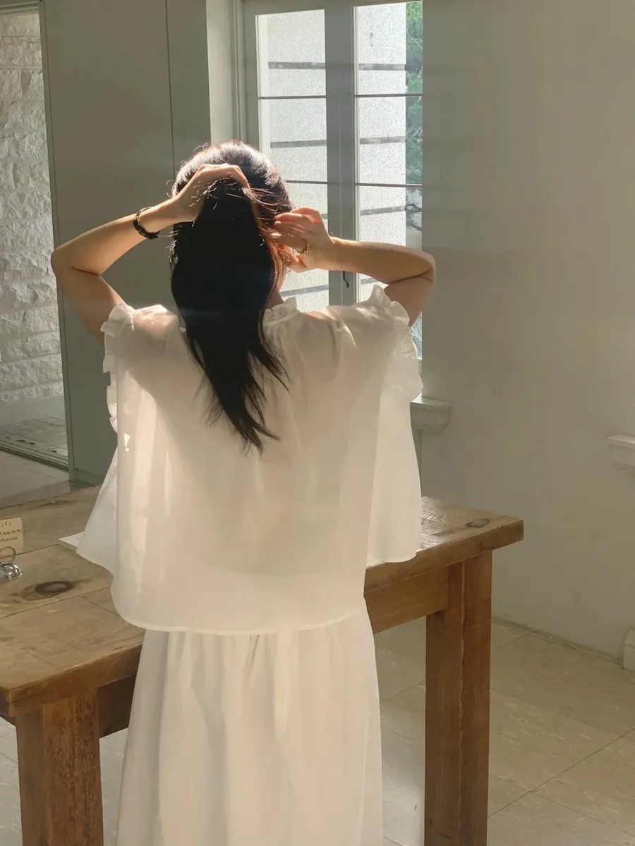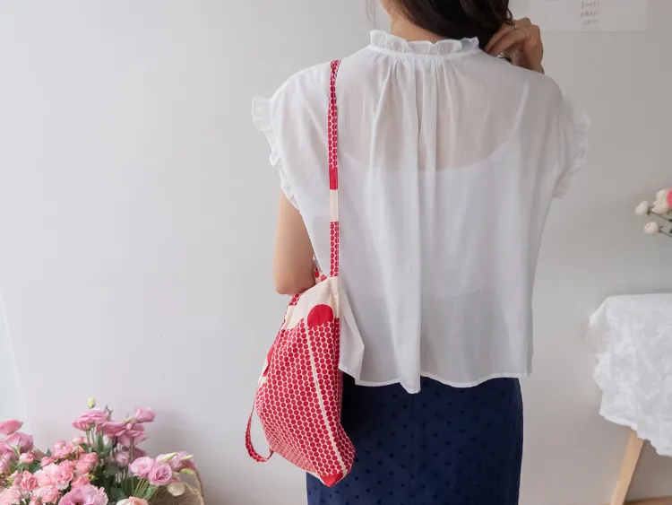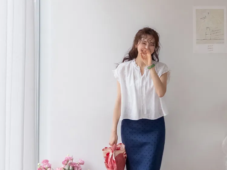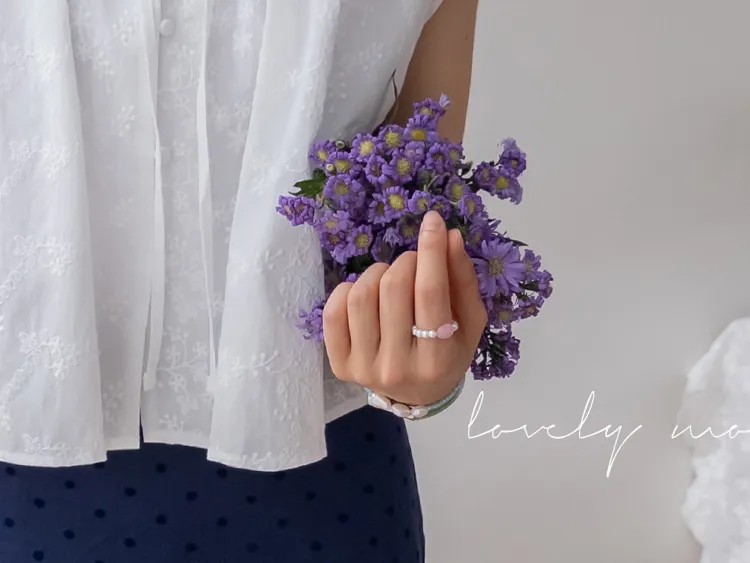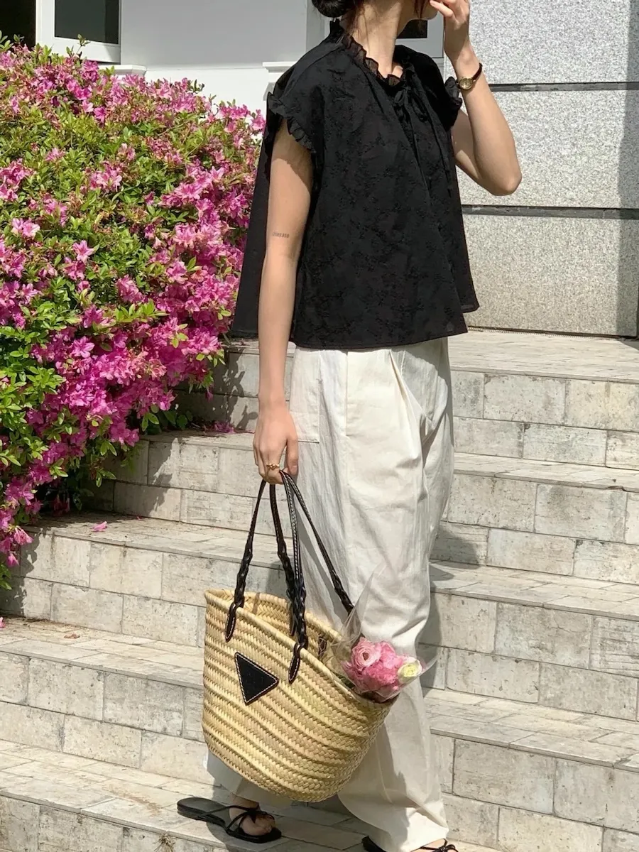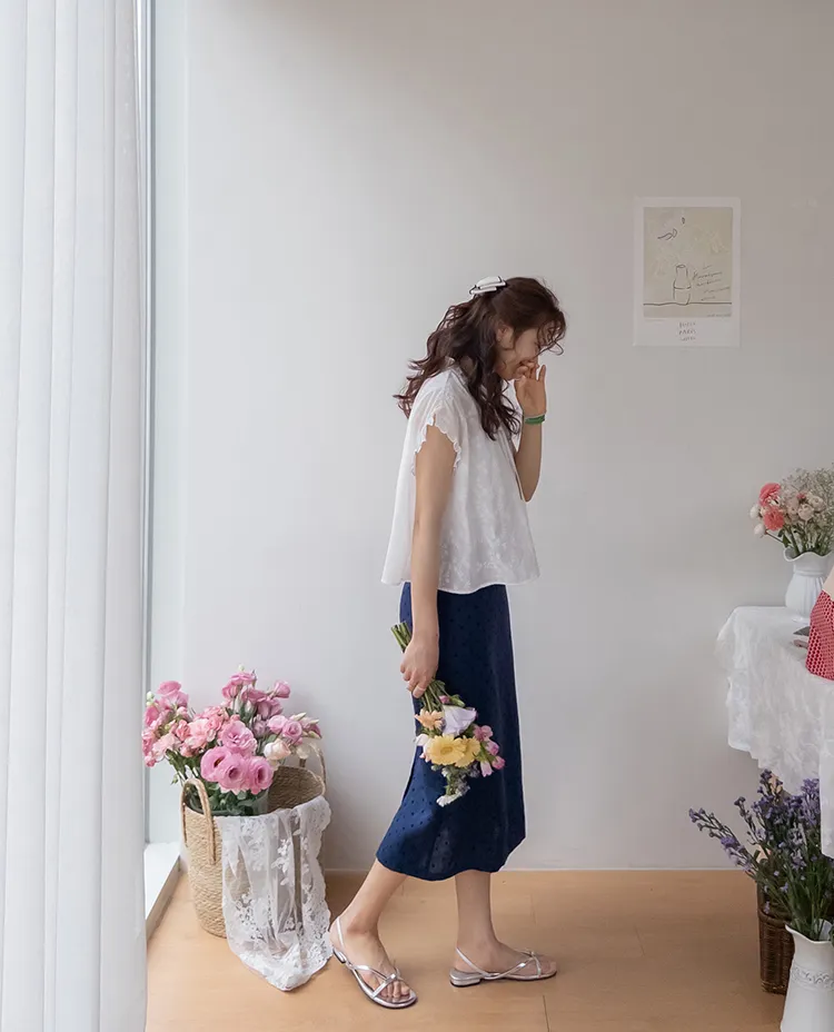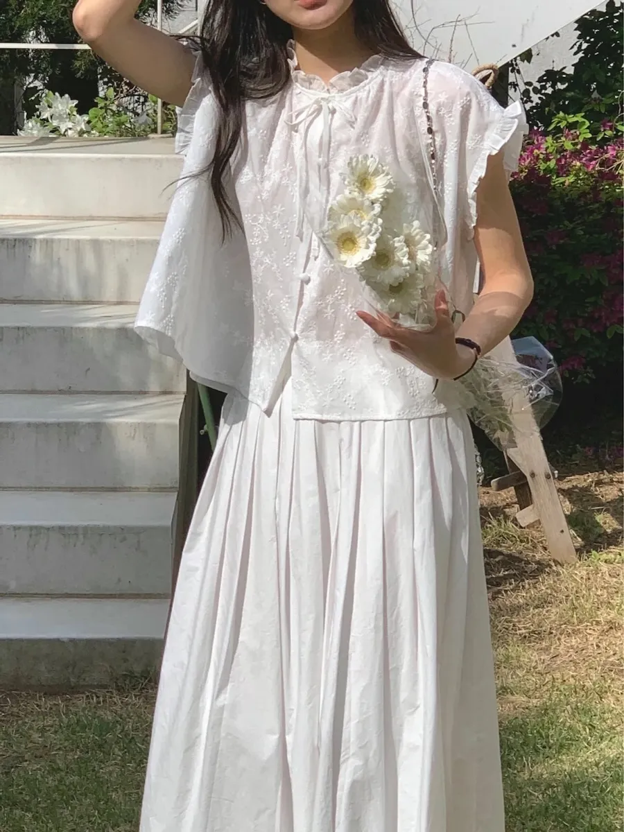 浪漫情調領口袖末摺邊刺繡蕾絲蓋袖排扣上衣
