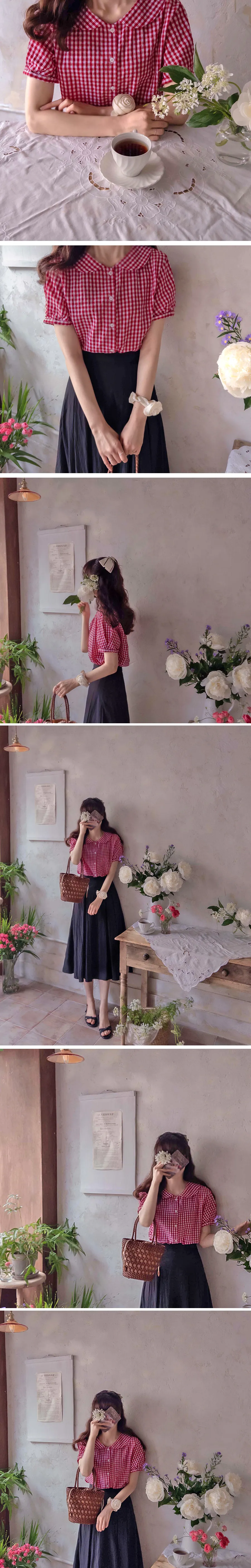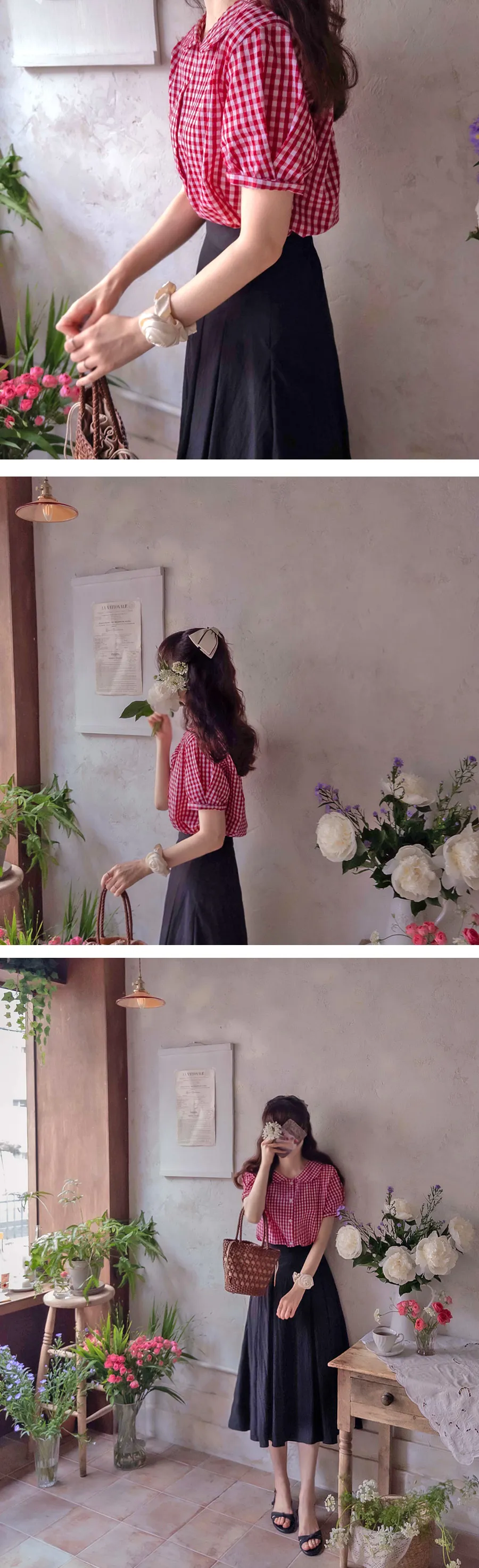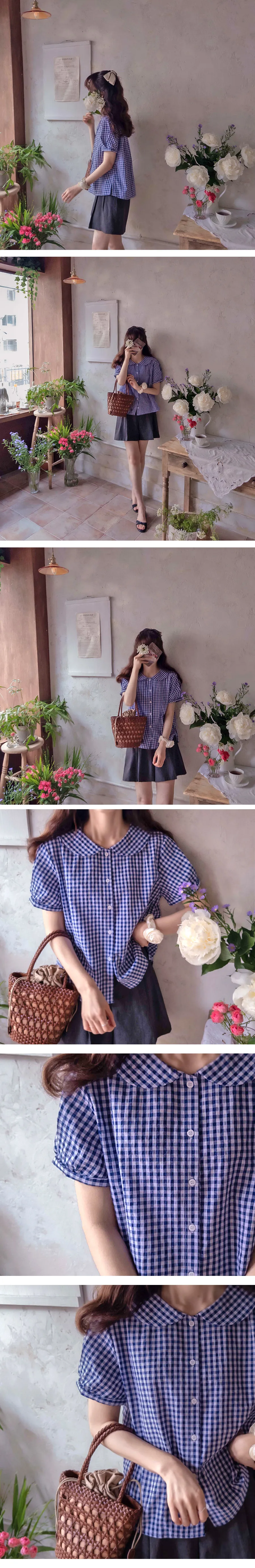 【帶有細微褶皺的夏季布料】 【圓領營造優雅氛圍】 【格紋圖案,帶來活潑感】 【褶襉縫線的漂亮鬱金香袖】 【百搭性極佳】 【格紋圖案的優雅排扣上衣】