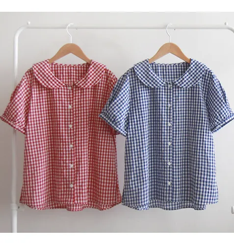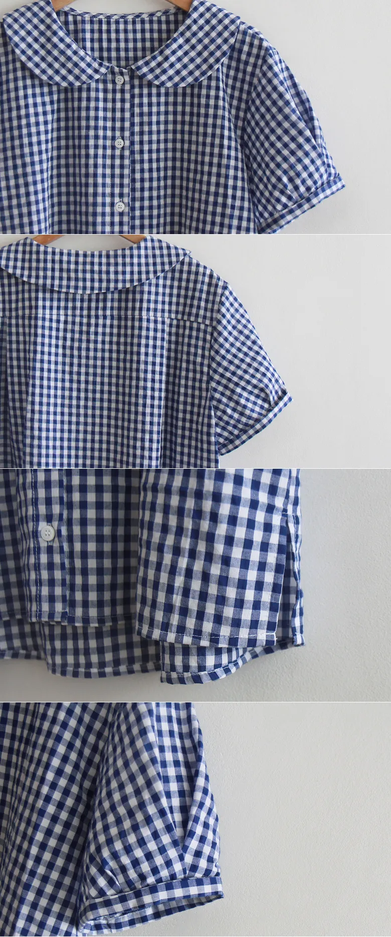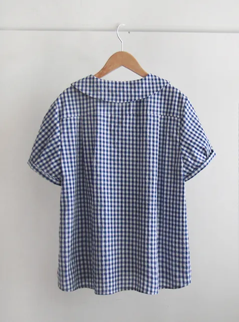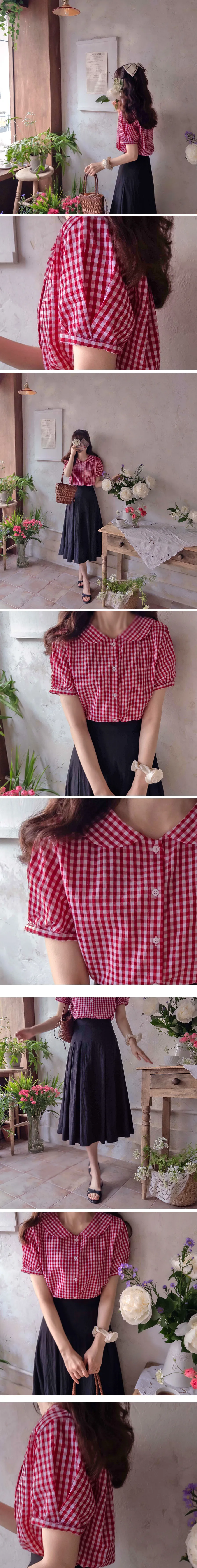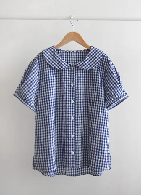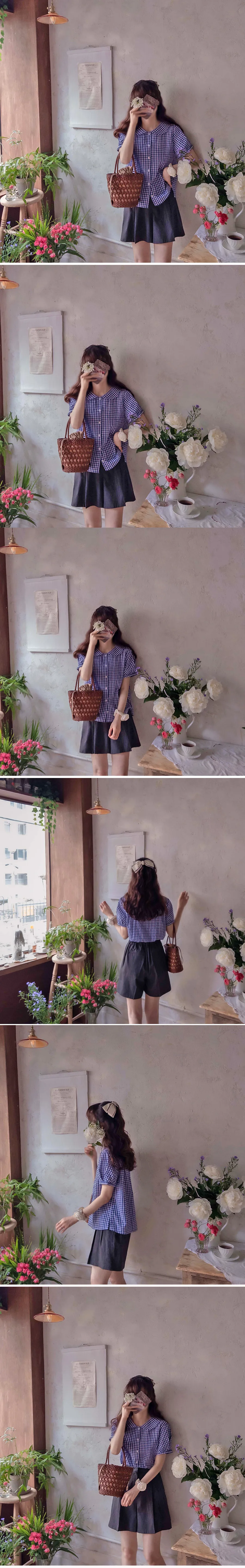【帶有細微褶皺的夏季布料】 【圓領營造優雅氛圍】 【格紋圖案,帶來活潑感】 【褶襉縫線的漂亮鬱金香袖】 【百搭性極佳】 【格紋圖案的優雅排扣上衣】