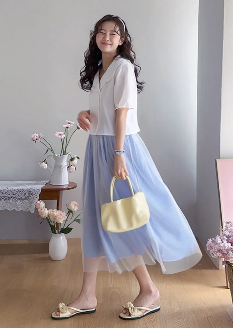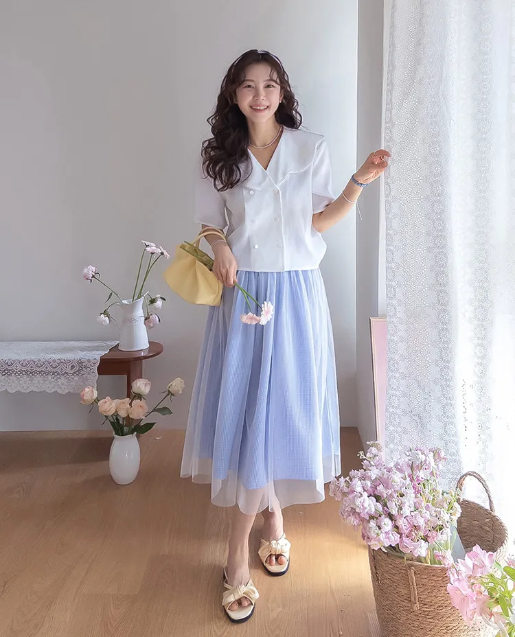 迷人氛圍兩穿精緻網紗格紋彈性中長裙