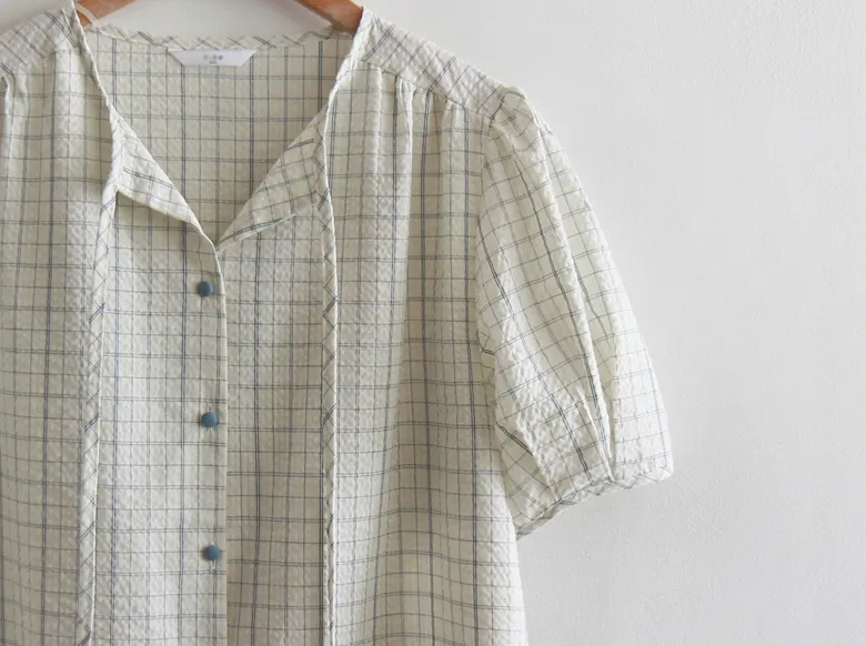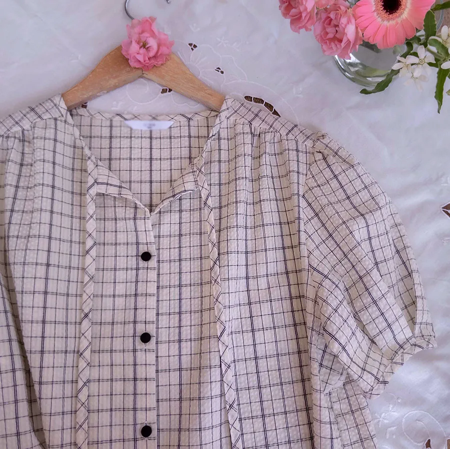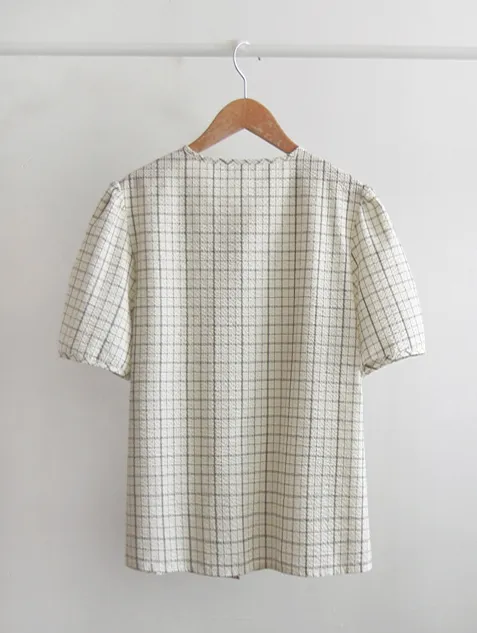 【夏季泡泡紗布料,略帶褶皺】 【繫上領口蝴蝶結,更顯優雅氣質】 【格紋圖案增添活潑感】 【褶襉設計,搭配泡泡袖的優美線條,更顯可愛氣質】【接下來的季節,依然可以清涼穿著,百搭性十足】
