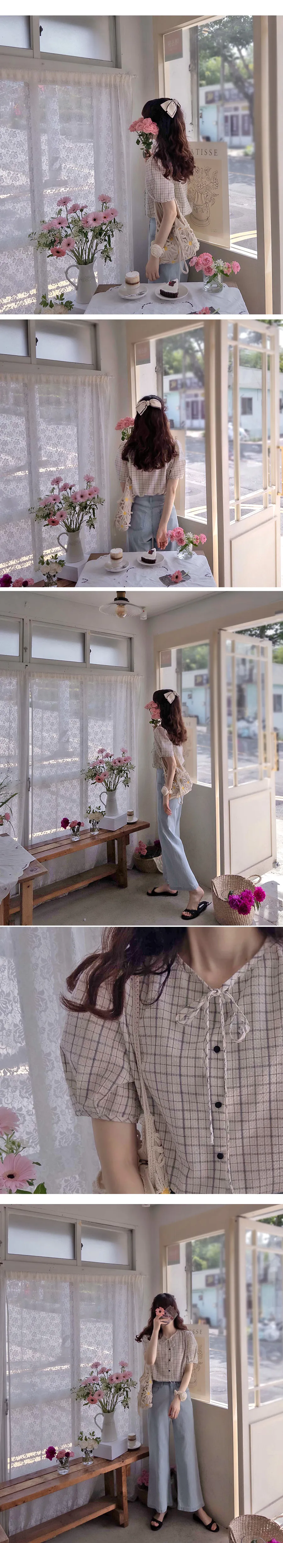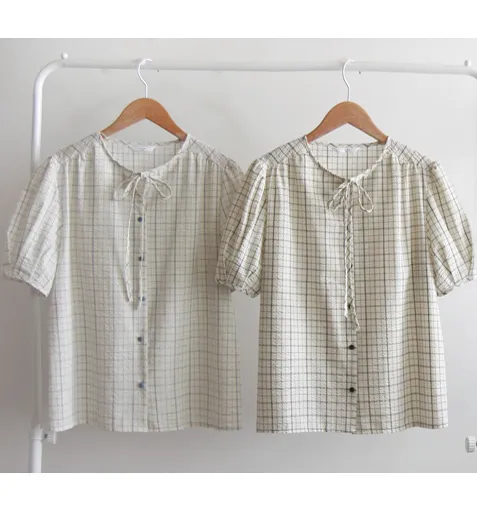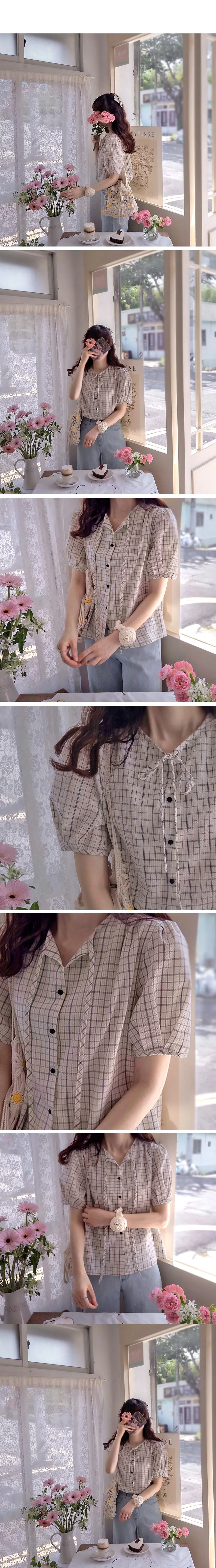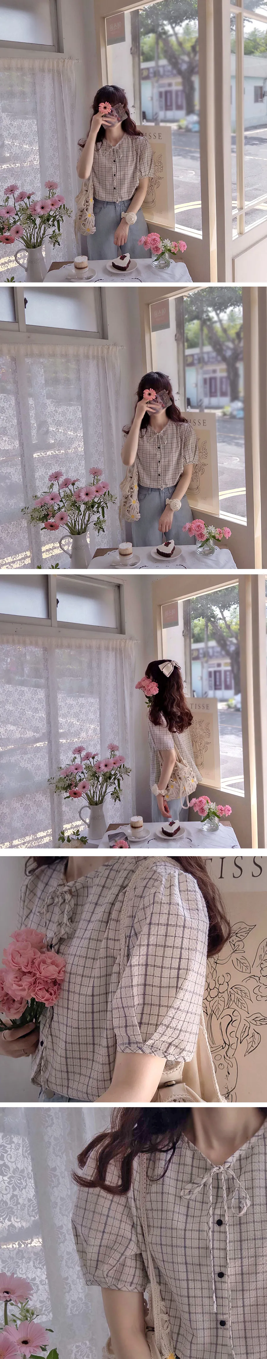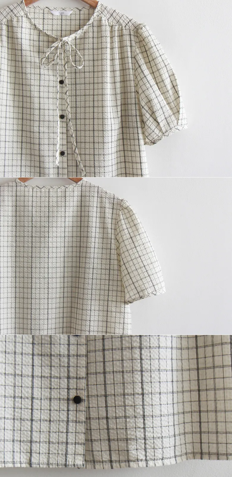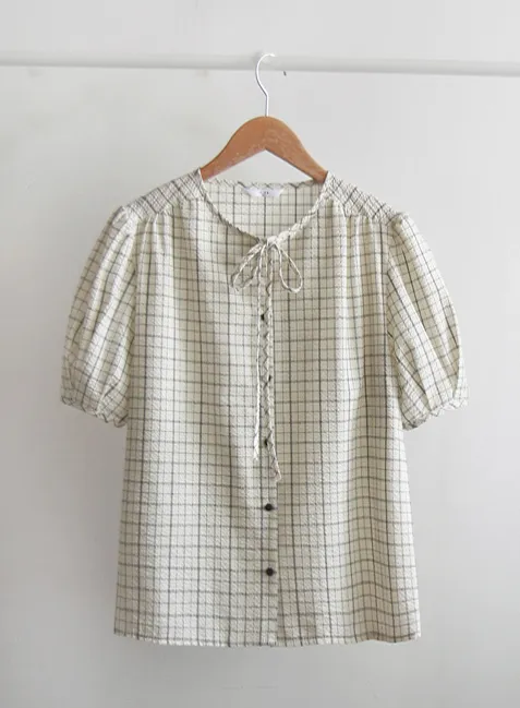 可愛氣質領口綁帶泡泡紗格紋排扣上衣