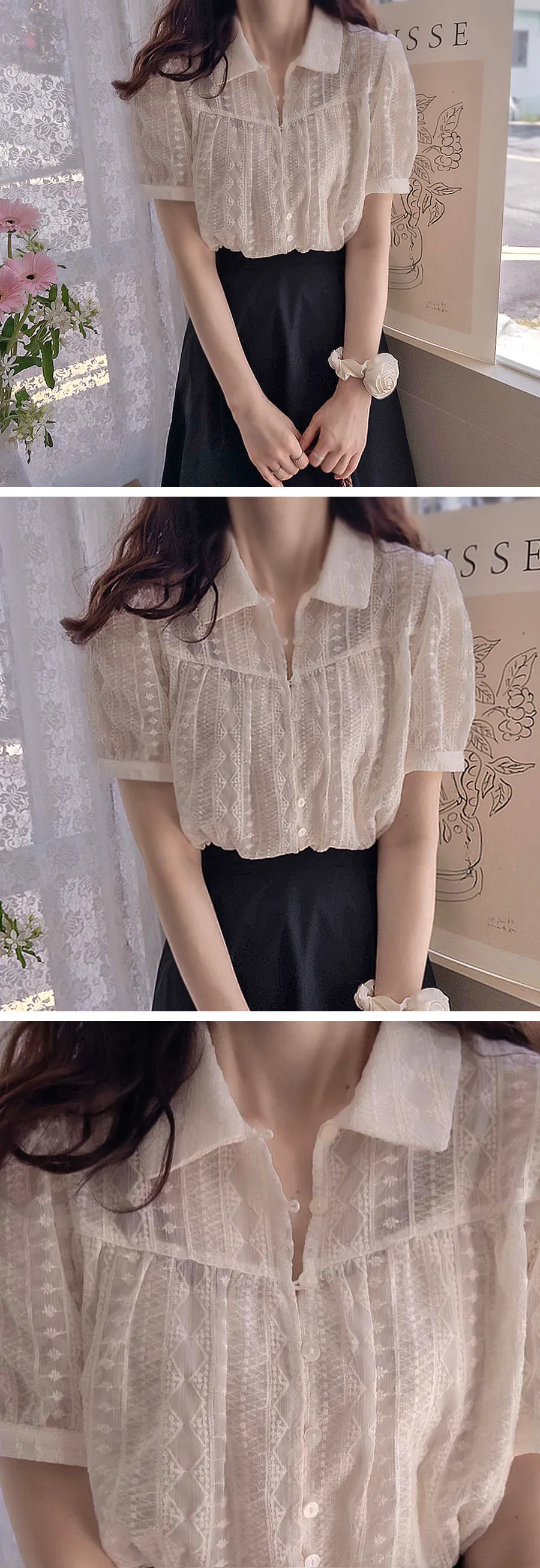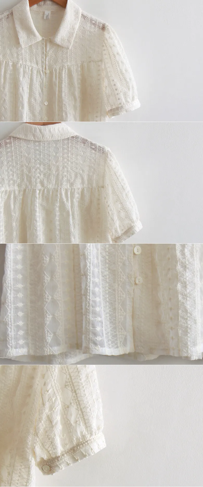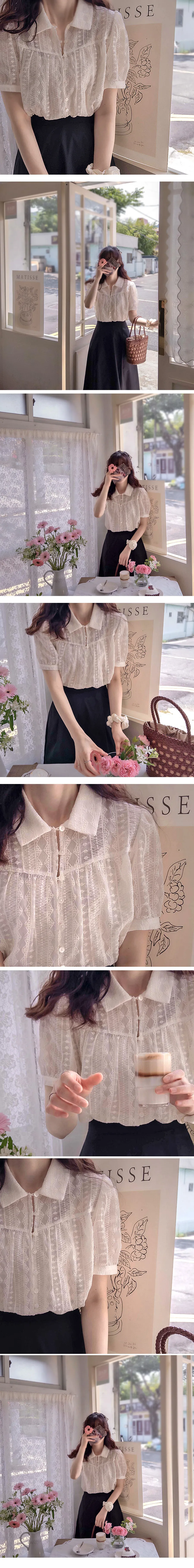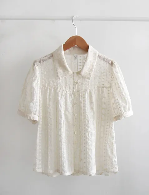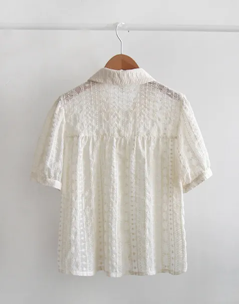 [可愛的花朵刺繡設計] [適合夏季的清涼修身排扣上衣] [明亮的配色,穿著優雅] [作為季節修身上衣,帶有可愛的花朵刺繡設計]