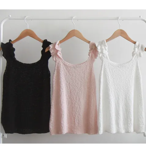 【肩部內側:帶狀處理】【夏季帶狀設計為亮點,營造可愛氛圍的針織】【明亮精緻的色彩,優雅迷人的針織】【推薦適合夏季穿搭的無袖針織】