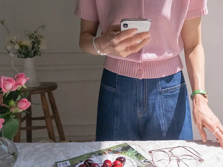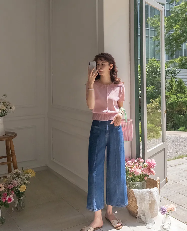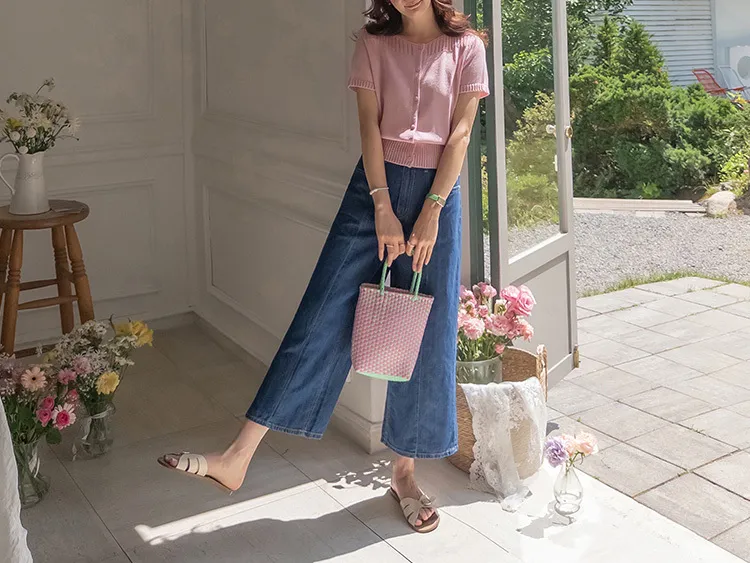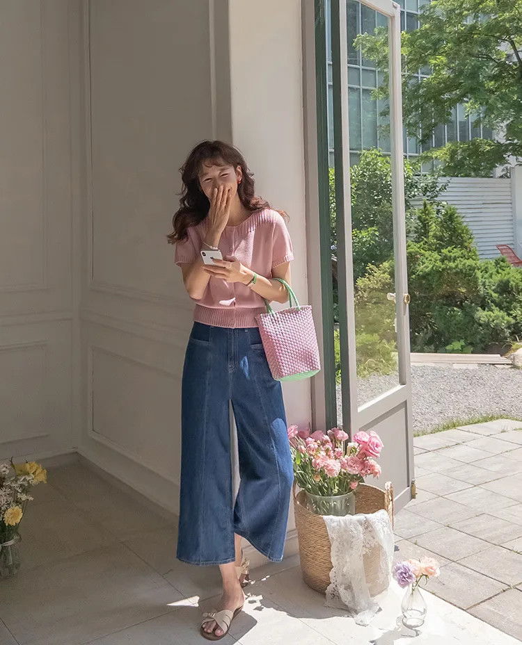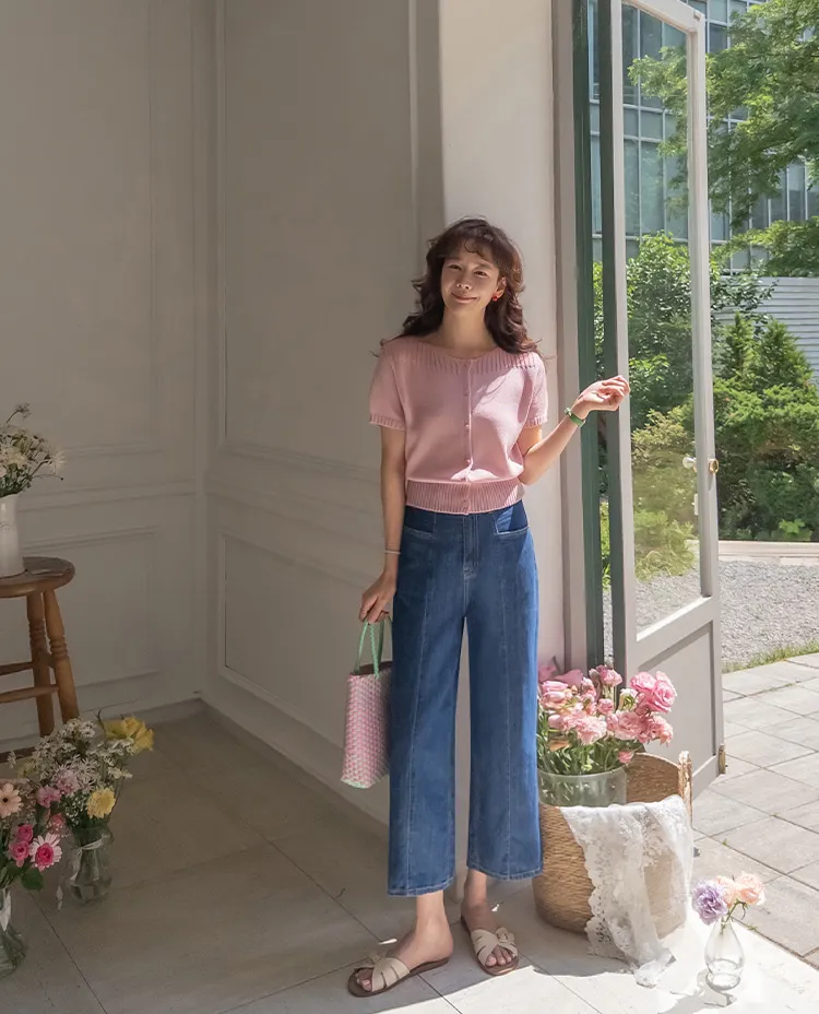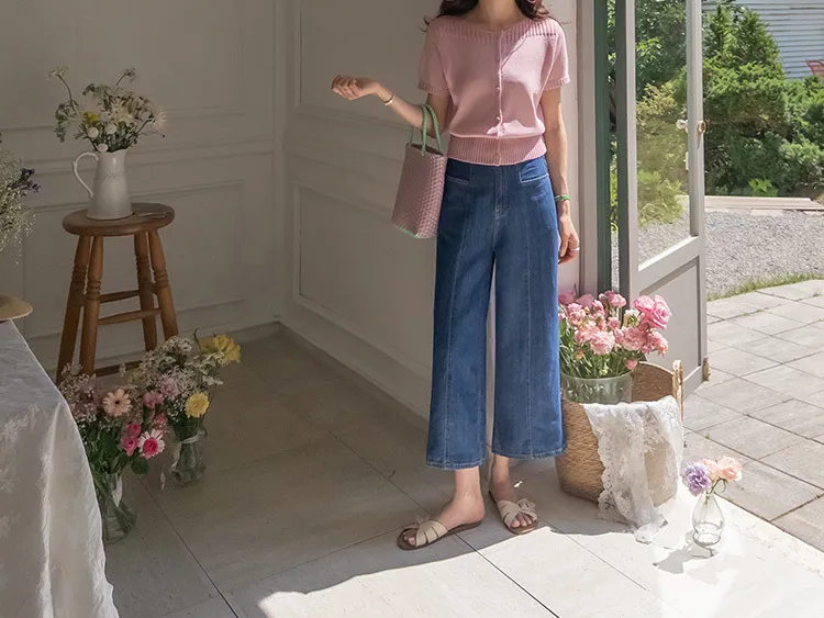 活潑八分獨特橫向口袋垂直縫線剪裁牛仔褲