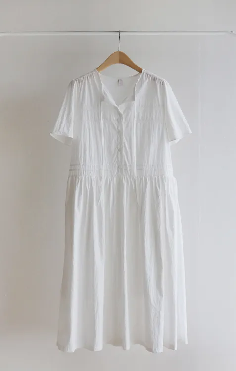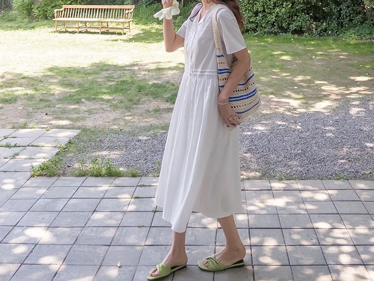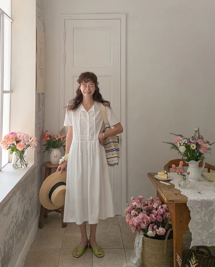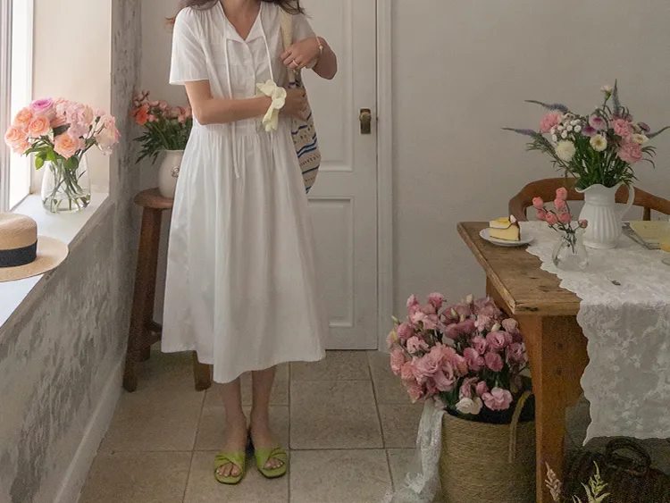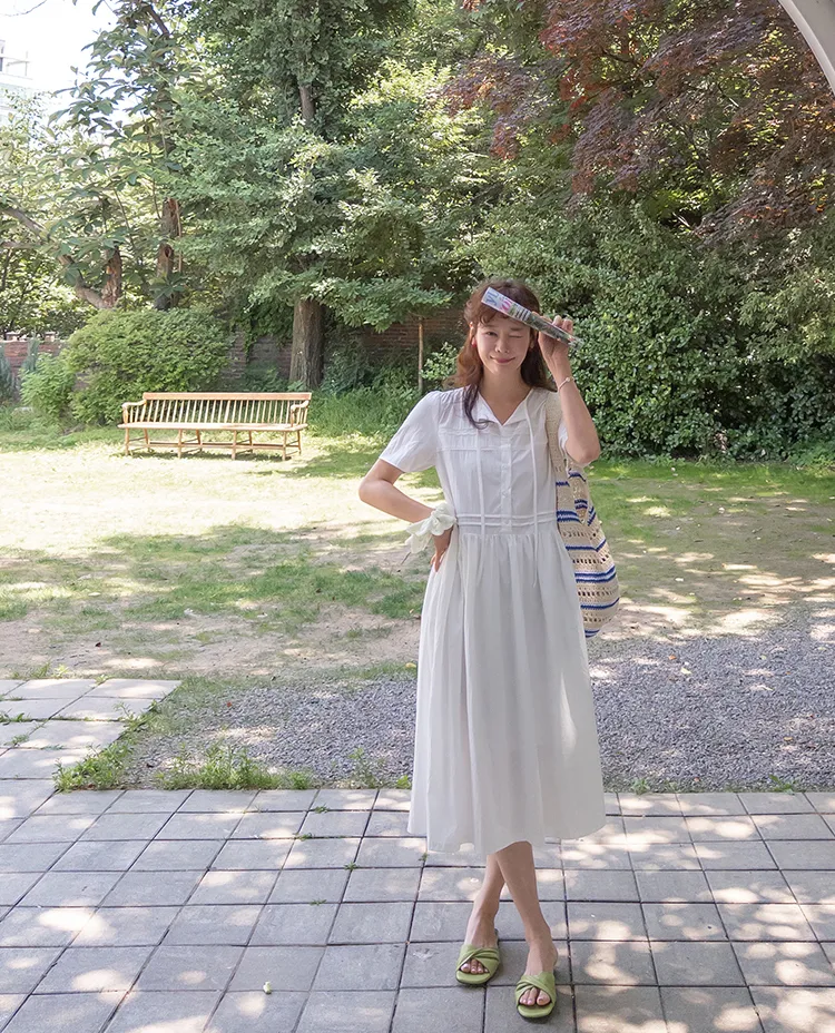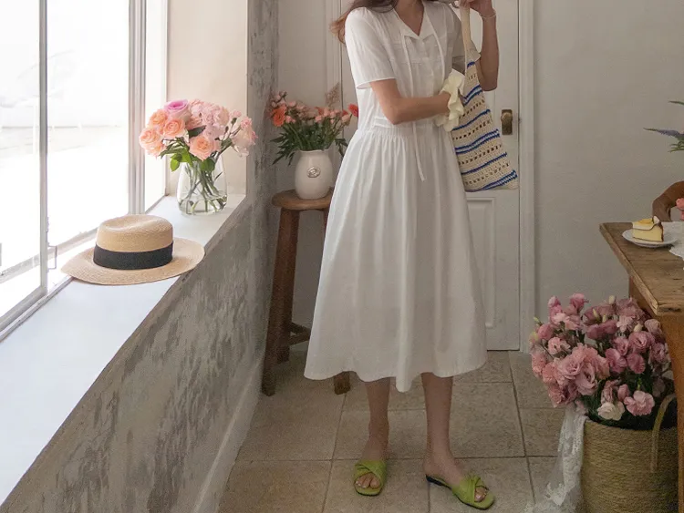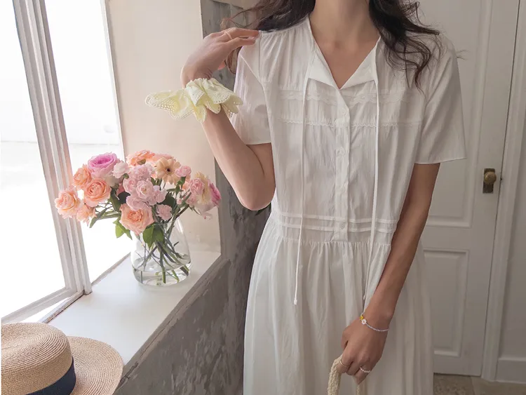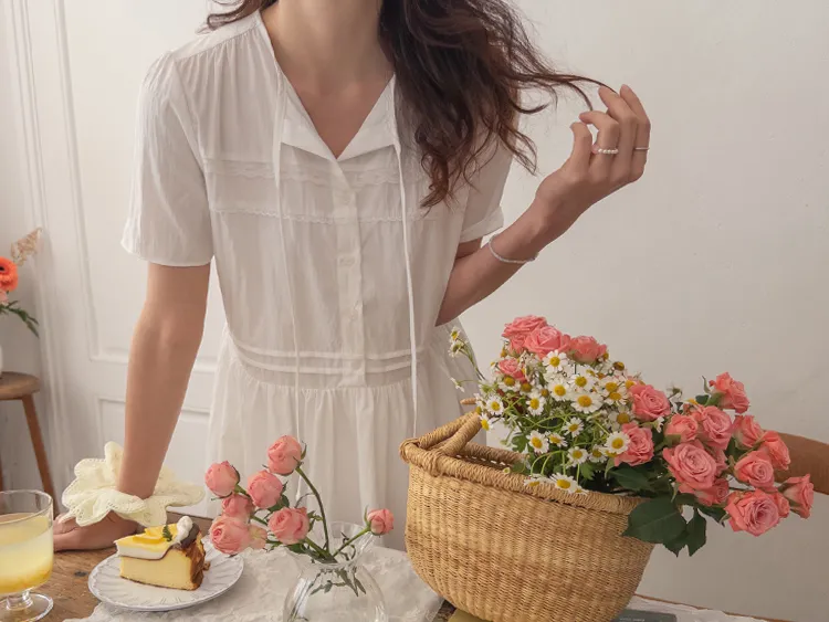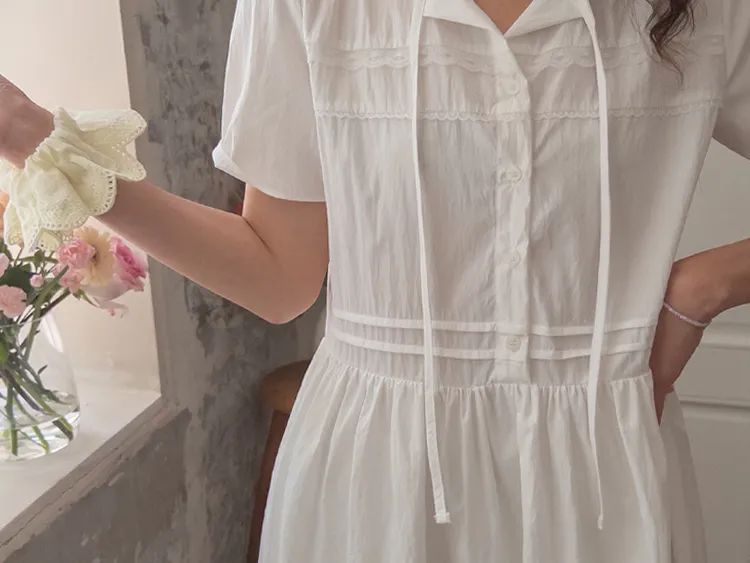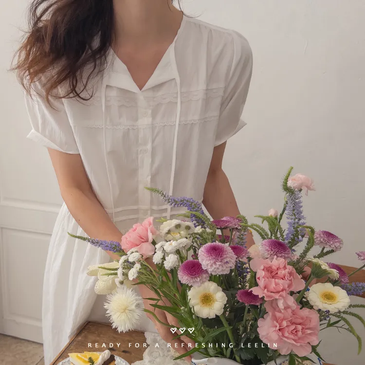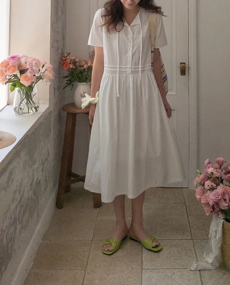 【浪漫領口繫綁帶點綴清涼夏日連身裙】 【零皺布料】 【寬鬆版型完美修飾身形! 】 【精緻蕾絲點♥】