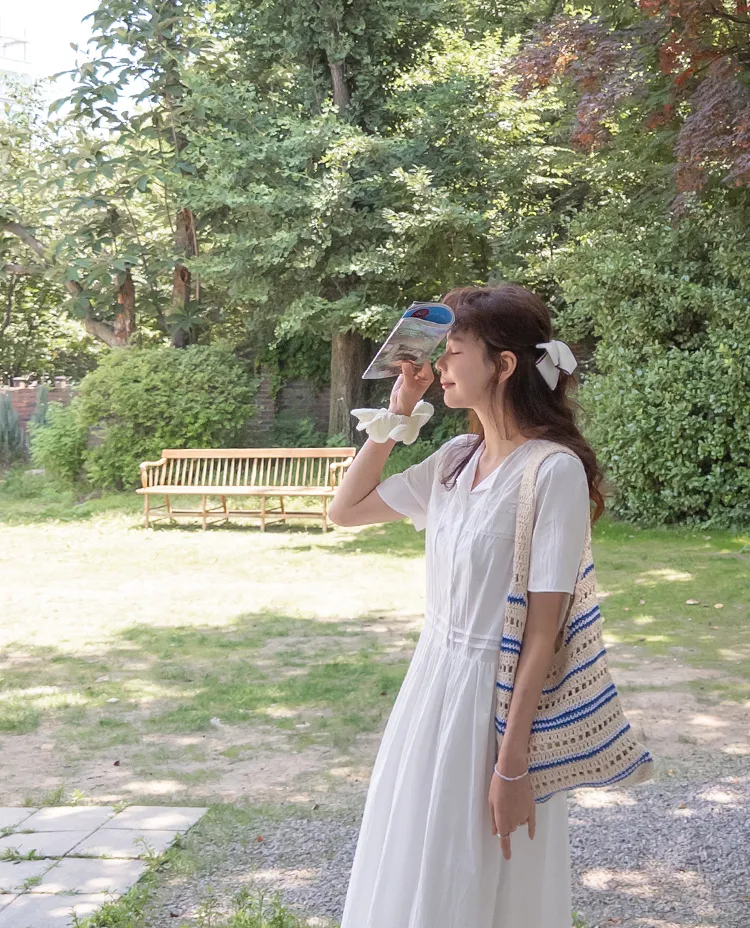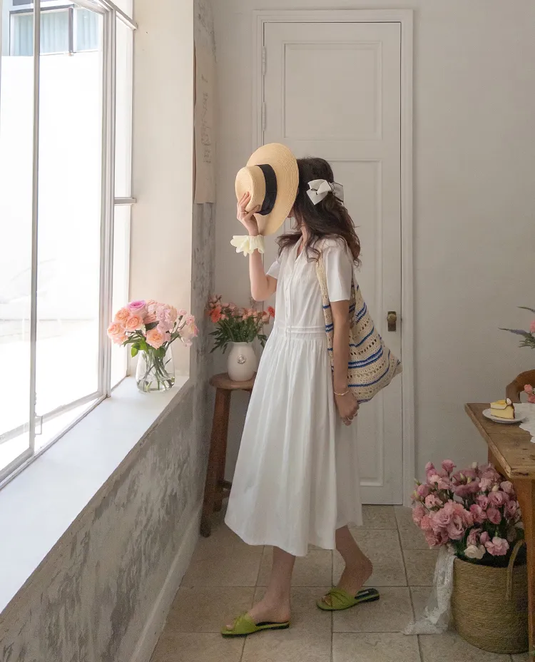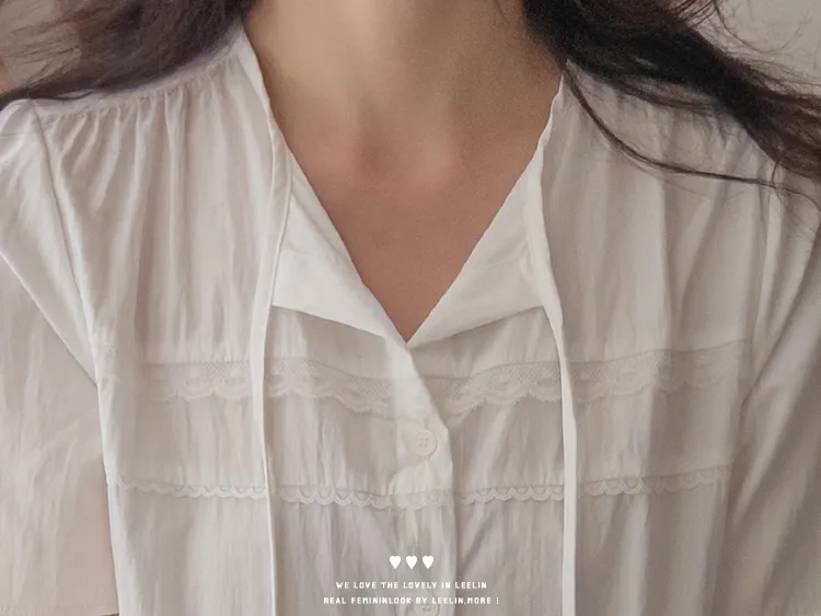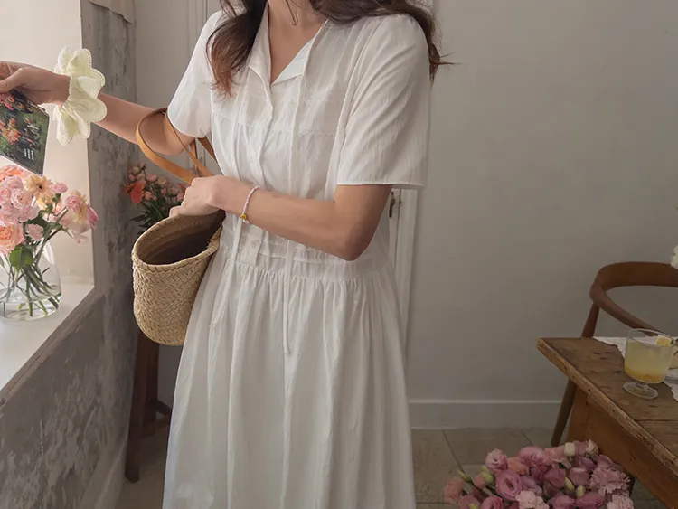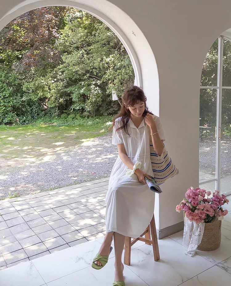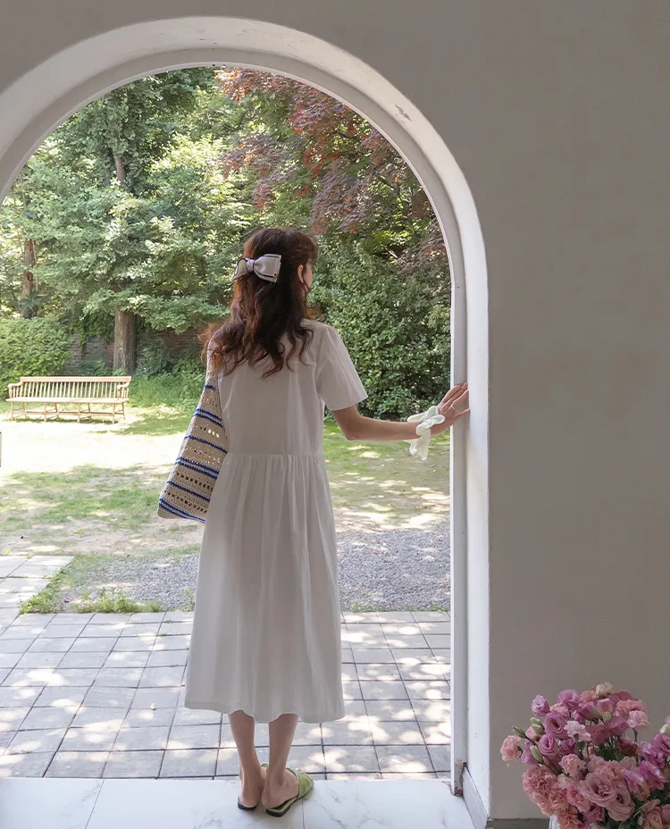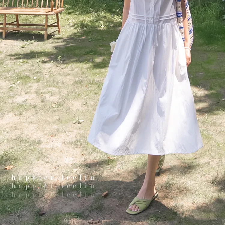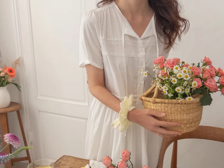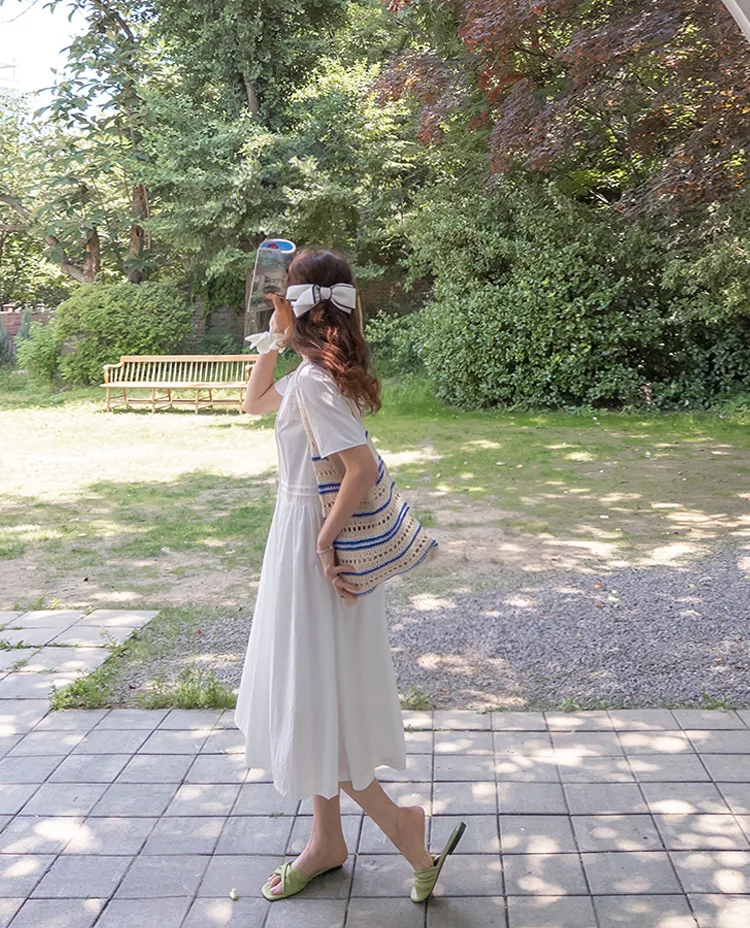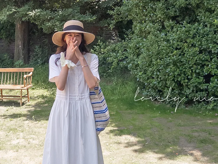 【浪漫領口繫綁帶點綴清涼夏日連身裙】 【零皺布料】 【寬鬆版型完美修飾身形! 】 【精緻蕾絲點♥】