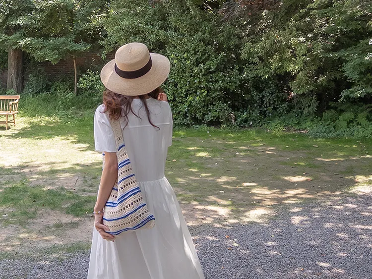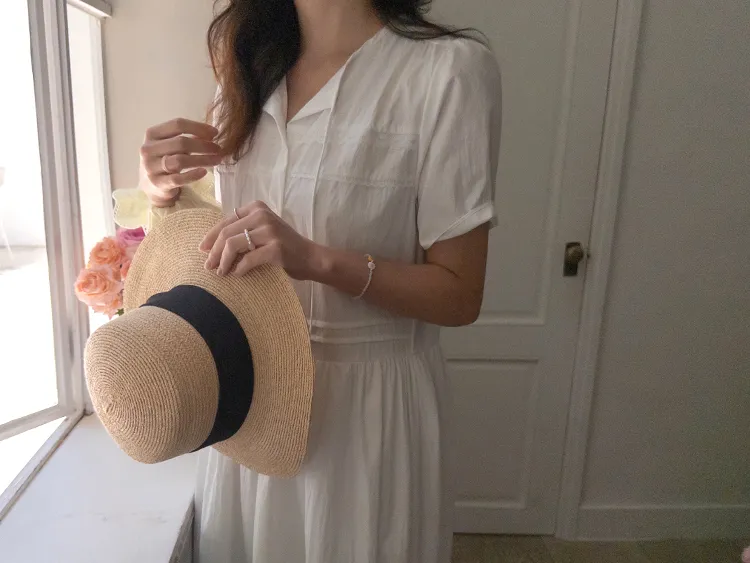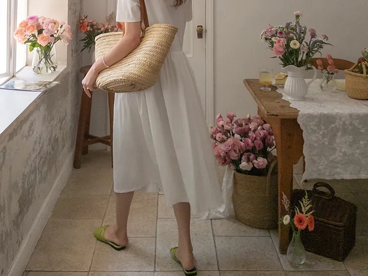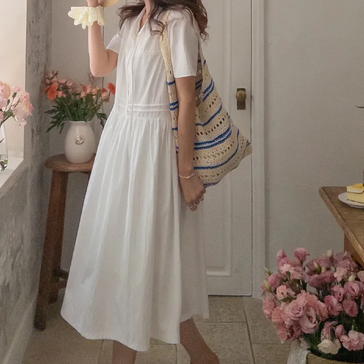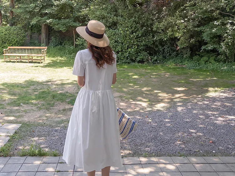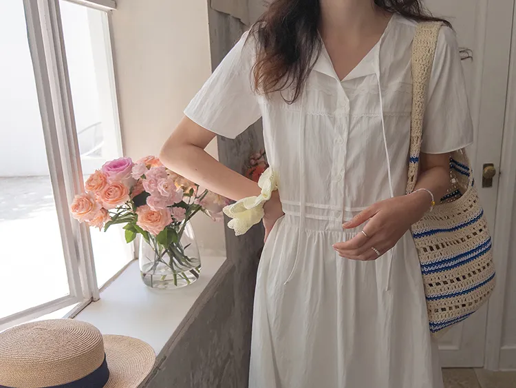 夏日蕾絲襯邊點綴領口綁帶A字輪廓寬版連身裙