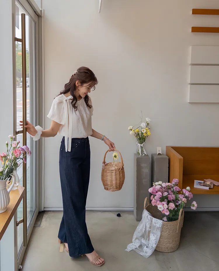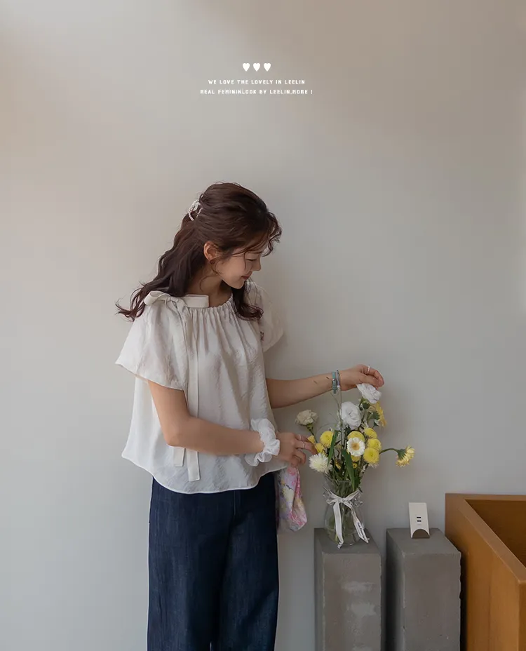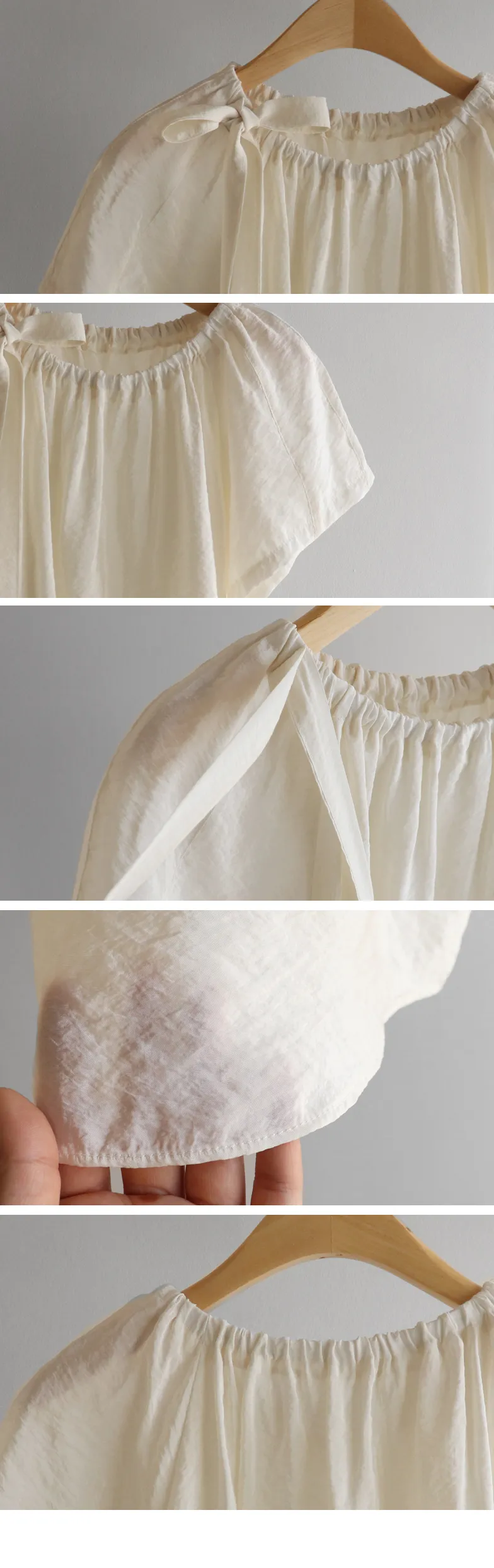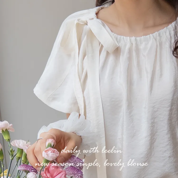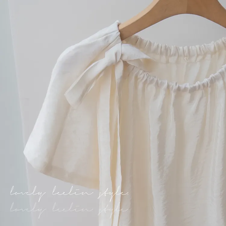 [輕盈而涼爽的綁帶上衣♥] [領口綁帶和蝴蝶結細節] [日常生活中無皺紋〜! ] [完美遮蓋手臂,纖細線條]
