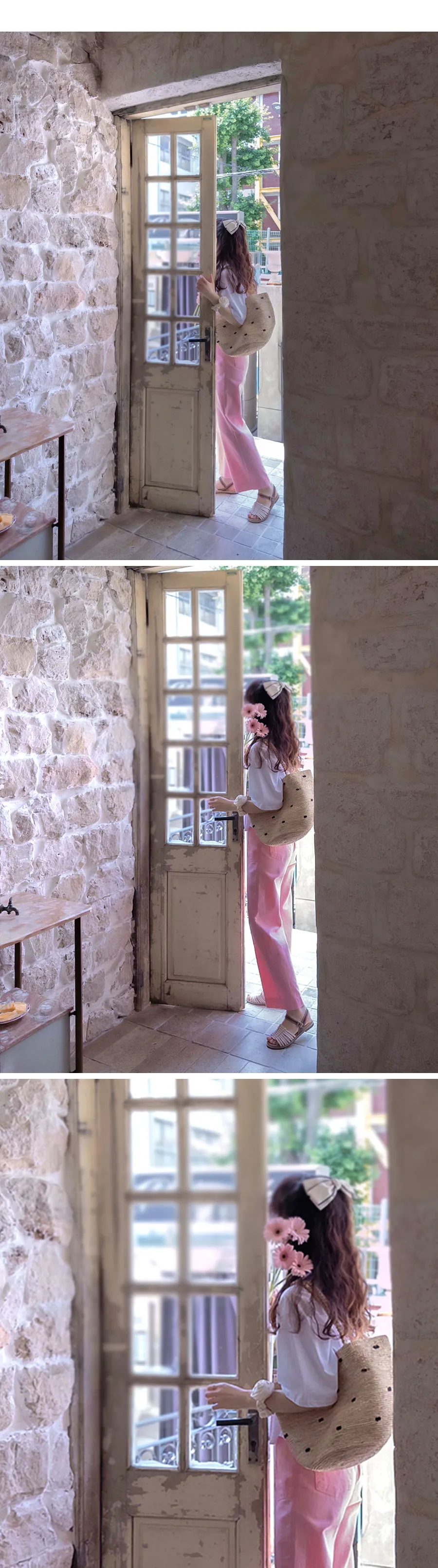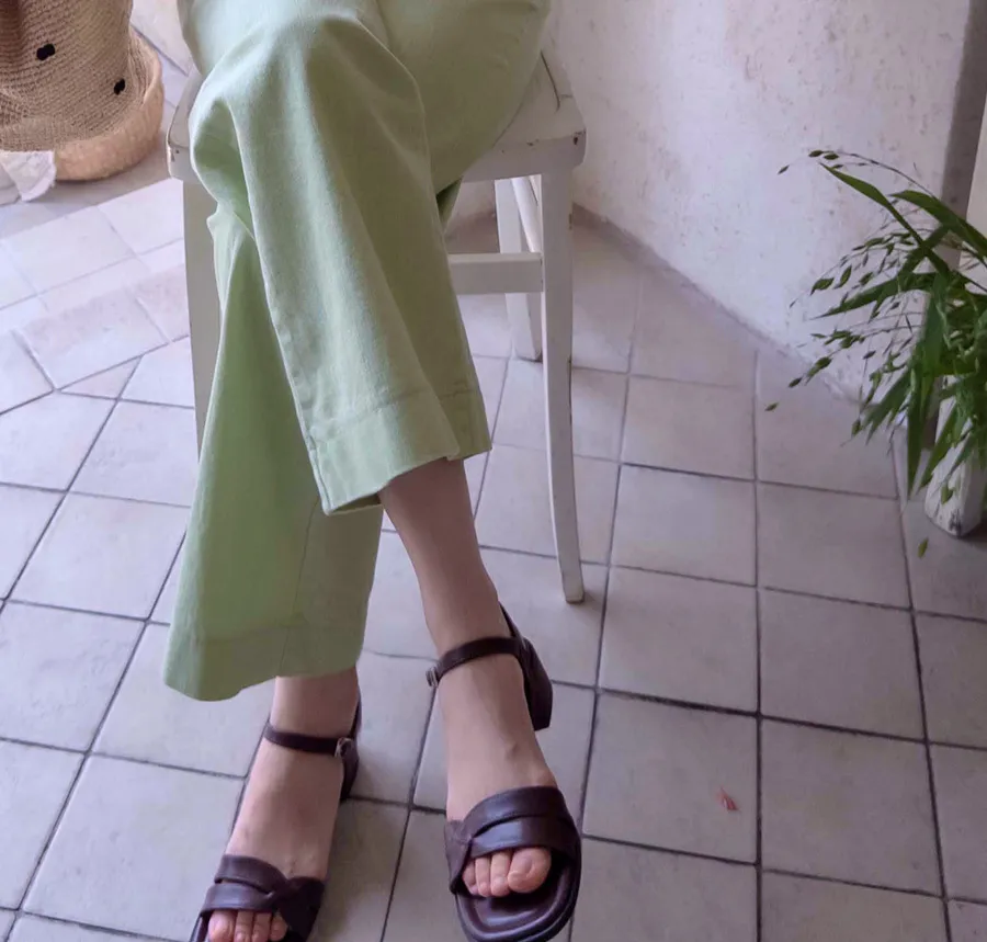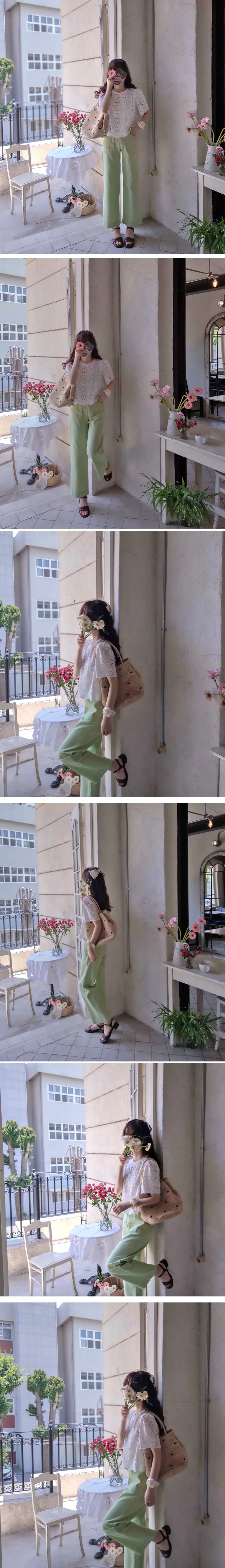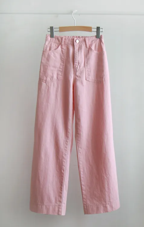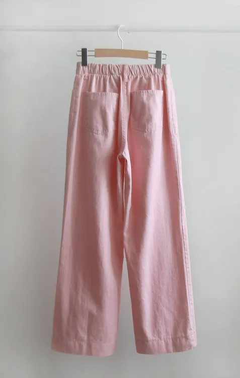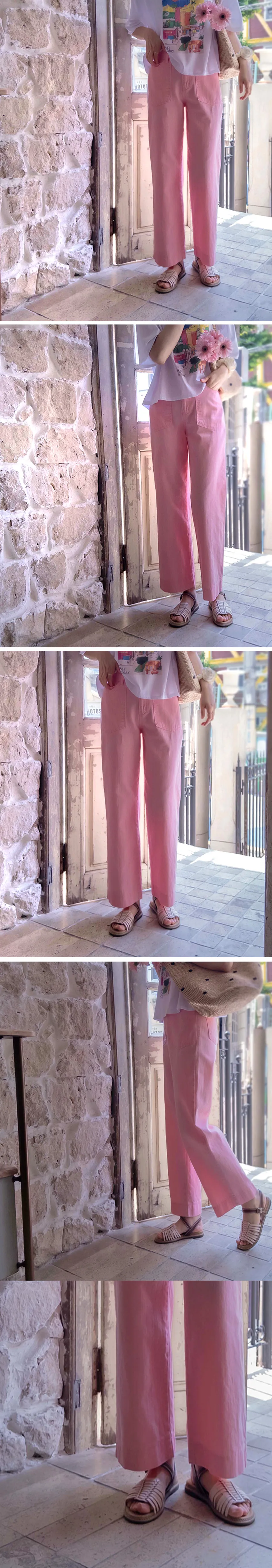 [95%棉、5%亞麻的涼爽面料] [後腰處有舒適彈性帶] [夏季邊緣合身褲,顏色柔和明亮] [兩側有口袋的簡約設計] [推薦作為夏季褲子,穿著舒適,手感好]