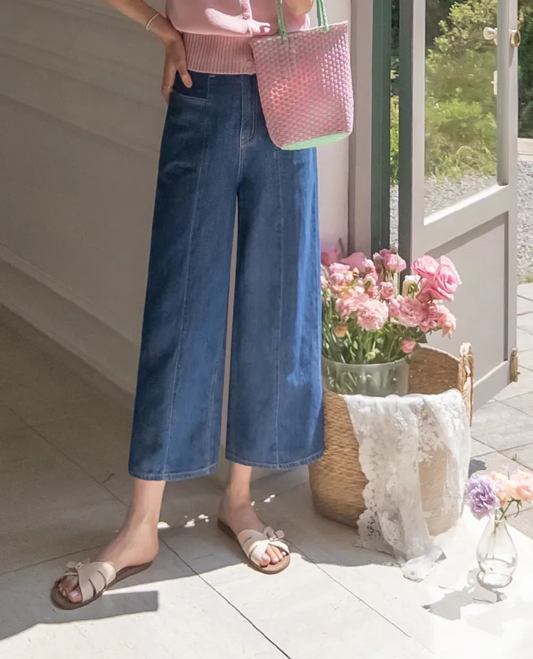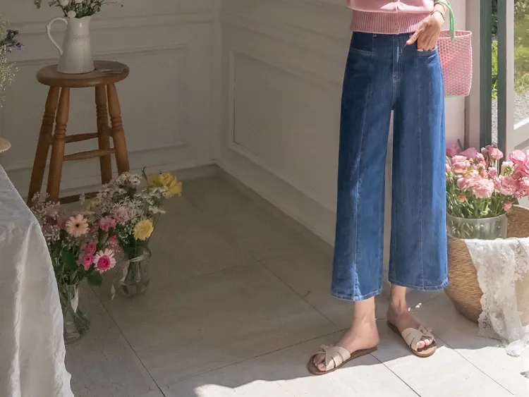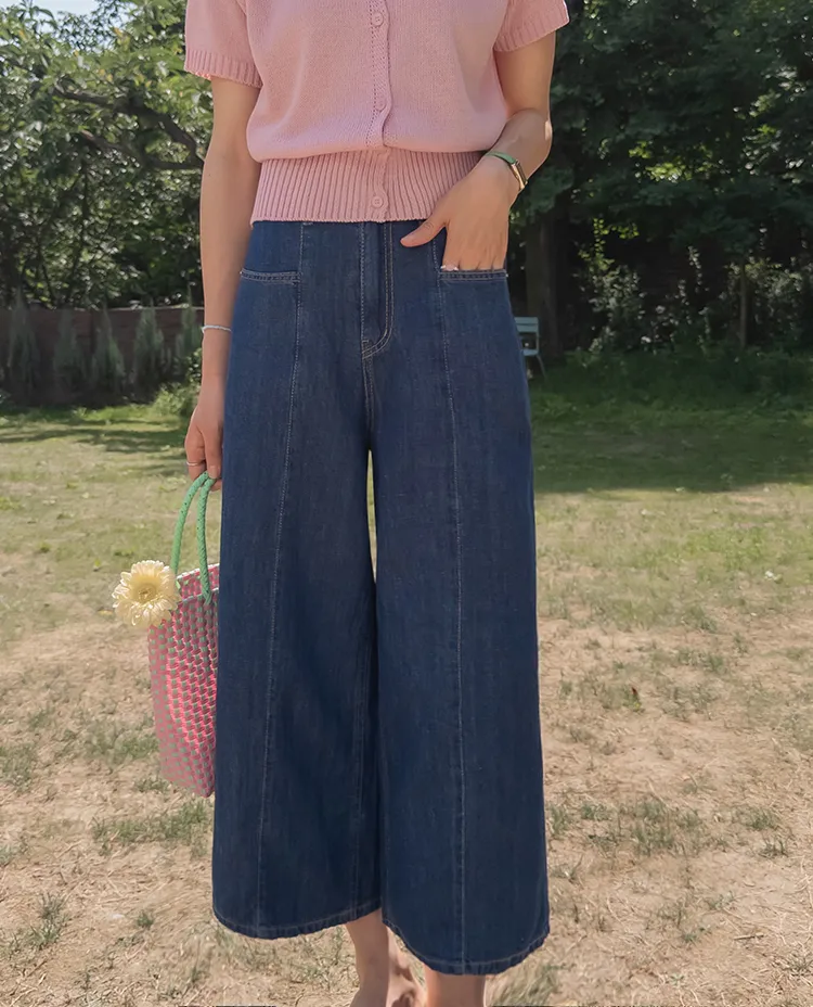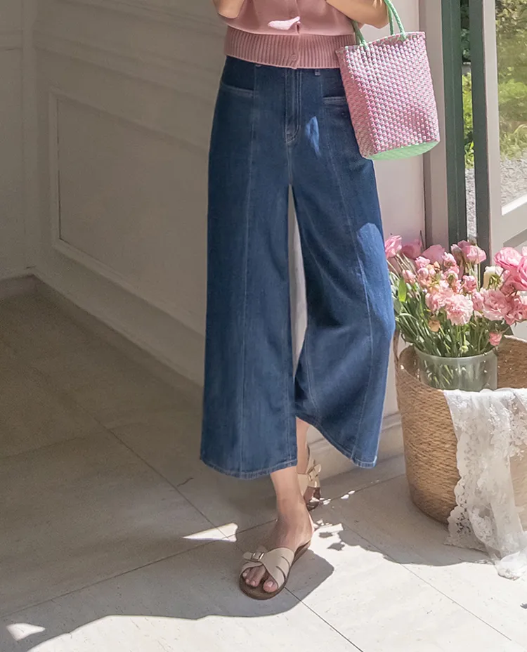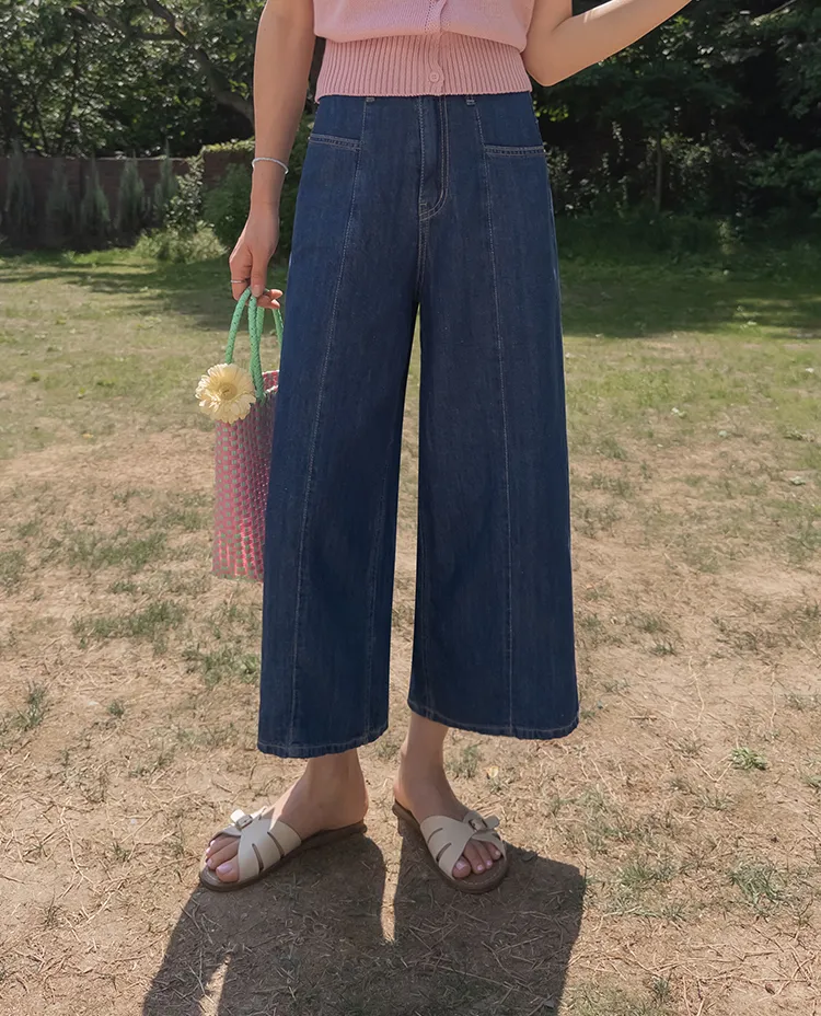 活潑八分獨特橫向口袋垂直縫線剪裁牛仔褲