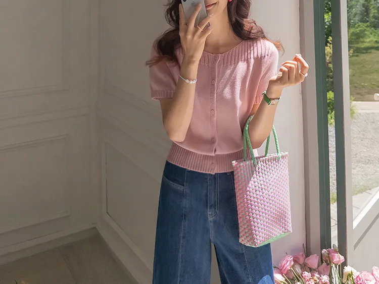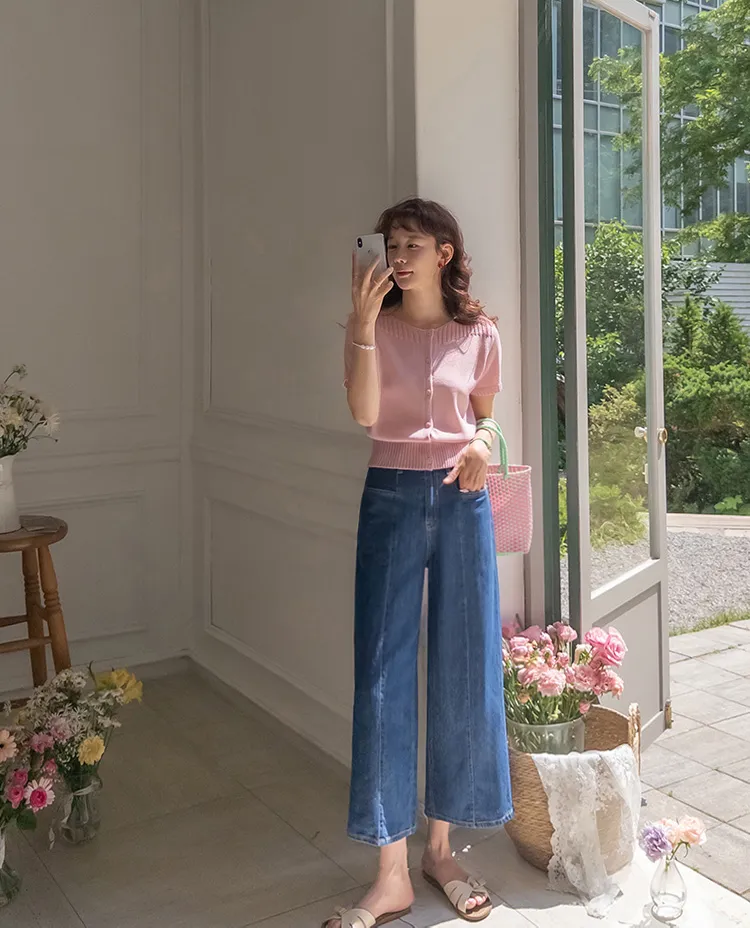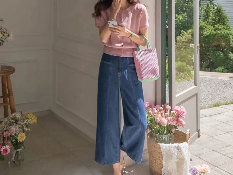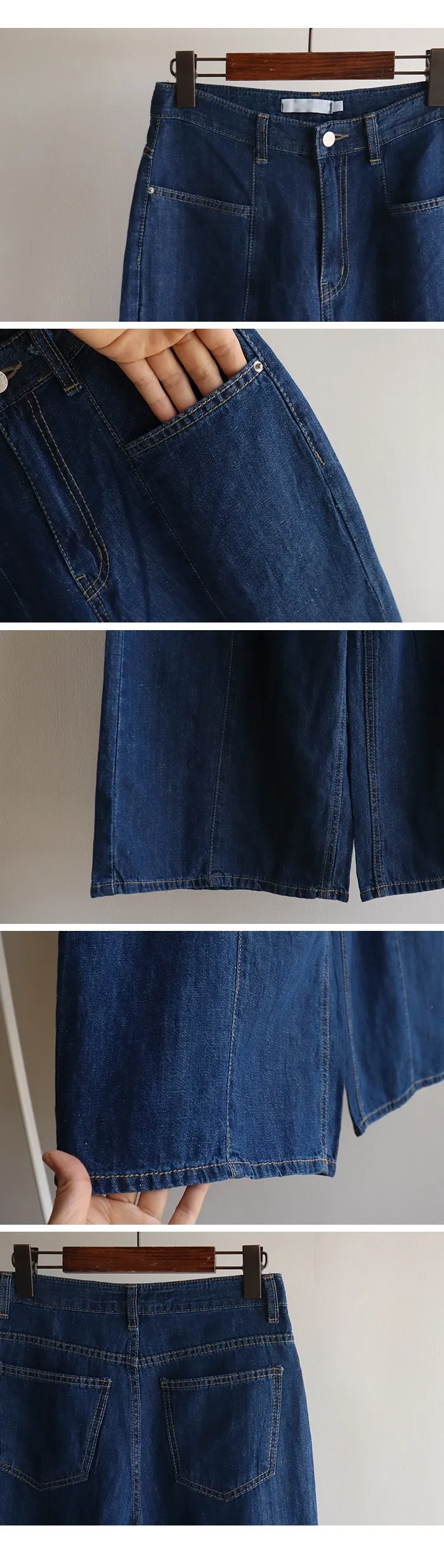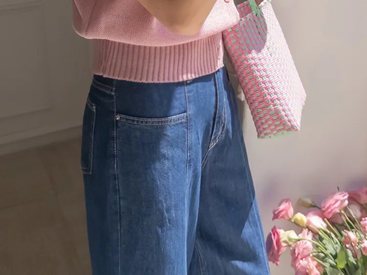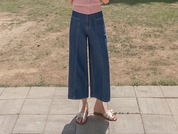 活潑八分獨特橫向口袋垂直縫線剪裁牛仔褲