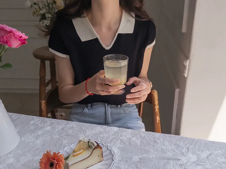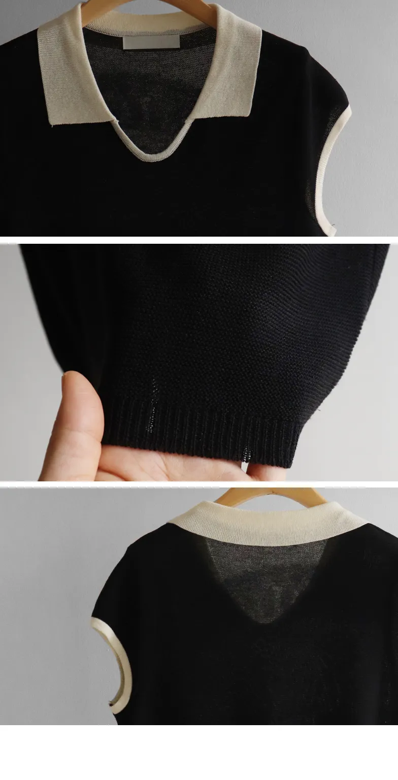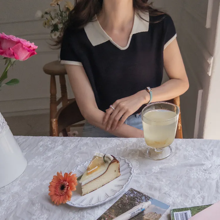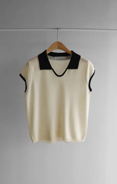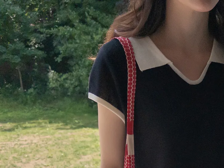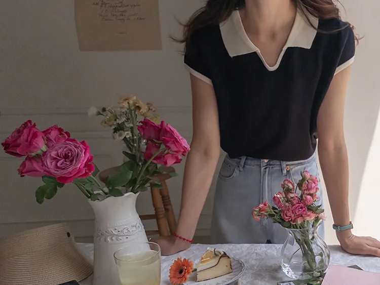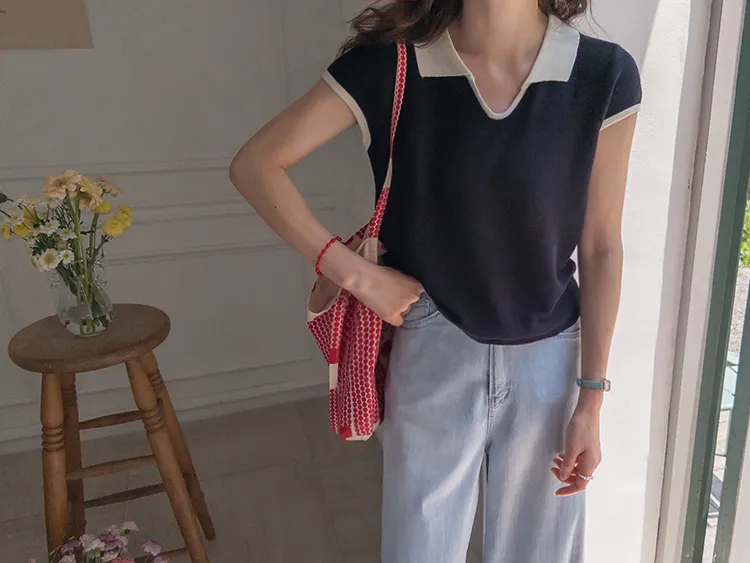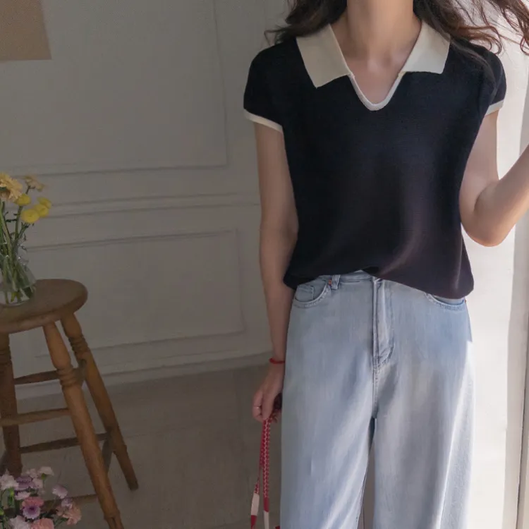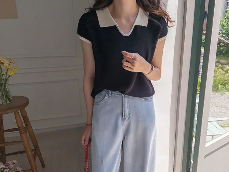 感性配色翻領夏日輕款蓋袖針織上衣