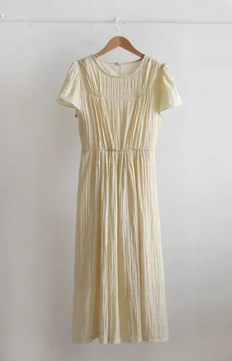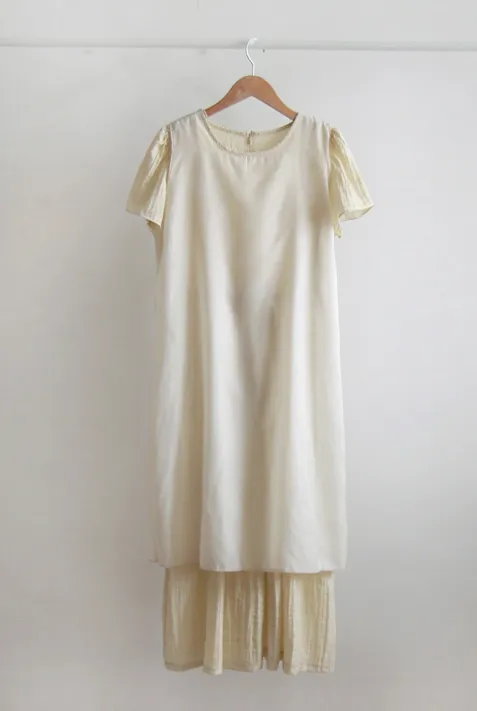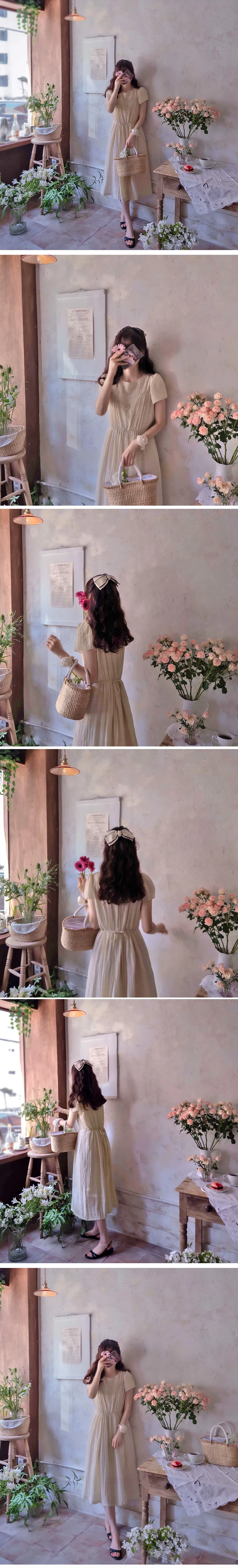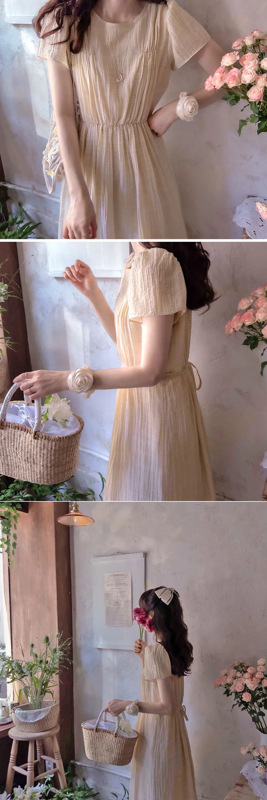 [天絲39%、尼龍22%、人造絲39%的涼爽夏季面料,略帶褶皺感] [滌綸襯裡] [彈性腰帶] [胸前部分帶狀處理] [袖口線條也很漂亮] [腰部採用綁帶設計,舒適可愛] [腰帶上繫上蝴蝶結綁帶,時尚貼身]