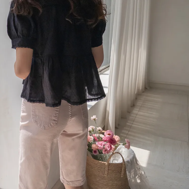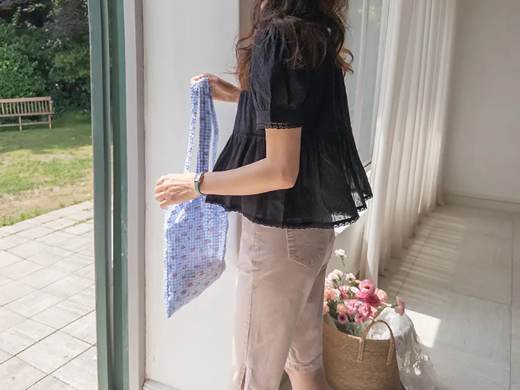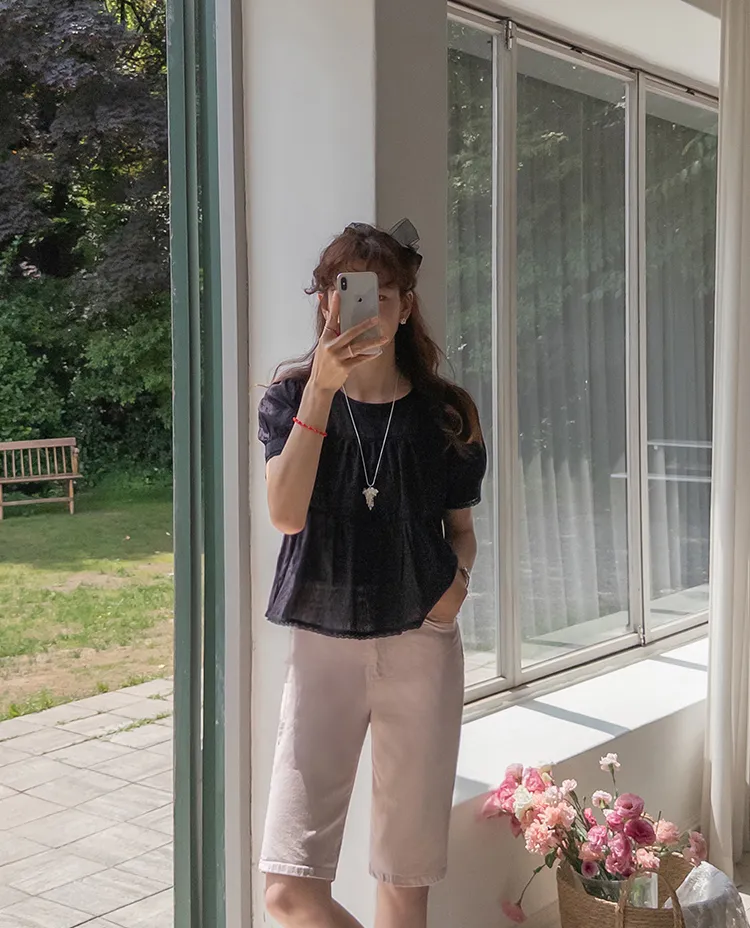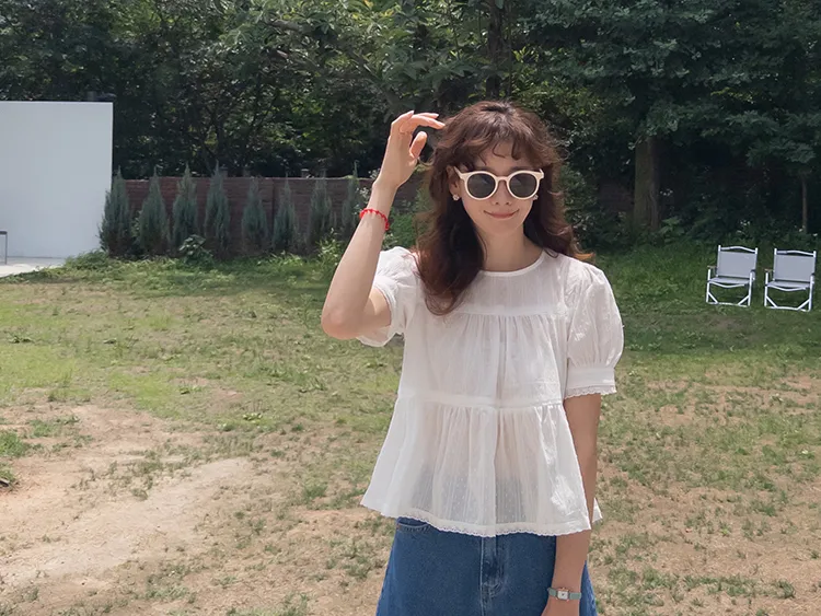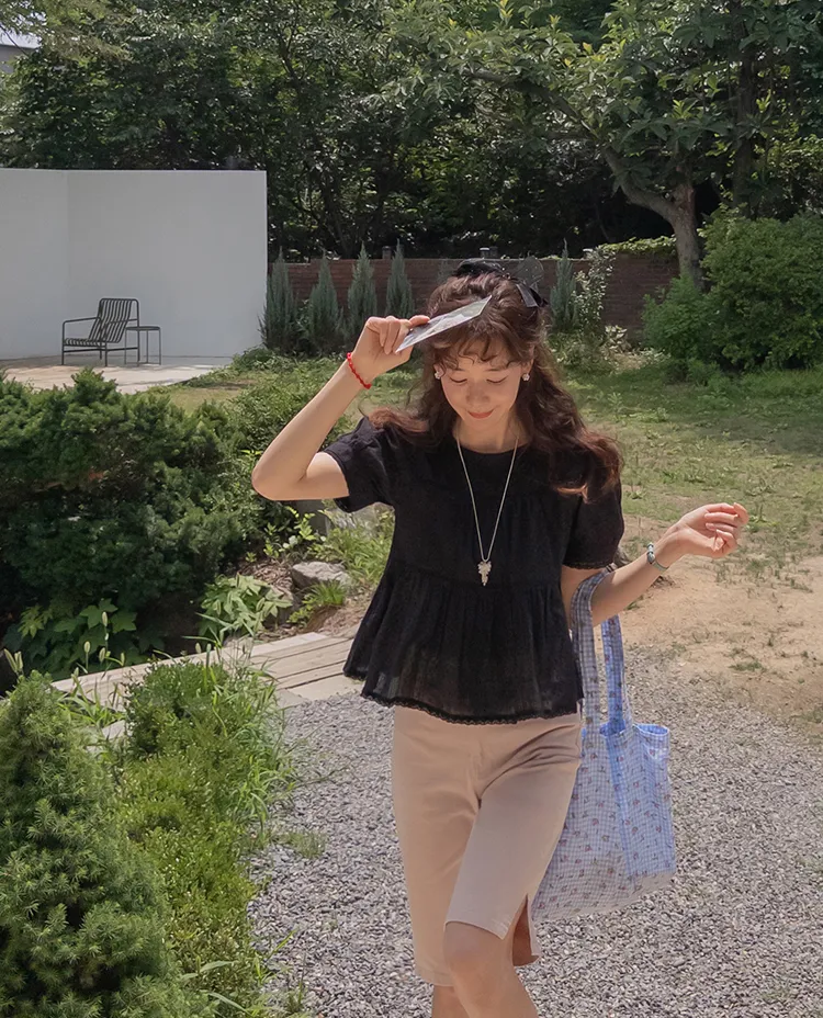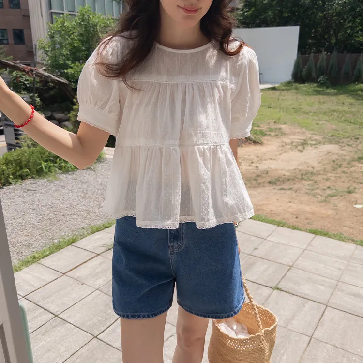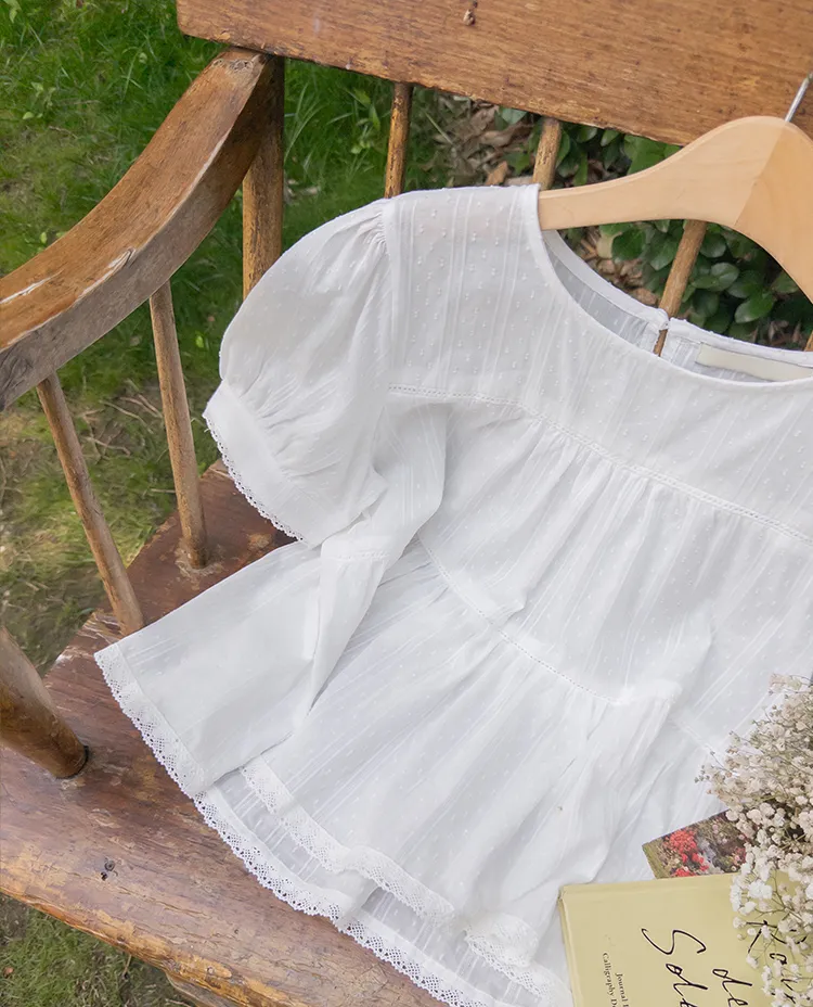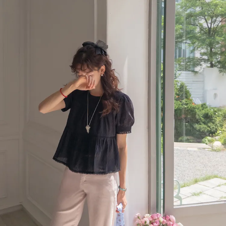 【精緻蕾絲刺繡上衣】【浪漫的輪廓♥】【搖曳~搖曳~下擺的褶皺設計很美】【適合清新夏日的可愛氛圍】