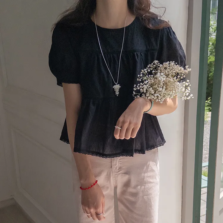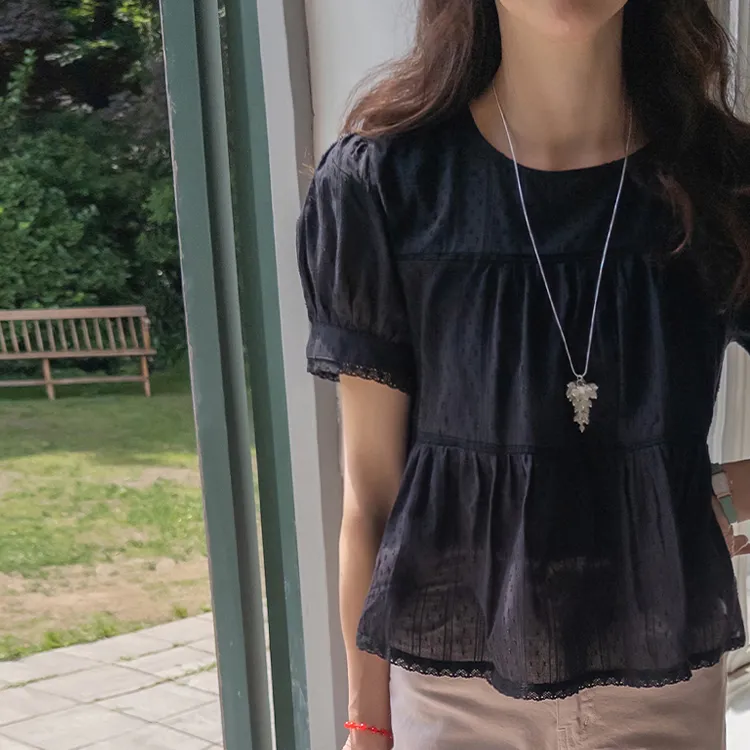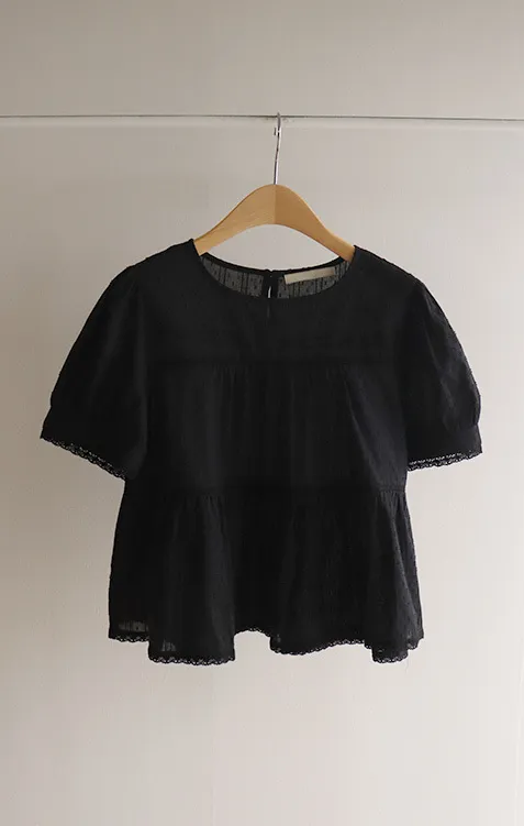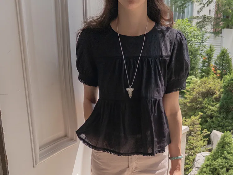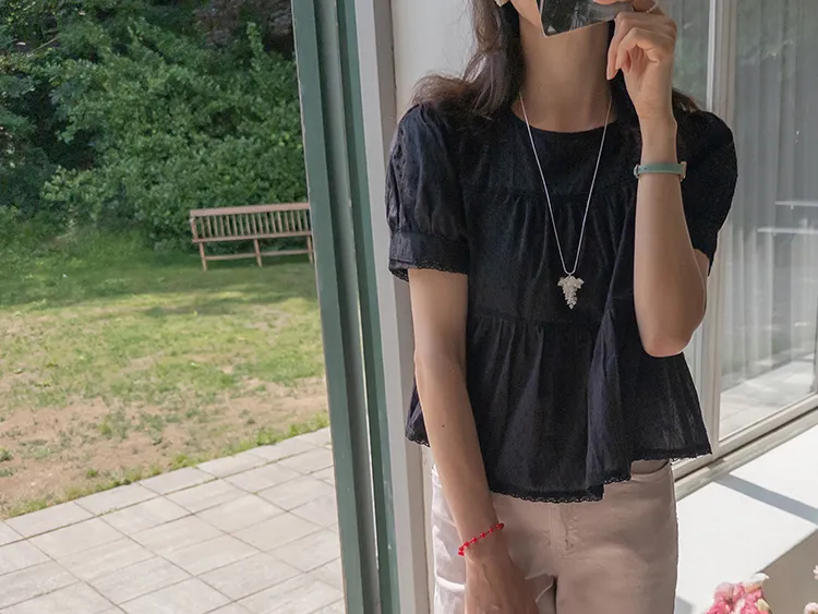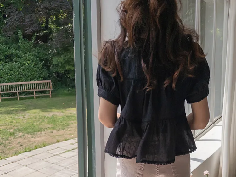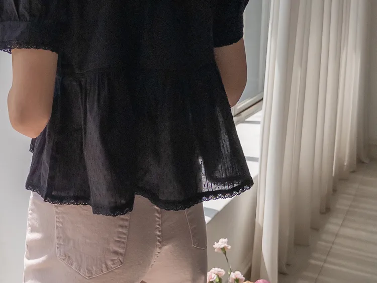 清新夏日氛圍蕾絲刺繡浪漫輪廓上衣 現貨黑