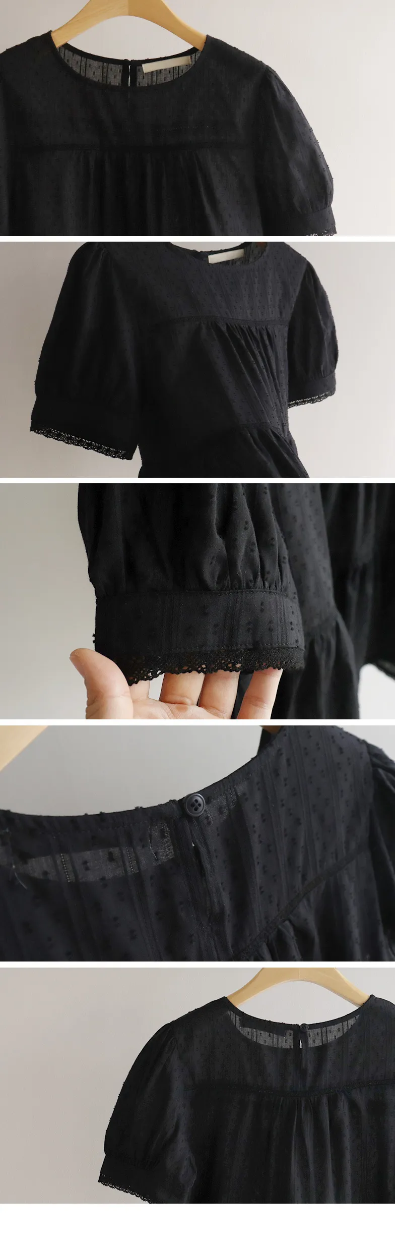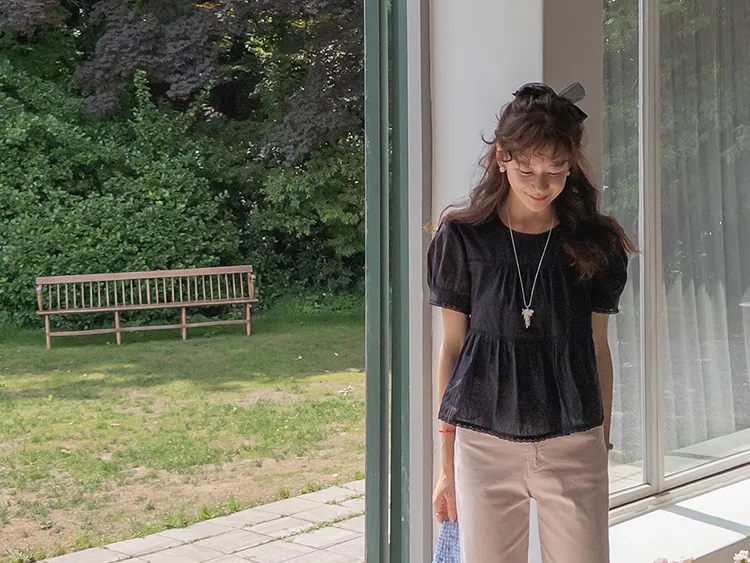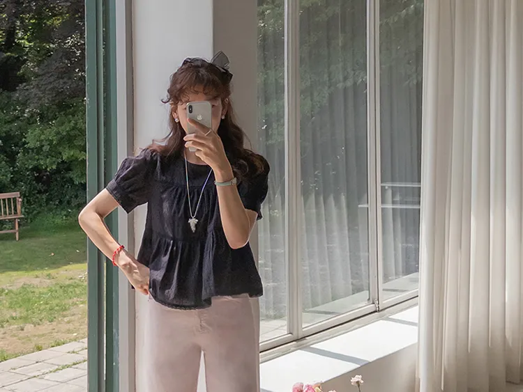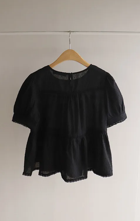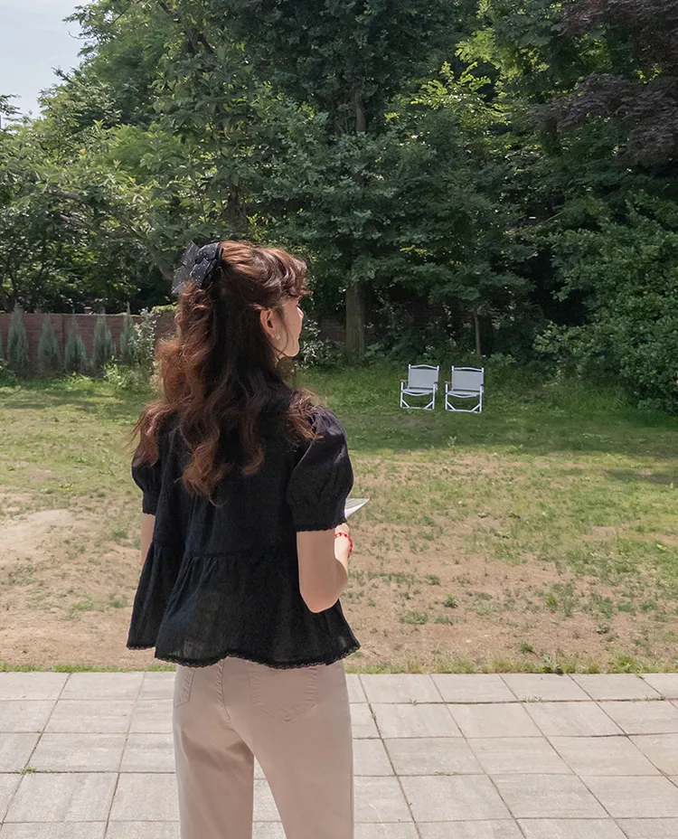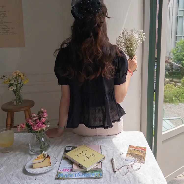 清新夏日氛圍蕾絲刺繡浪漫輪廓上衣 現貨黑
