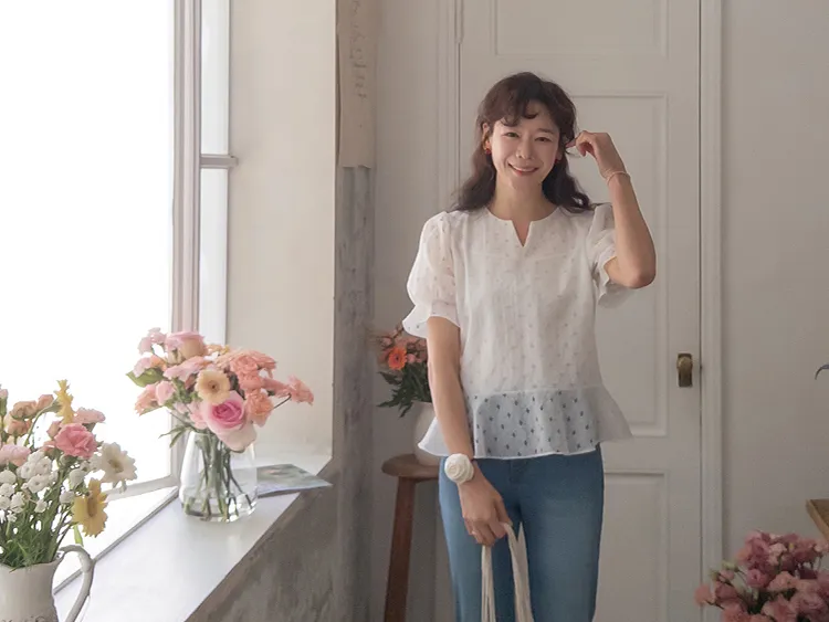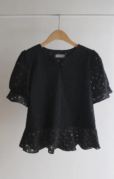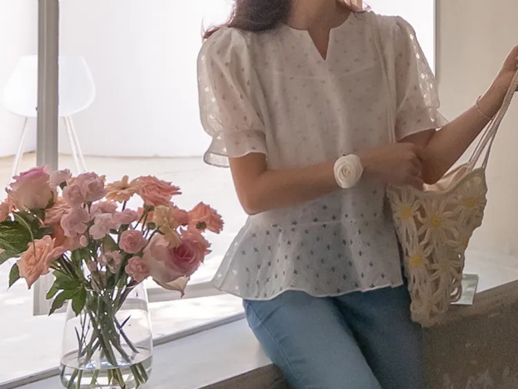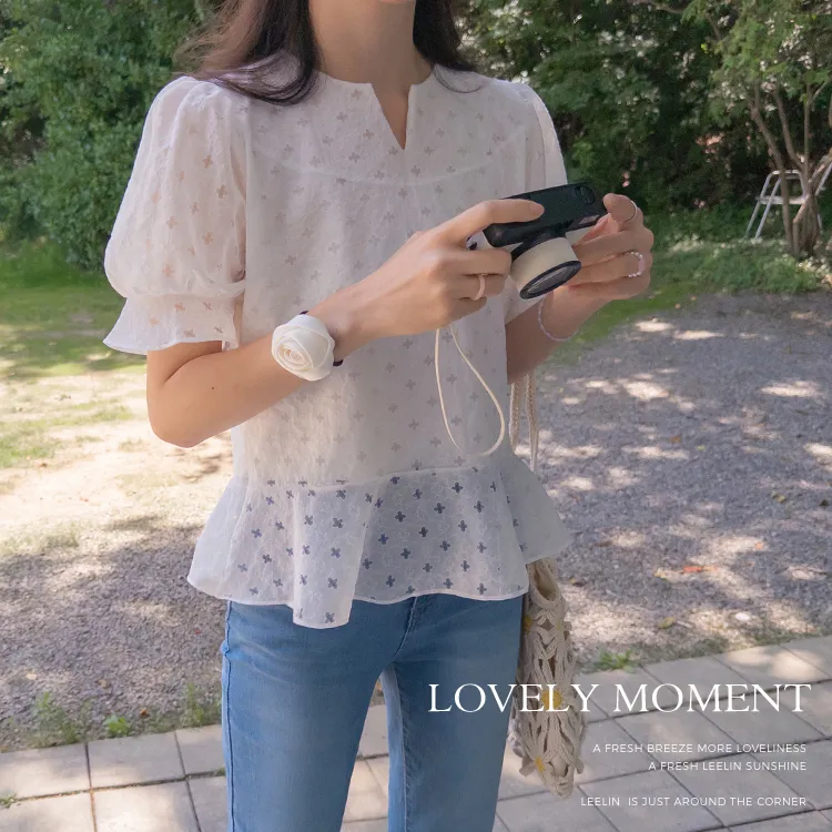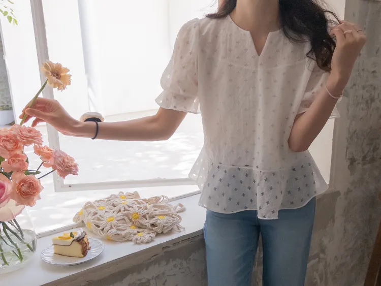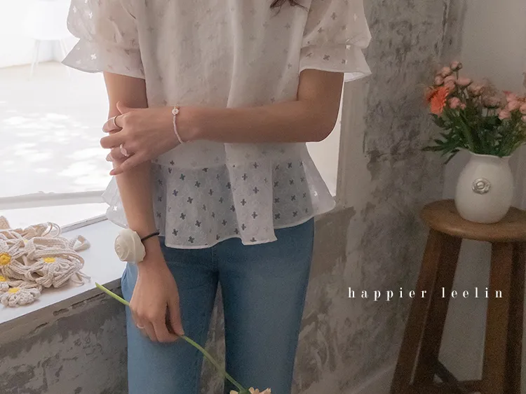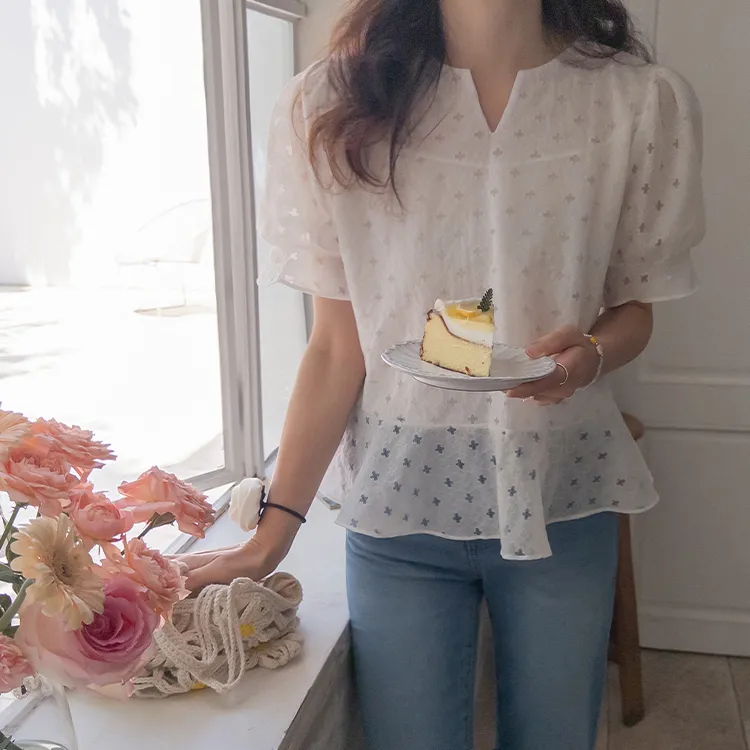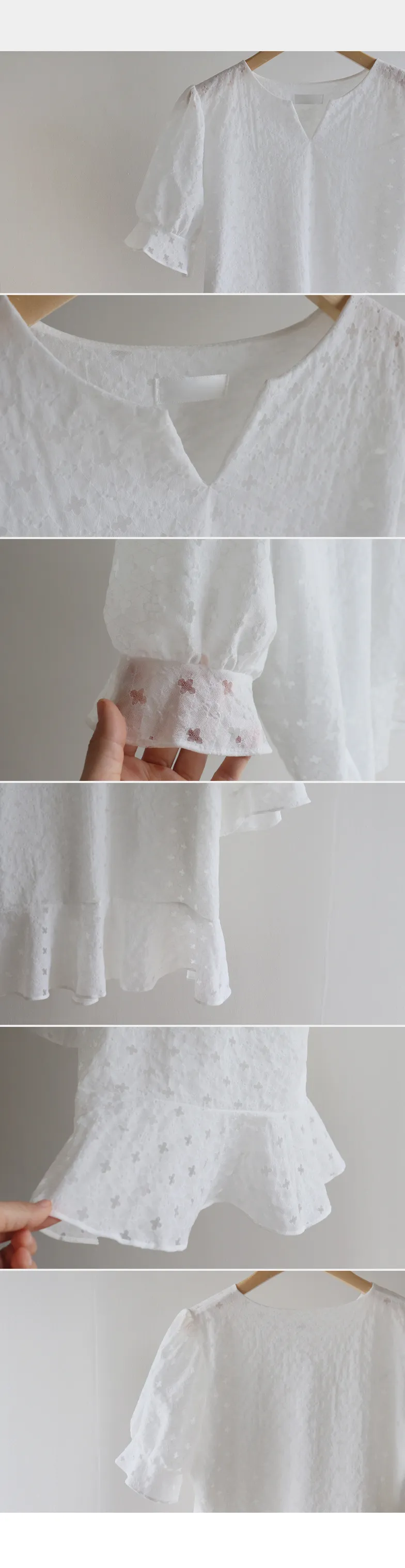 飄逸A字廓形點綴透膚三葉草圖案修身上衣
