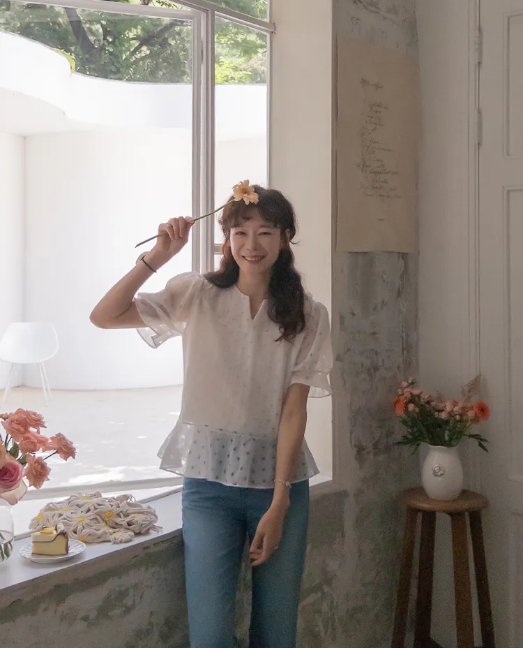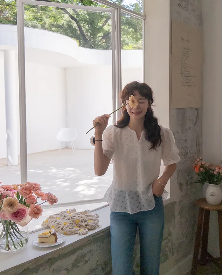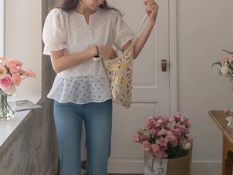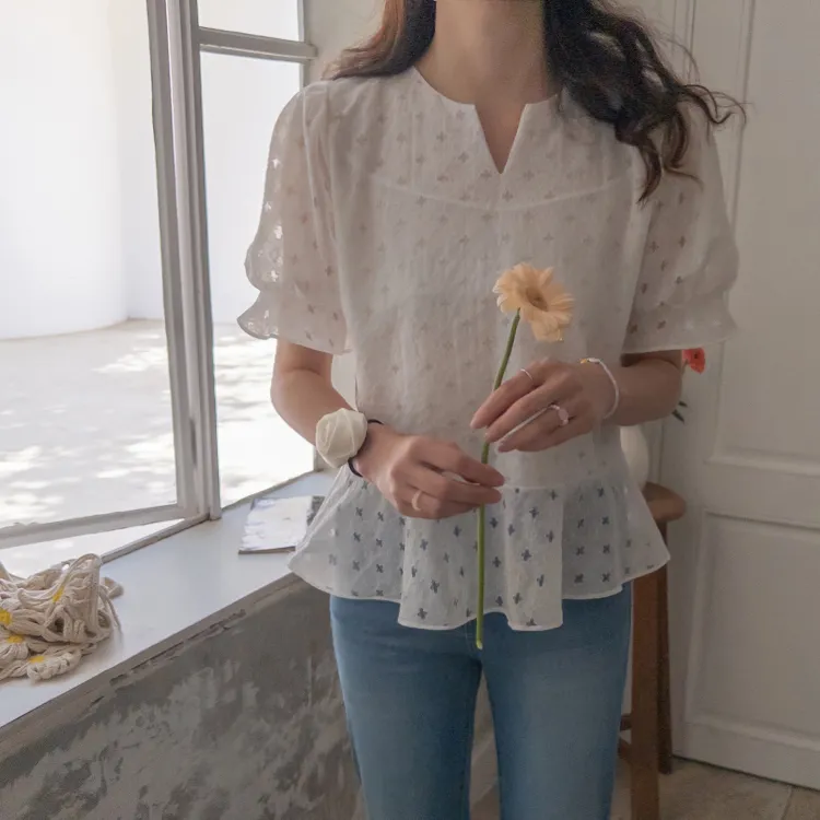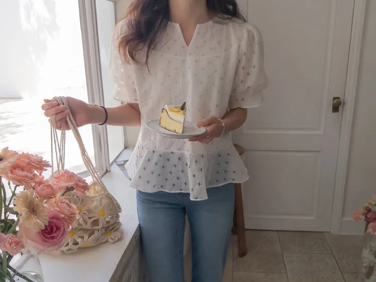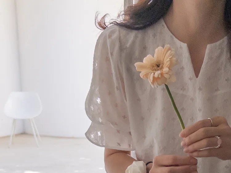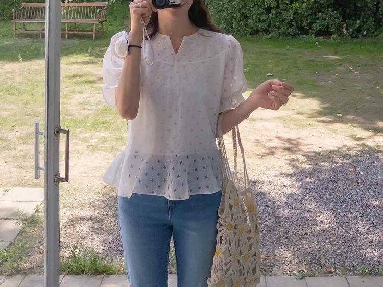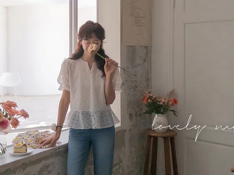 飄逸A字廓形點綴透膚三葉草圖案修身上衣