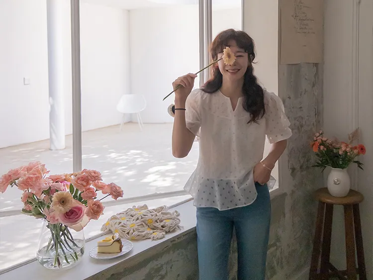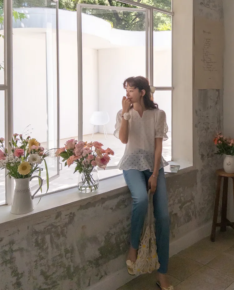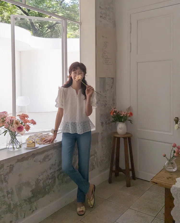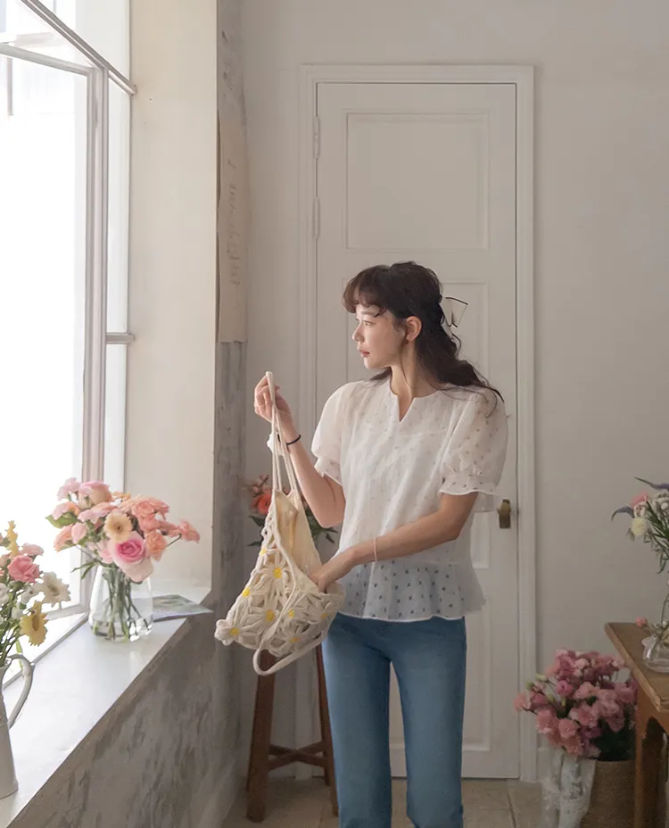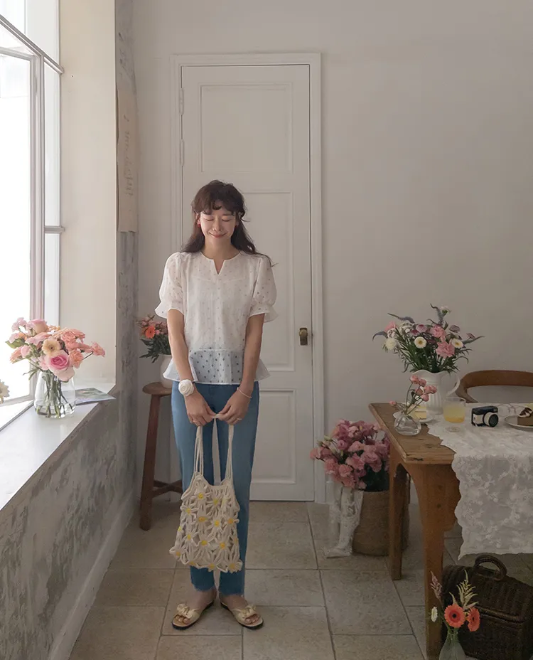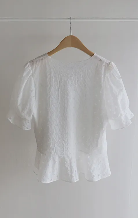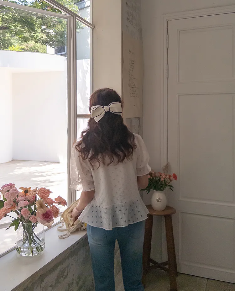飄逸A字廓形點綴透膚三葉草圖案修身上衣