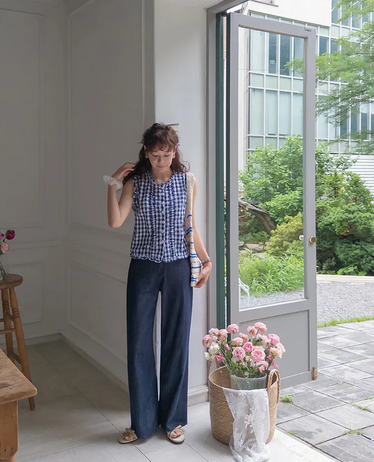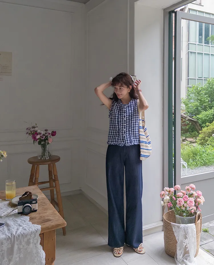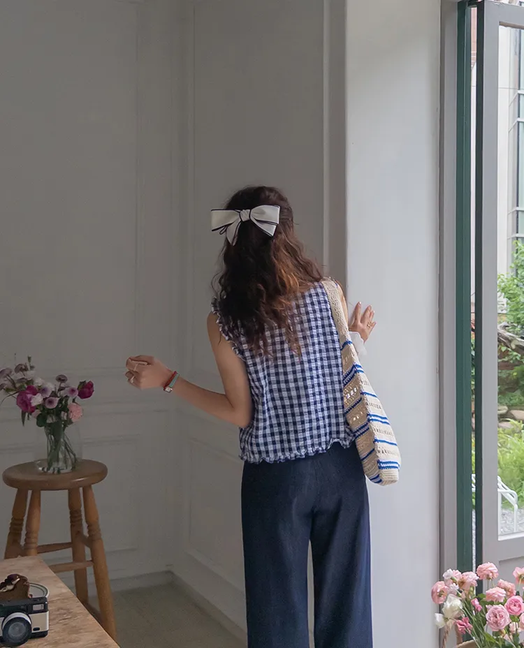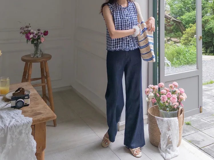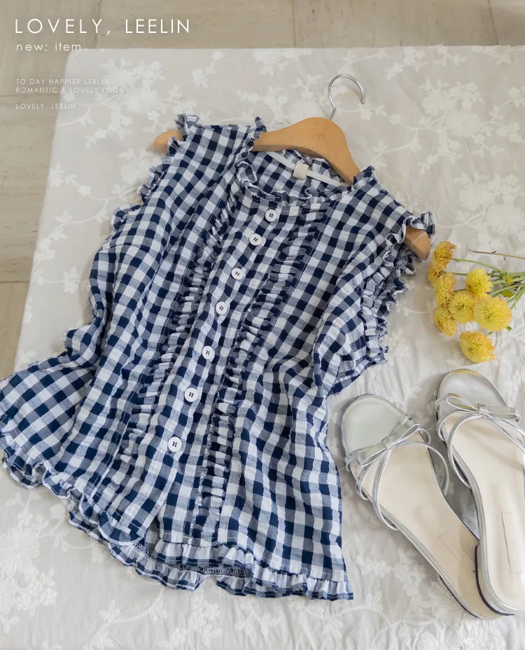 【充滿可愛氣息的荷葉邊無袖上衣~✿】 【帥氣的高腰格紋♥】 【不用擔心起皺】 【作為吸睛的單品】