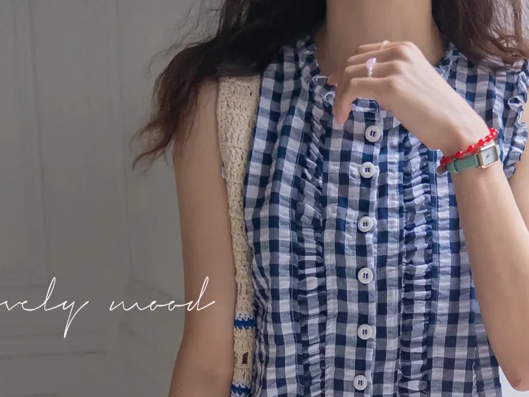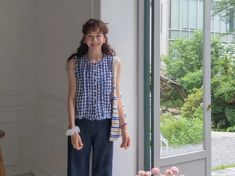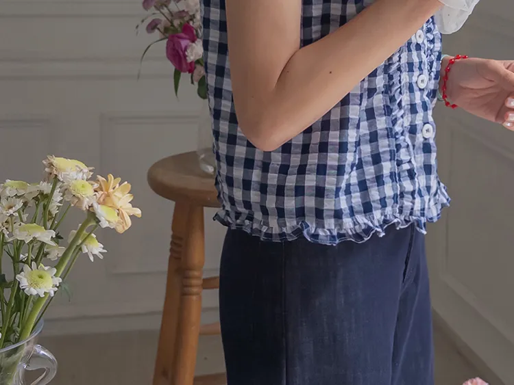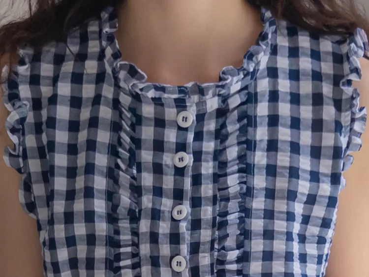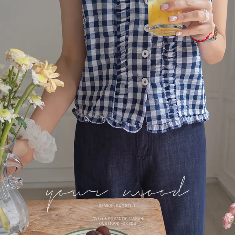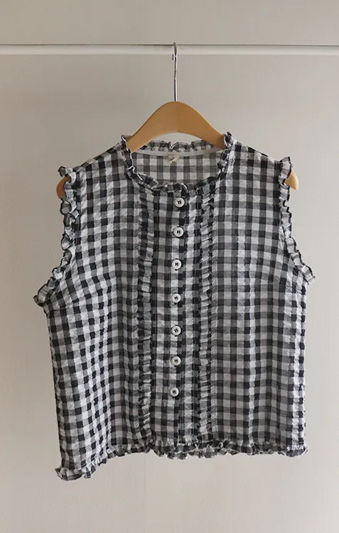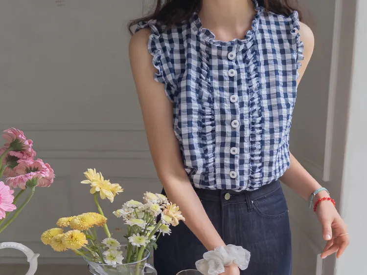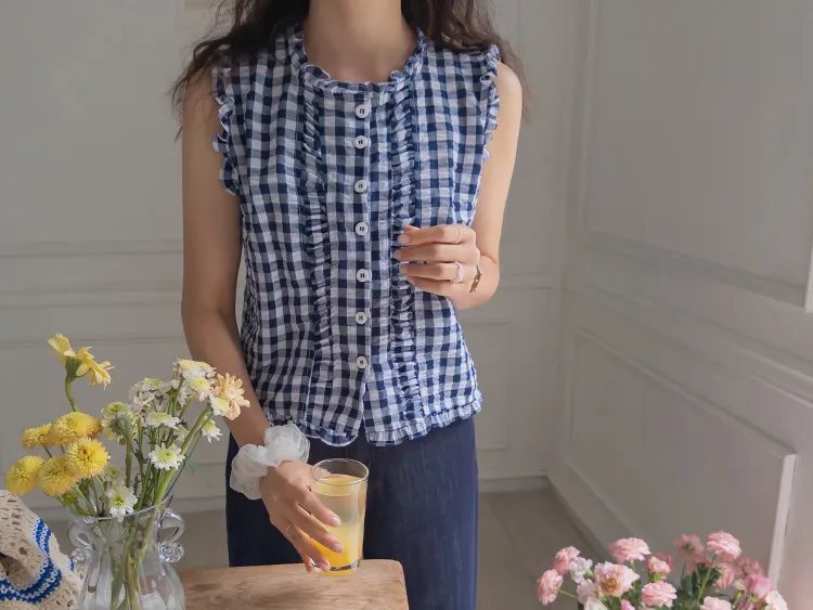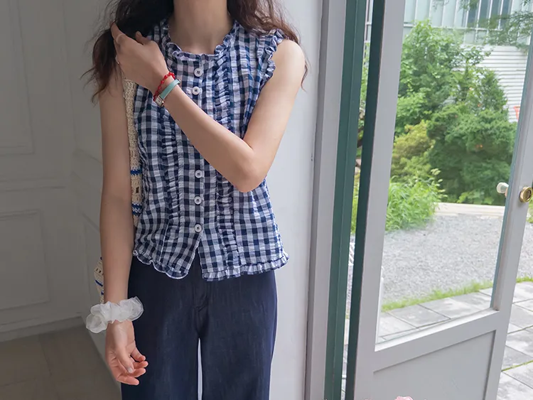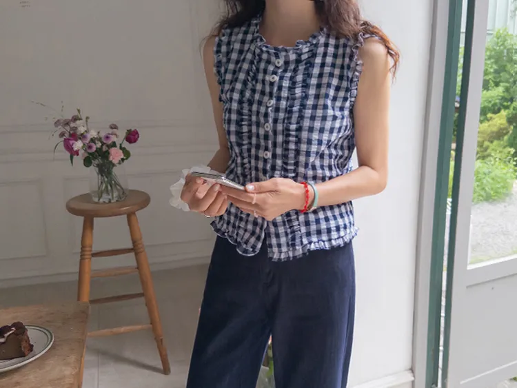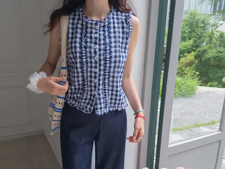 活潑氛圍摺邊設計格紋無袖排扣上衣