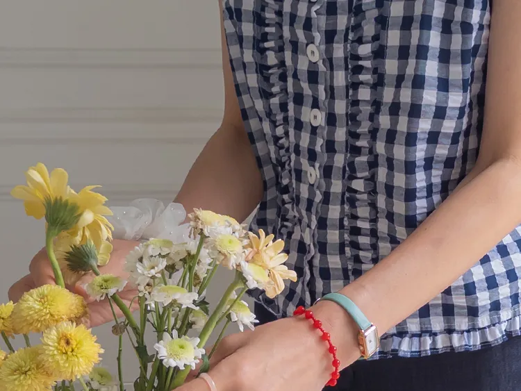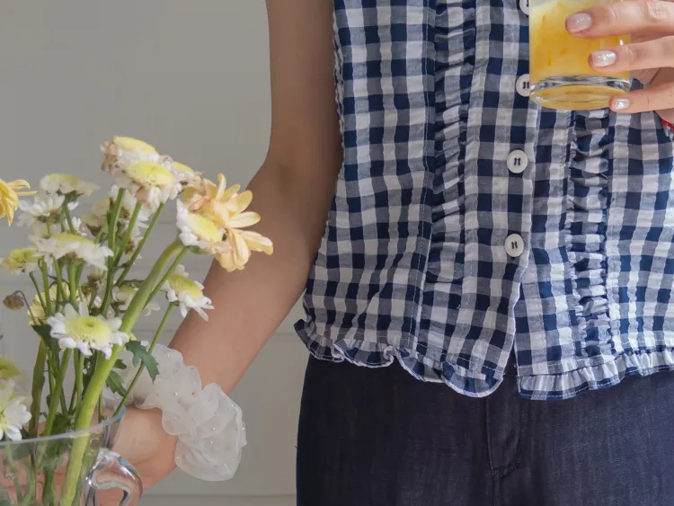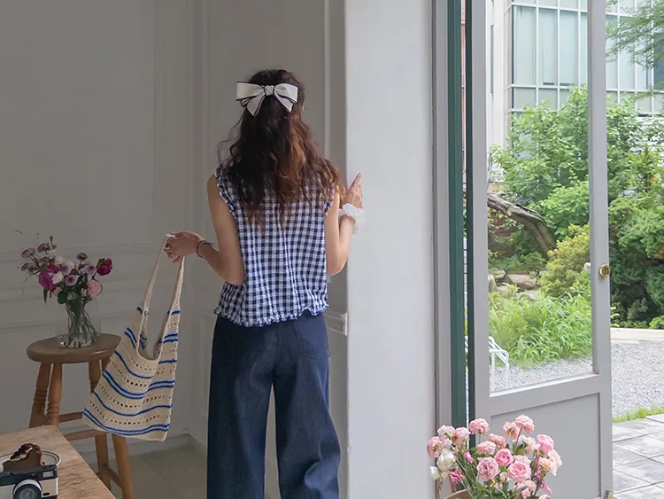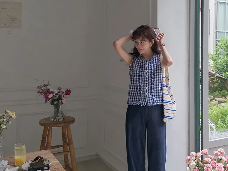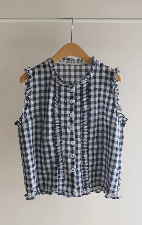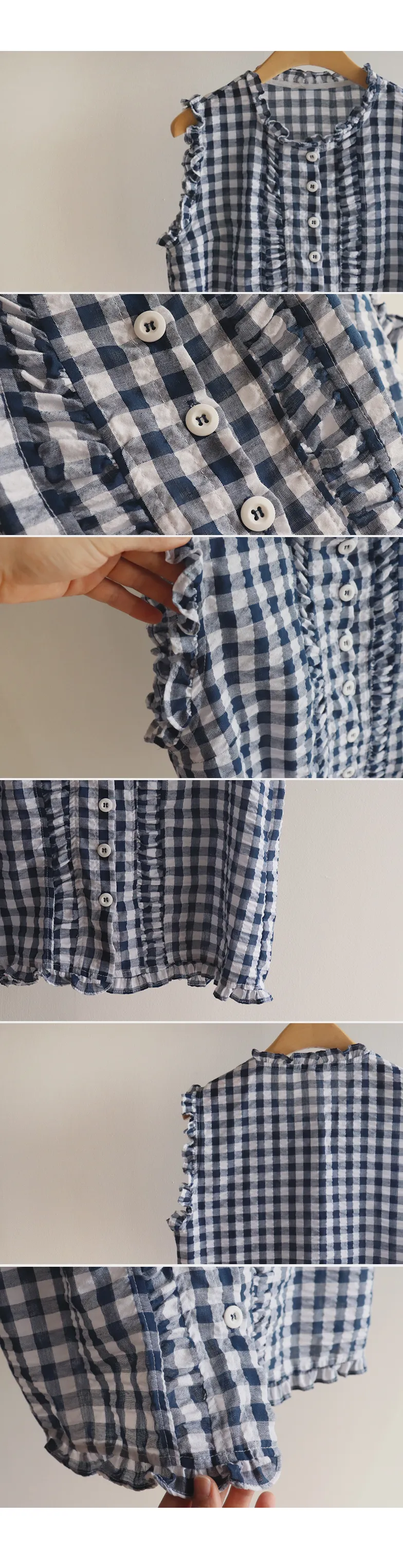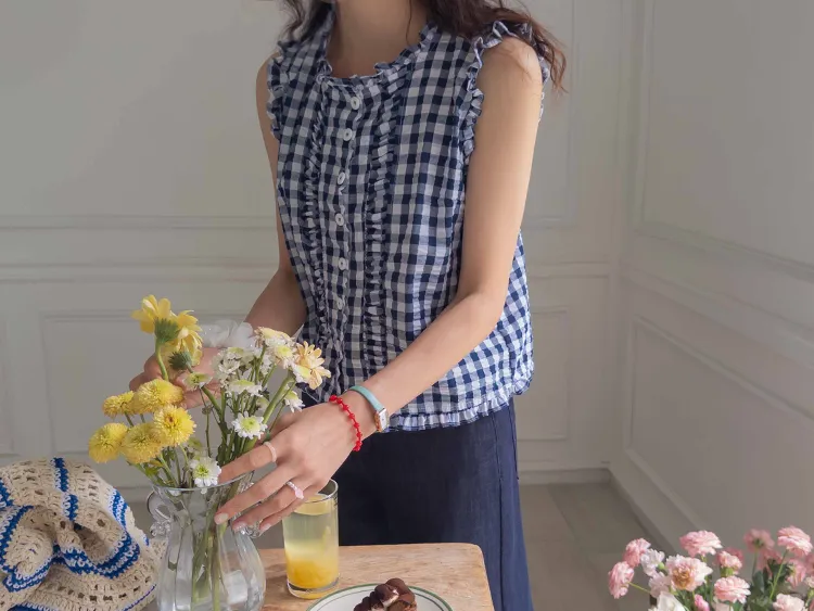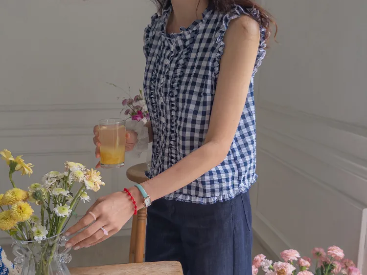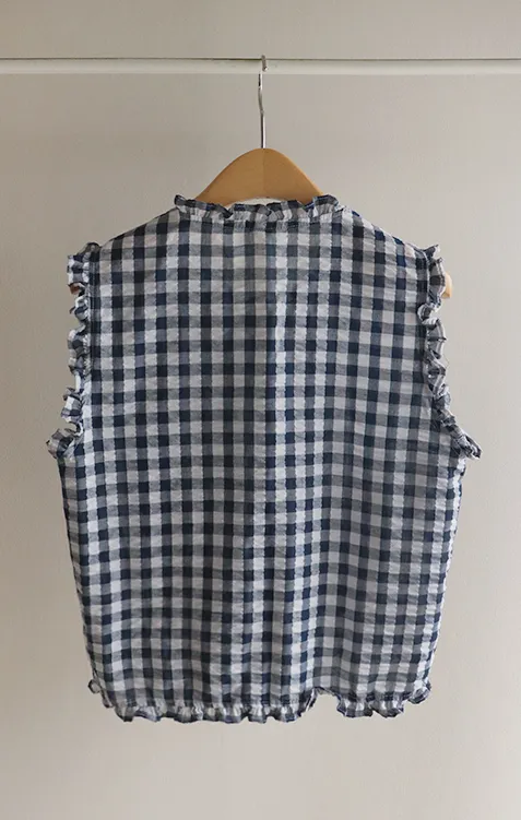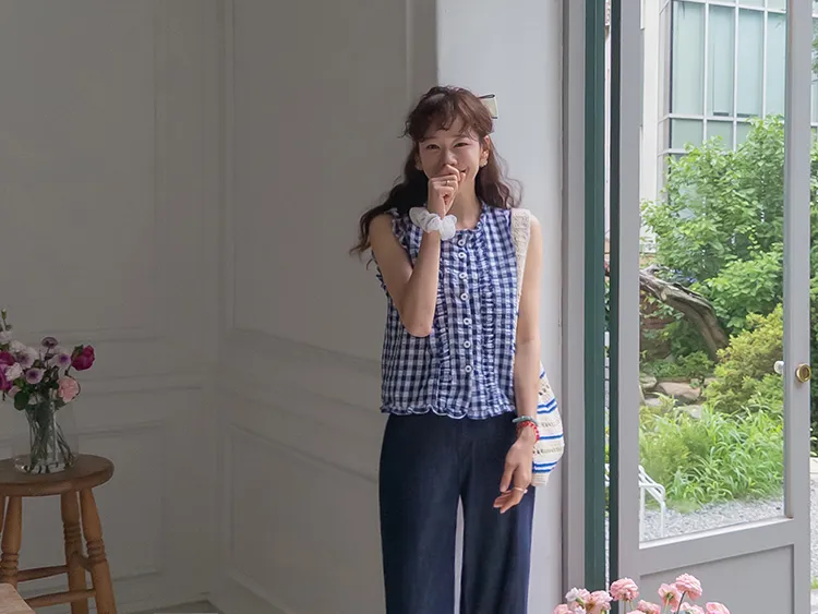 活潑氛圍摺邊設計格紋無袖排扣上衣