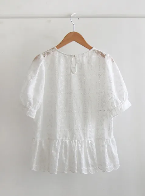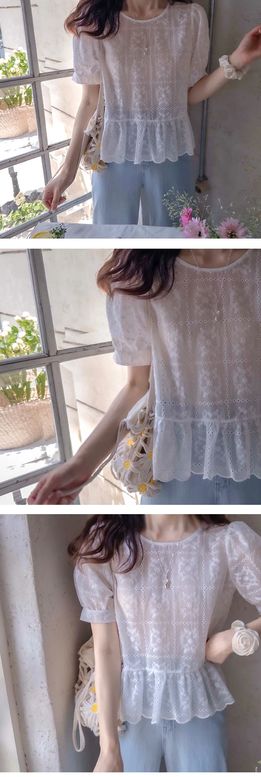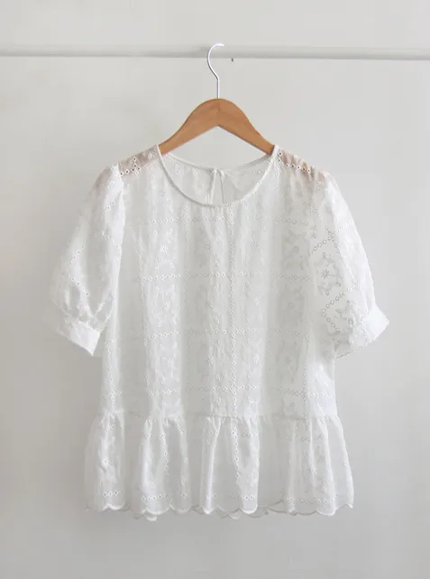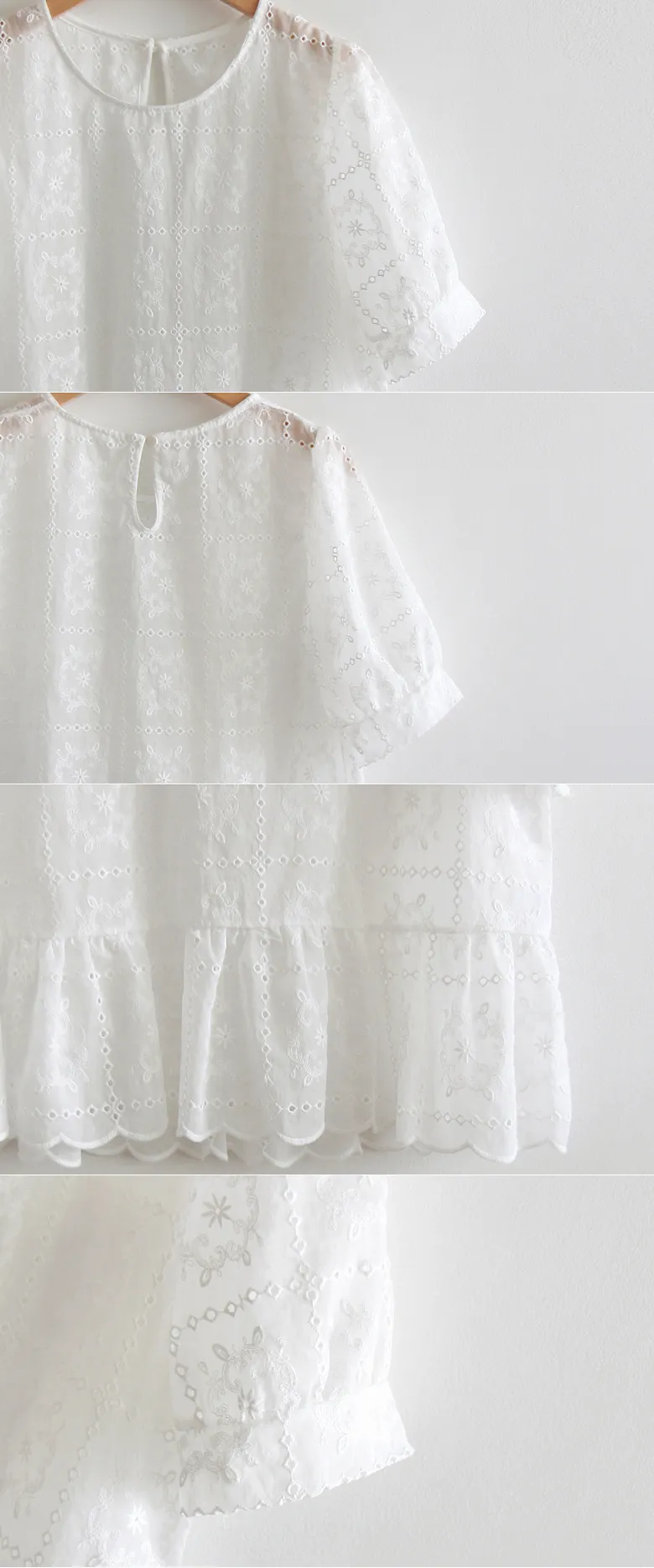 【柔軟輕盈的蕾絲上衣】 【夏季的精緻修身上衣】 【鏤空和花朵刺繡的設計非常可愛】 【袖子和下擺的波浪紋非常漂亮】 【夏季清涼優雅的刺繡上衣】