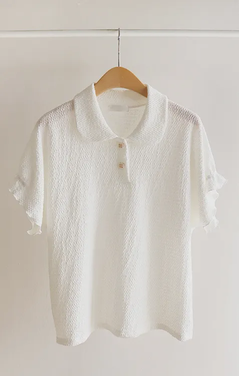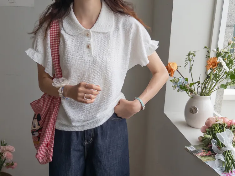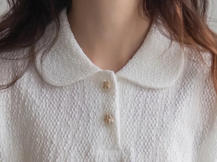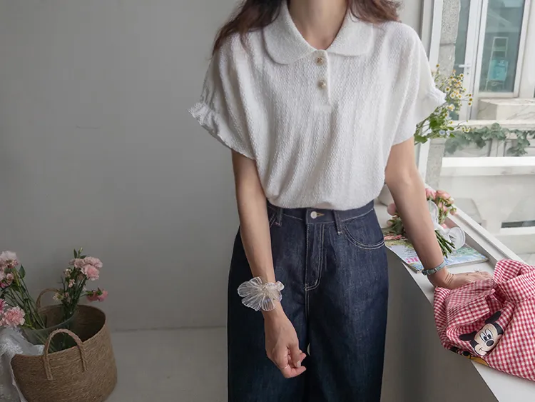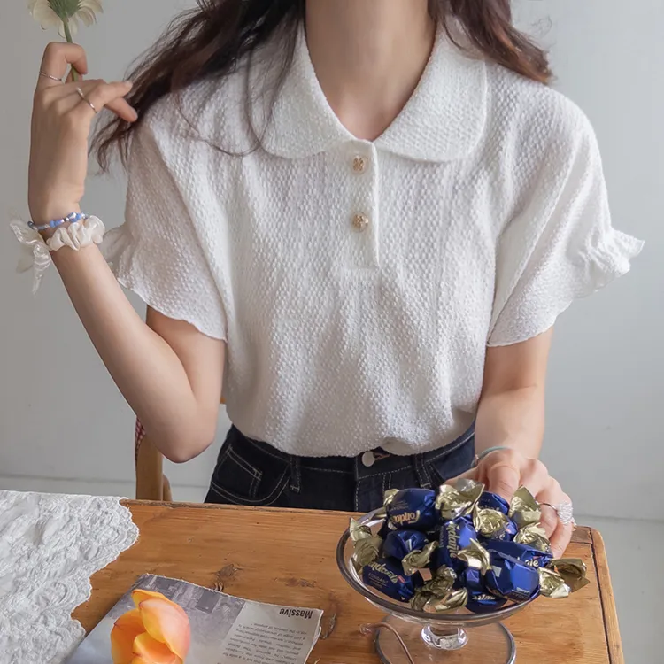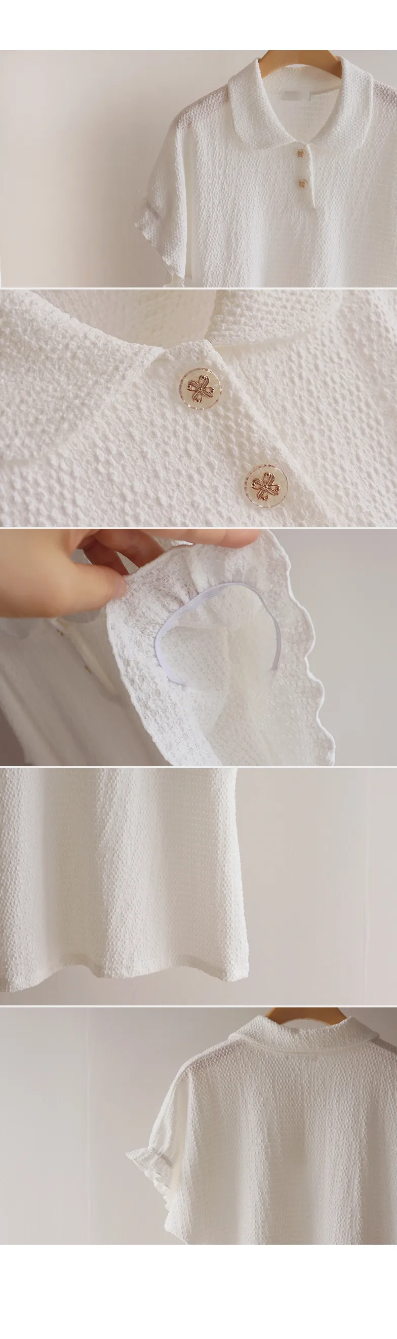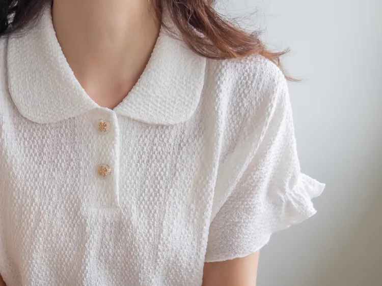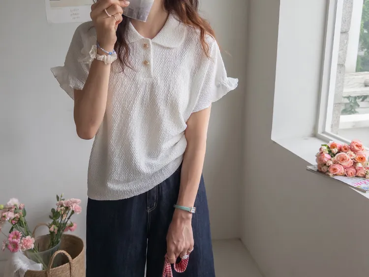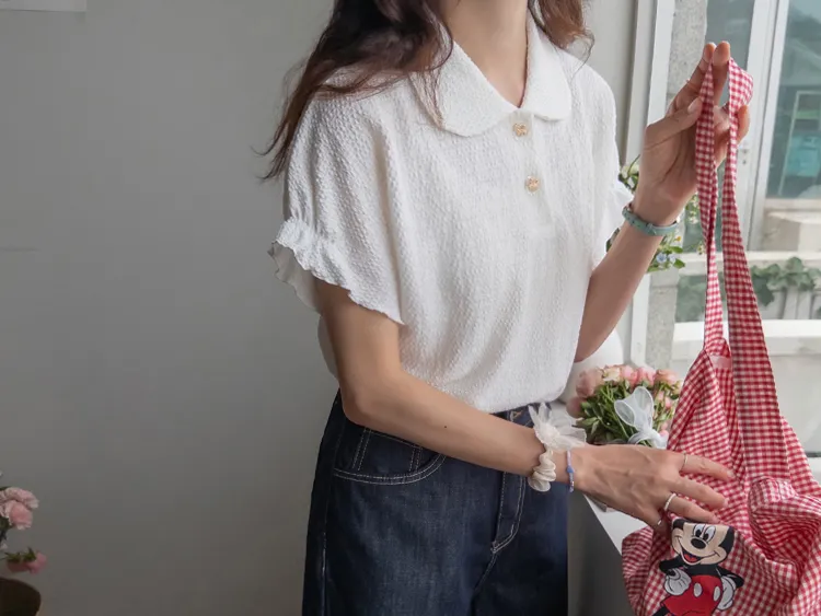 清新皺摺袖末摺邊彈性帶精緻金色鈕扣上衣