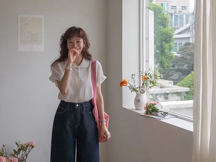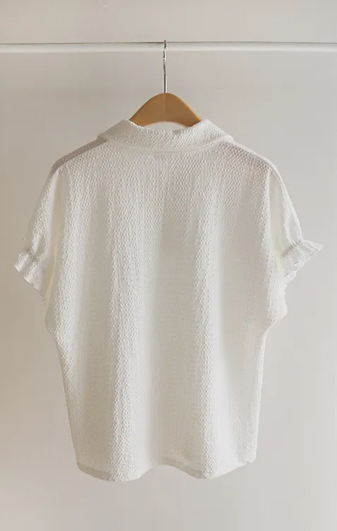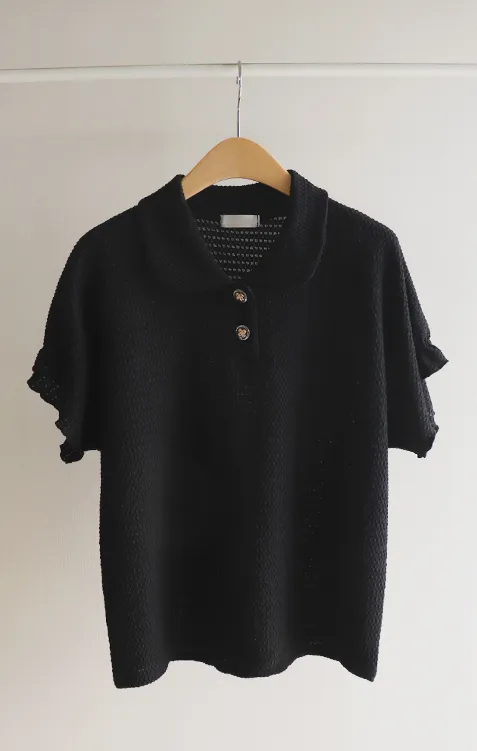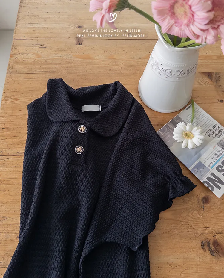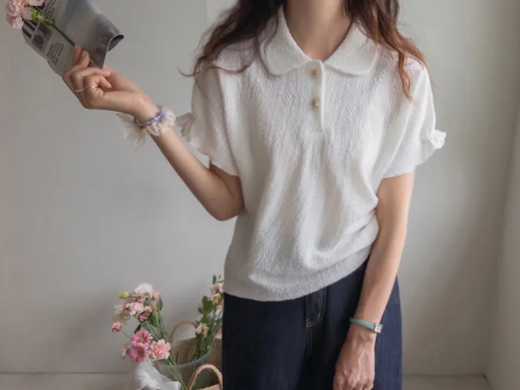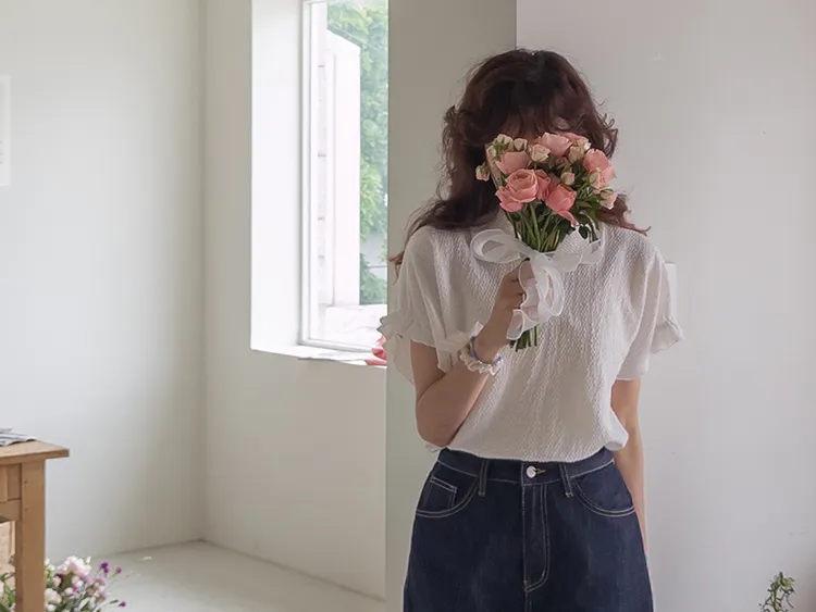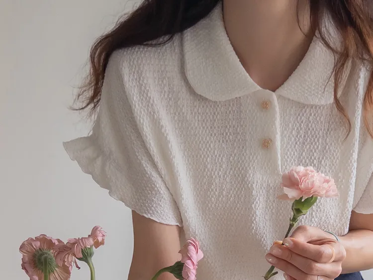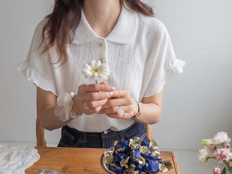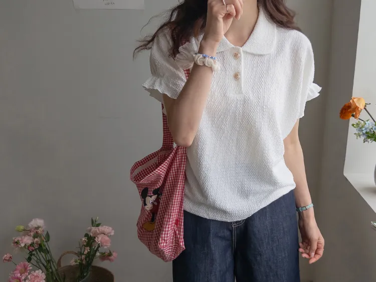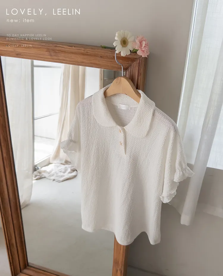清新皺摺袖末摺邊彈性帶精緻金色鈕扣上衣