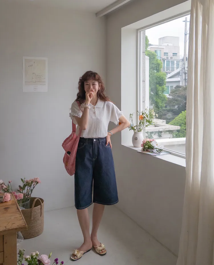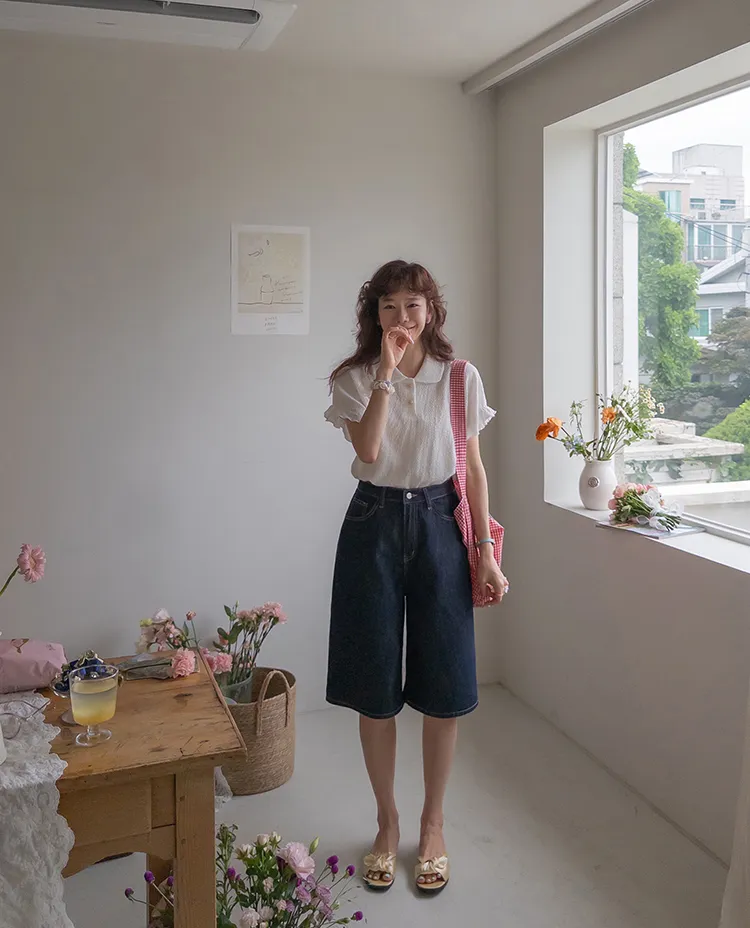 時尚風格穿搭半A字剪裁寬廓牛仔短褲