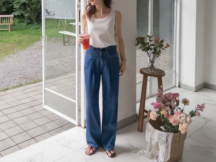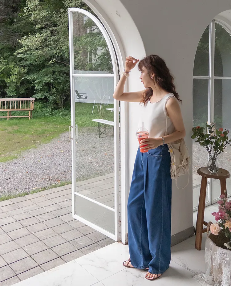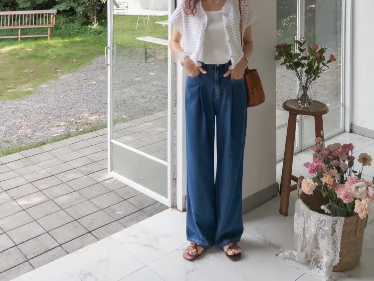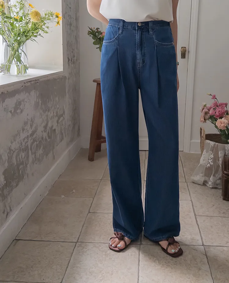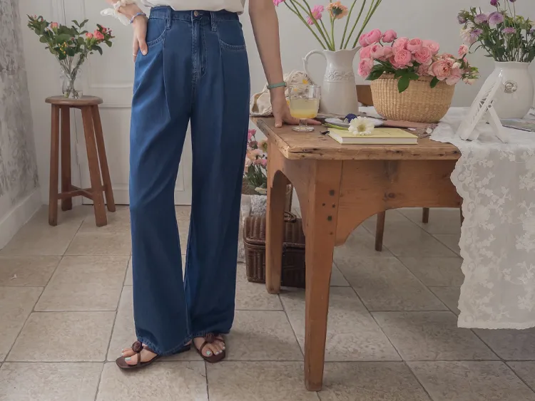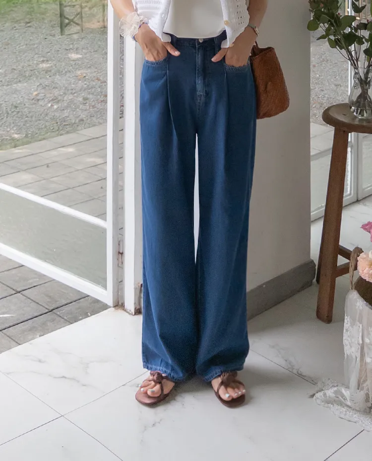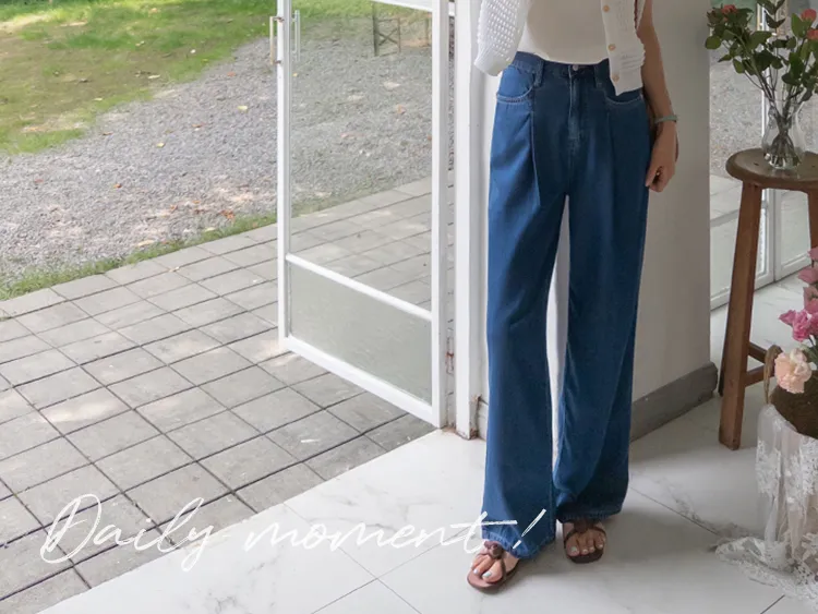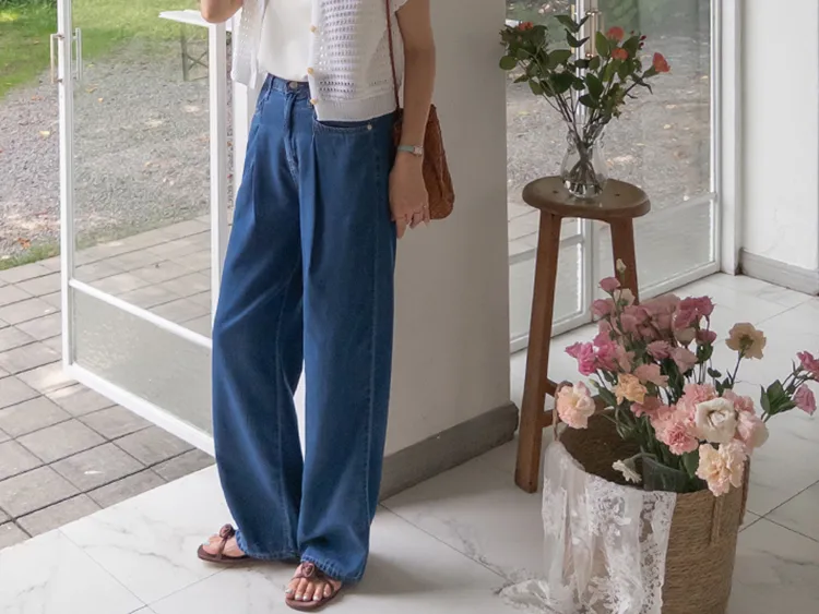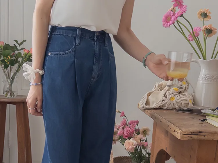獨特氣息腰部針摺線條柔軟寬版牛仔褲