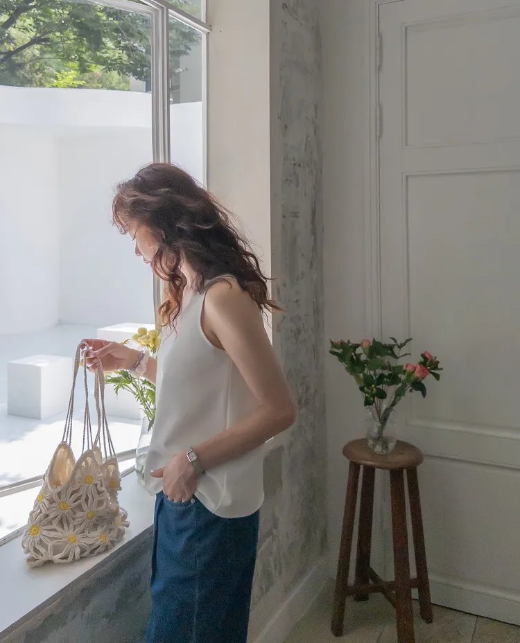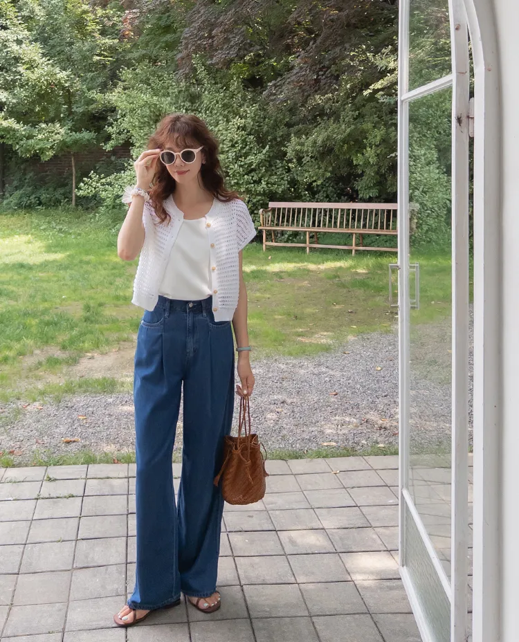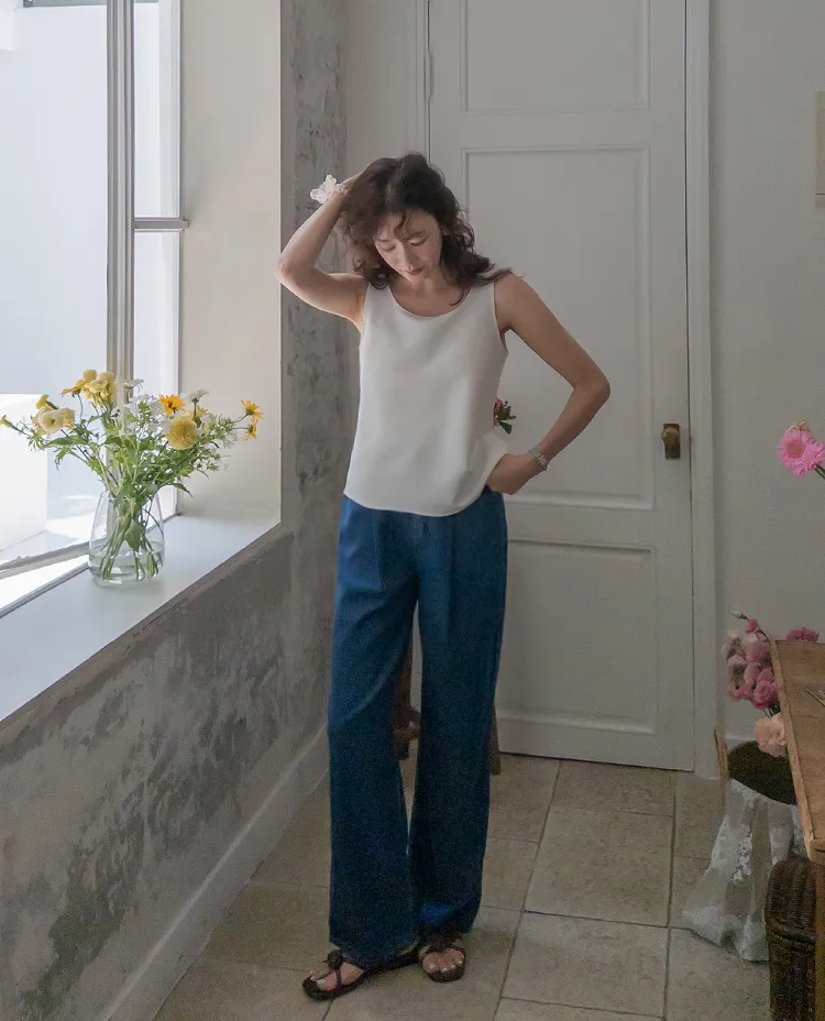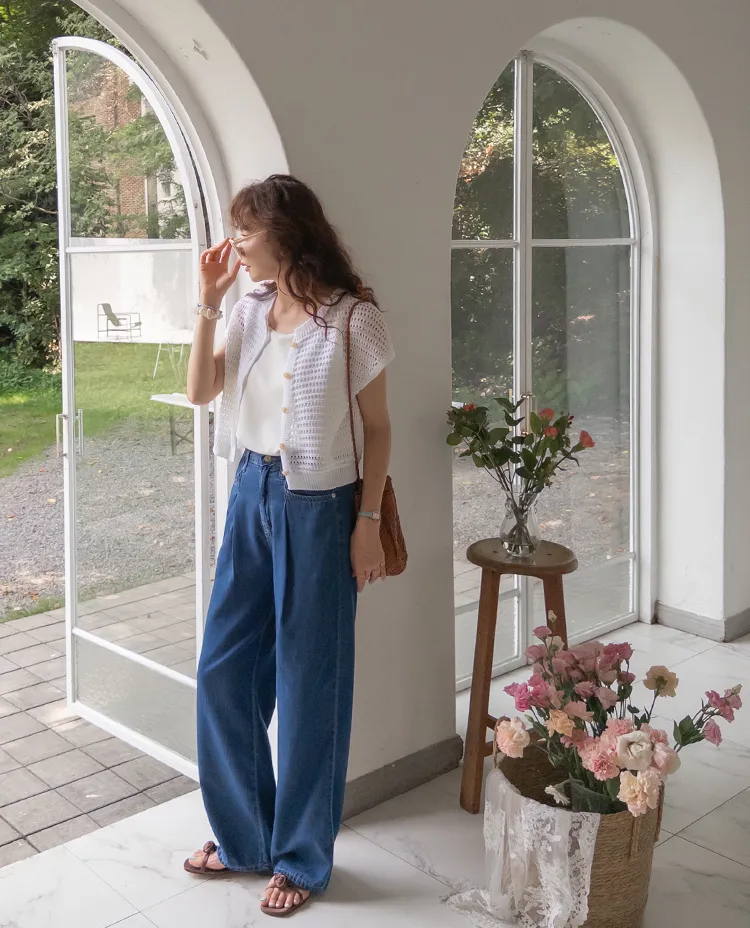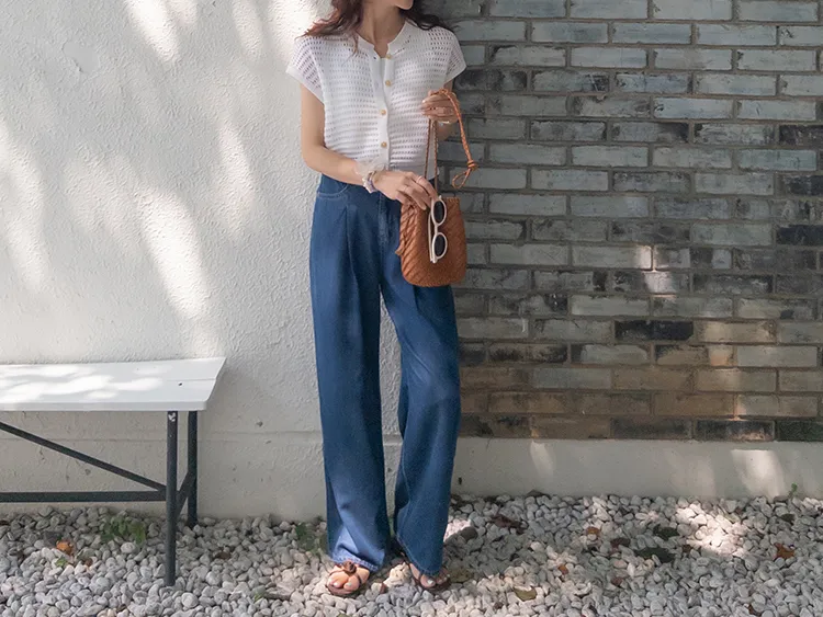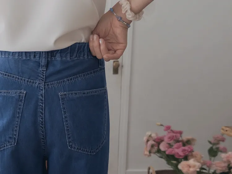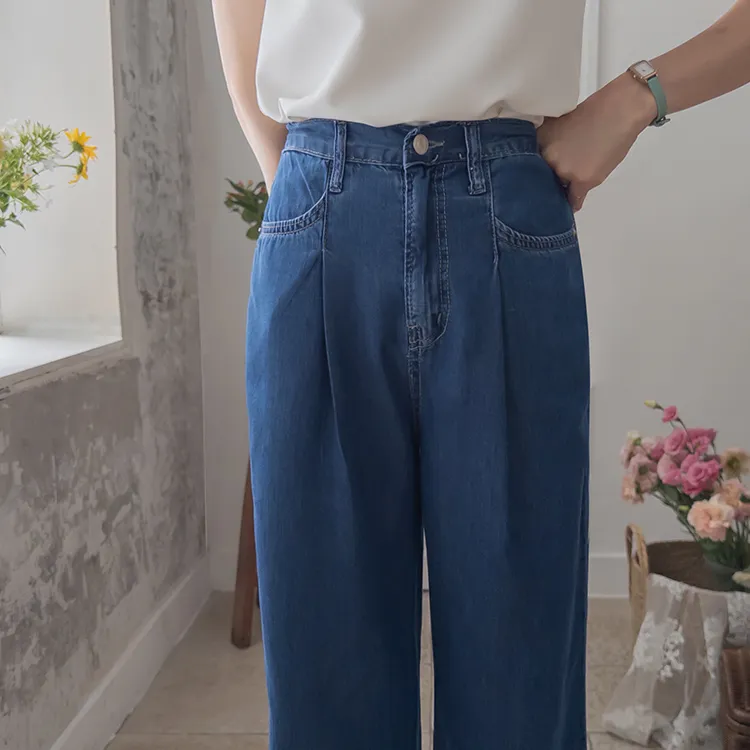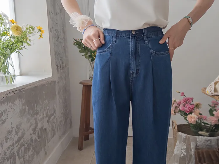 獨特氣息腰部針摺線條柔軟寬版牛仔褲