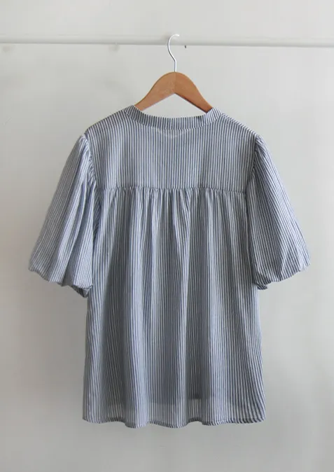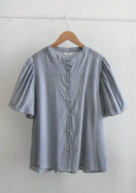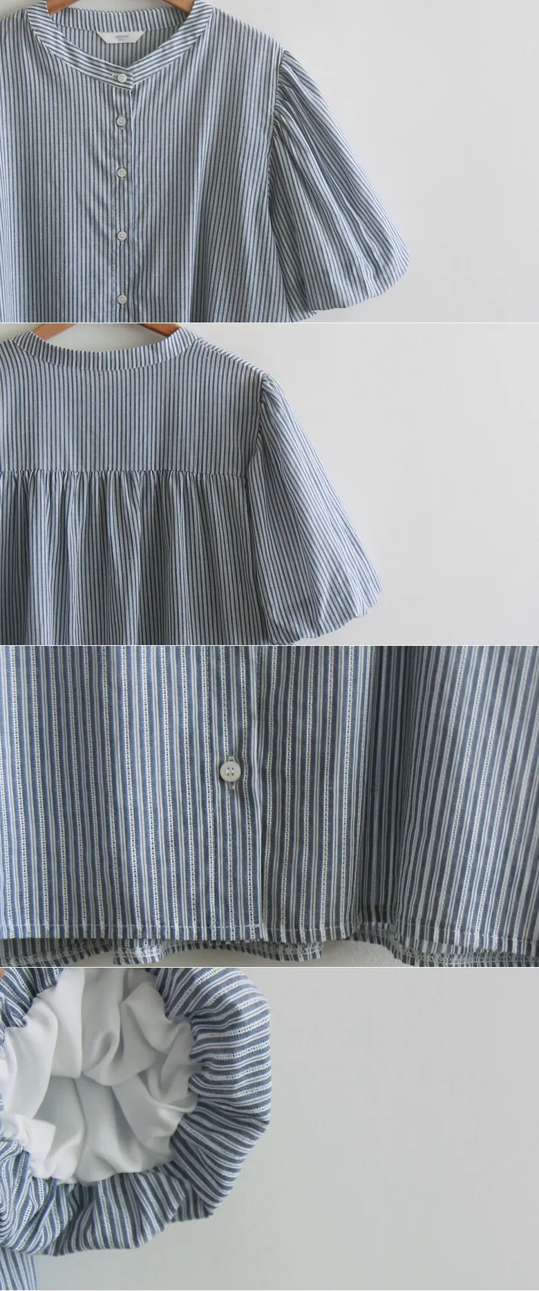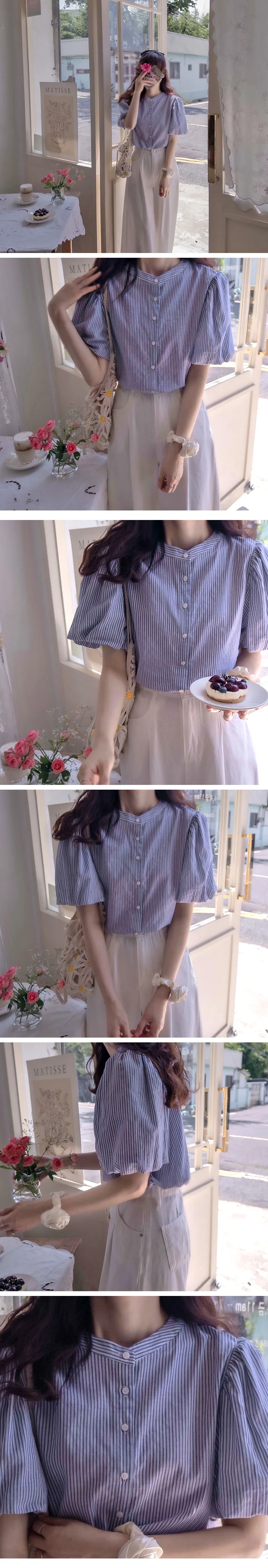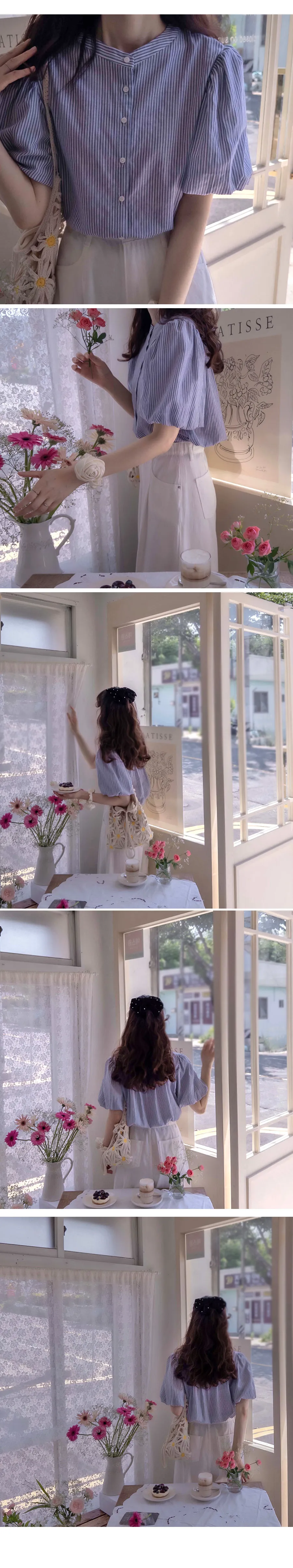 優雅條紋蓬鬆泡泡袖排扣上衣